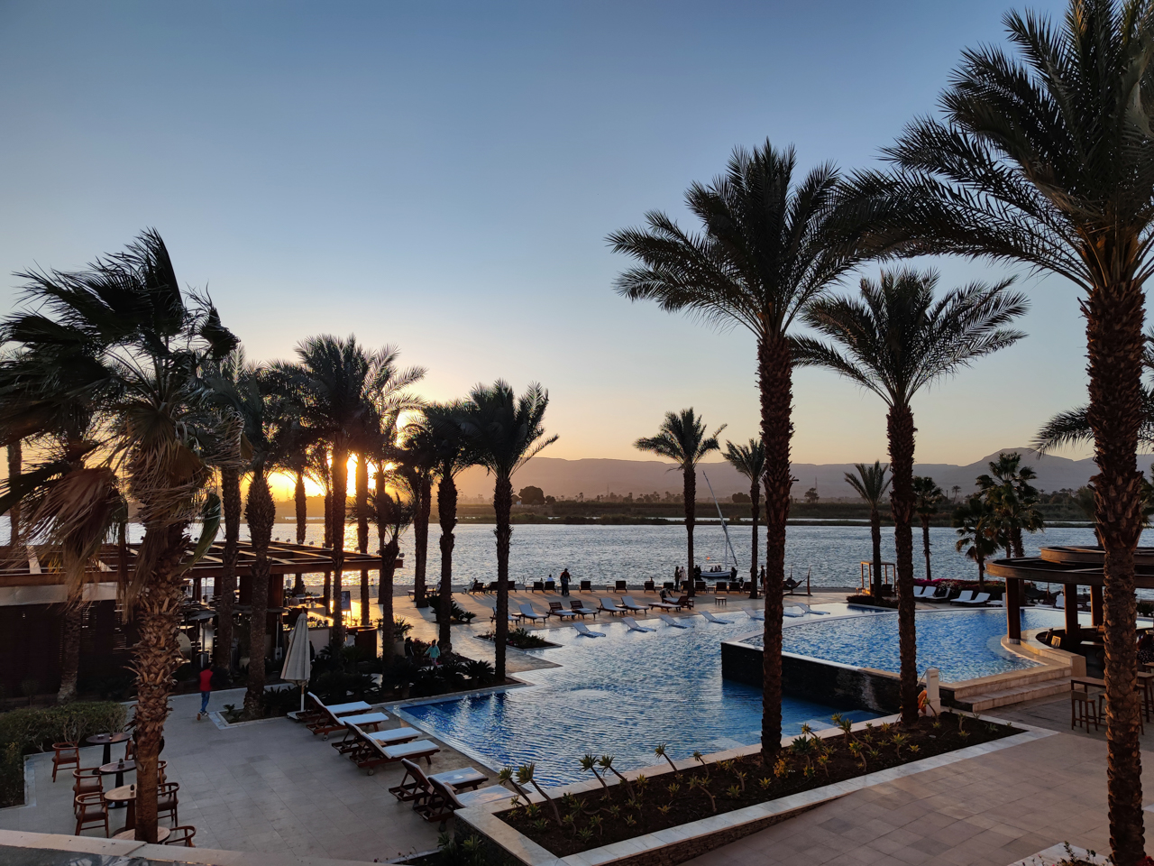On longe de nouveau la côte jusqu’à Safaga, entre le vide du désert et la mer aux différents bleus. Notre chauffeur nous montre de beaux hotels qui donnent sur des baies fantastiques et nous conseille pour un prochain séjour. N’ayant pas pu plonger à Elphinstone, on se dit que l’on va revenir un de ces jours sur une période plus favorable, comme la fin d’été par exemple. On s’arrête dans un café sous un pont à Safaga au croisement de la route côtière et de la route qui rejoint la vallée du Nil. Il y a beaucoup de camionneurs qui s’arrêtent ici pour faire une pause et prendre une chicha. Notre chauffeur nous propose d’en fumer une ensemble. Comme je n’ai pas l’habitude, cela me tourne la tête et je manque de m’étouffer ce qui fait rire les autres clients égyptiens. La route vers la vallée du Nil est très belle, on traverse un massif montagneux désertique splendide. Nous arrivons dans la vallée du Nil où la circulation se fait plus intense. On retrouve la verdure et les champs irrigués par le grand fleuve. Notre chauffeur nous dépose à notre hôtel à Louxor, le très agréable Hilton, en périphérie de la ville, mais un emplacement extraordinaire directement construit sur la berge du Nil et face aux montagnes sacrées de la rive Ouest où sont enterrées les tombes des pharaons d’où on a le droit à un de ces magnifiques couchers de soleil égyptiens.