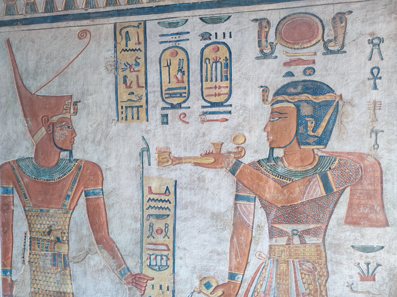 Nous visitons trois tombes qui sont moins impressionnantes que celles de leur mari ou parent, car oui non seulement il y a les tombes des reines, mais surtout les tombes de la famille royale. On découvre sur les fresques les même inscriptions, mais c’est quand même moins fin. Exception faite probablement pour la tombe de Nefertari, qui coute plus cher. Au début, nous pensions ne pas y aller et être satisfait avec les autres tombes accessibles avec le ticket de base. Finalement, lorsque l’on sort des trois tombes ouvertes, on regrette de ne pas avoir osé dépenser 70$ par personne en plus. On se dit que l’on ne vient qu’une fois ici et donc même si c’est très cher, les images qui sont installées devant l’entrée donnent vraiment envie. En plus il n’y a presque personne ce matin là.