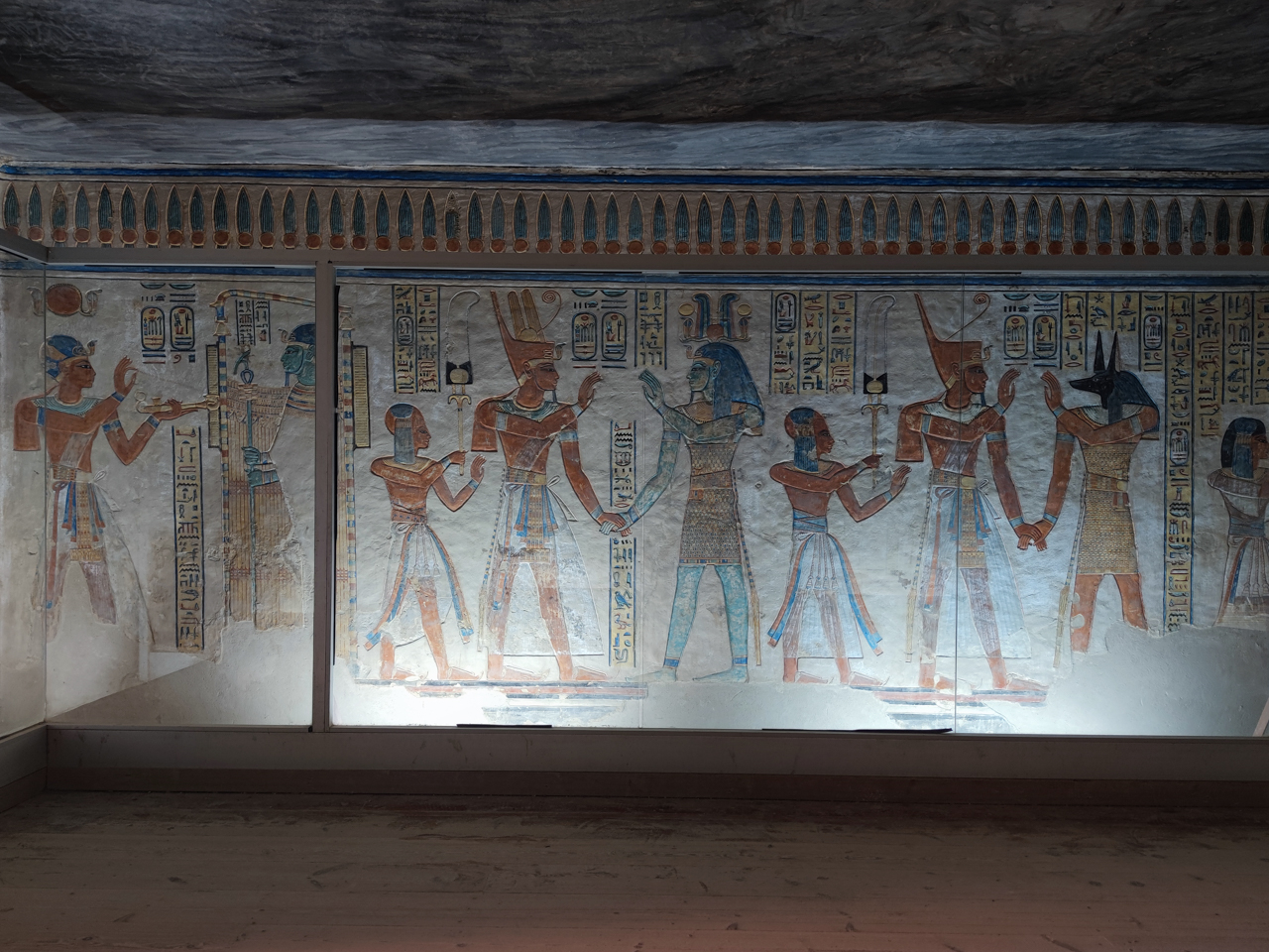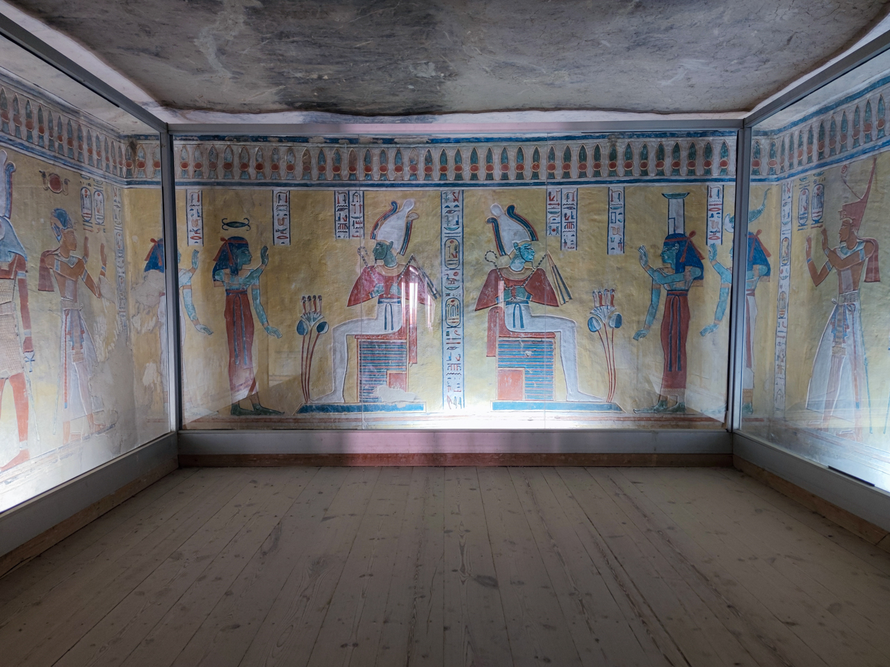 On finit la visite avec une troisième tombe, celle de tombe de Amen Khopshef, fils de Ramses III qui semble t'il serait mort assez jeune. Elle est aussi assez petite mais très joliment conservée.