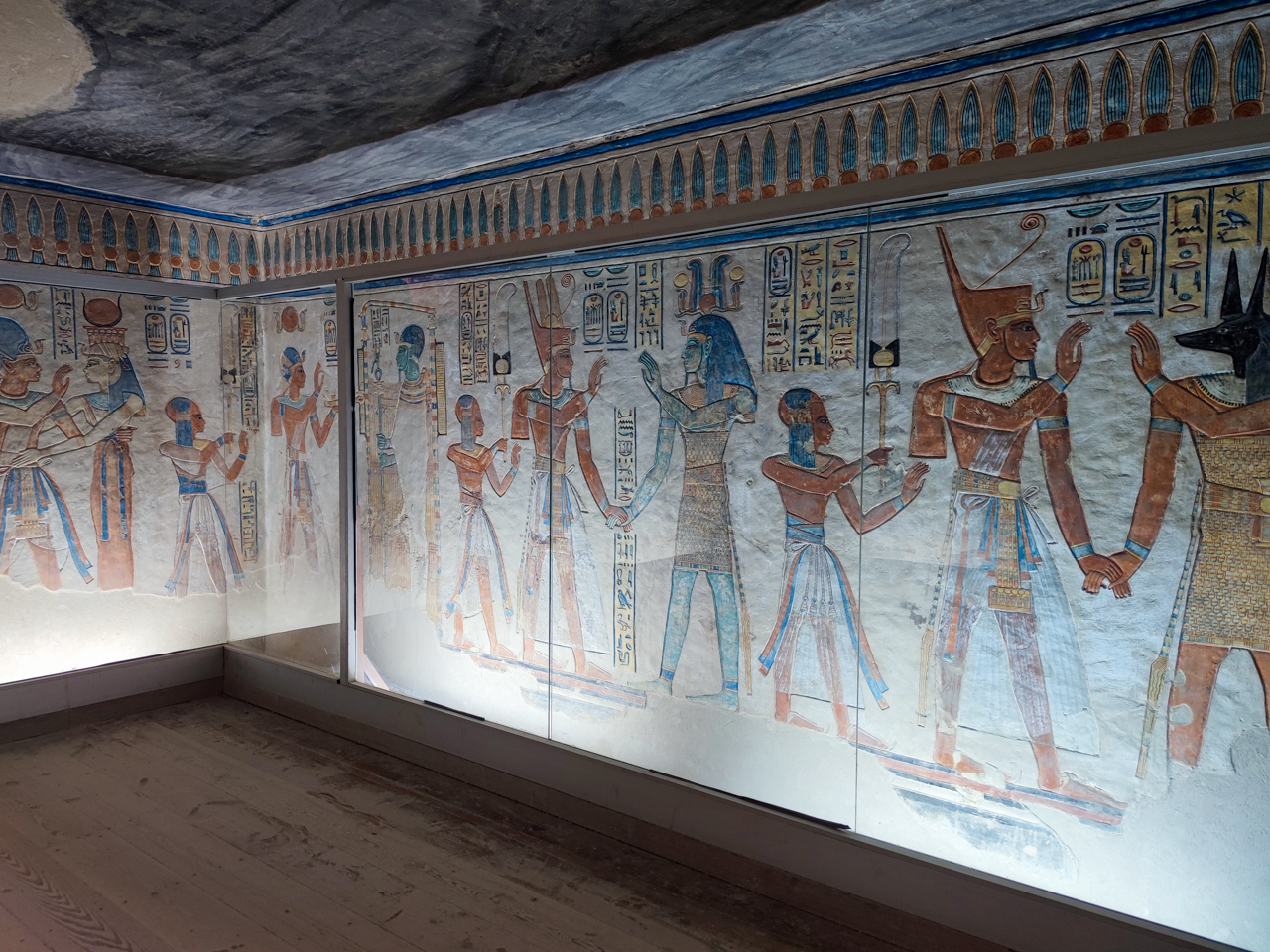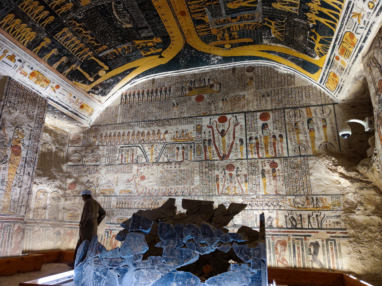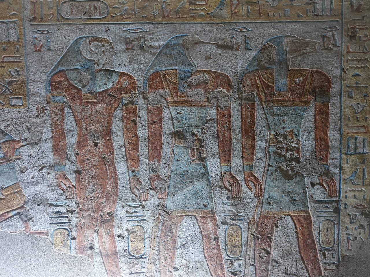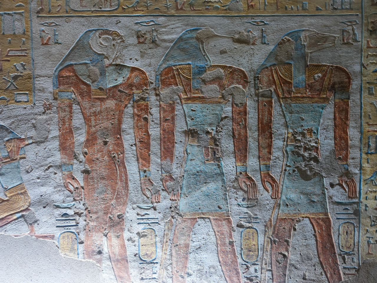 Finalement, on n’en a pas assez vu. On décide de retourner dans la vallée des rois, visiter les tombes que l’on avait pas pu voir la dernière fois. De toute façon, la journée est tellement venteuse, que l’on ne peut être dans un meilleur endroit que dans les tombes. On se dit que l’après midi on devrait arriver à un moment où il y a moins de monde. Encore une fois on est ébloui par les fresques dans les tombes que l’on visite aujourd’hui. On commence par la tombe de Tomb of Ramses IV, une des plus belles et que l'on n'avait pas pu visiter la dernière fois. On ne regrette pas tellement on est stupéfait par les fresques très différentes des autres tout au long de ce long boyau qui s'enfonce sous la terre jusqu'aux vestiges du tombeau royal.