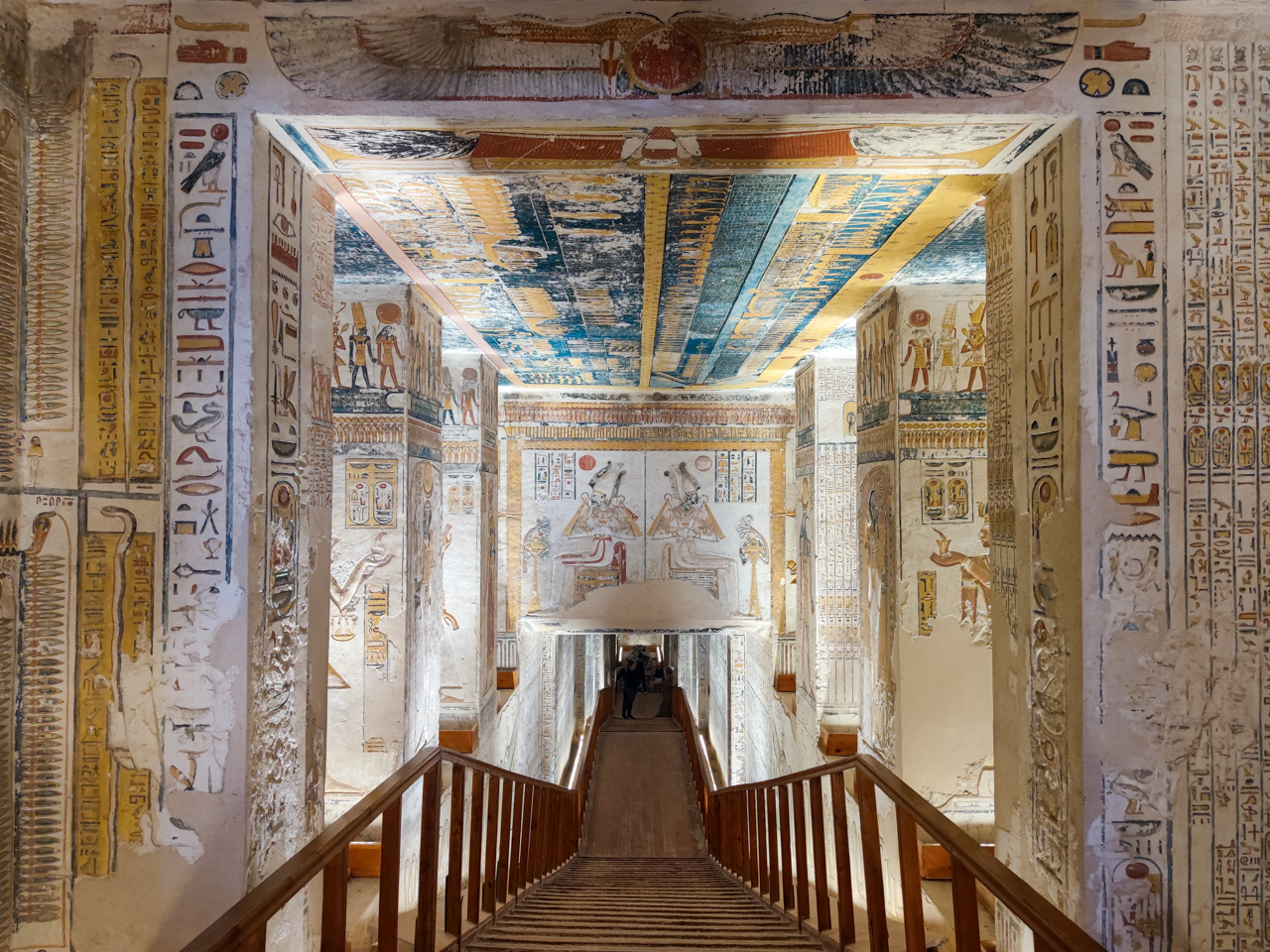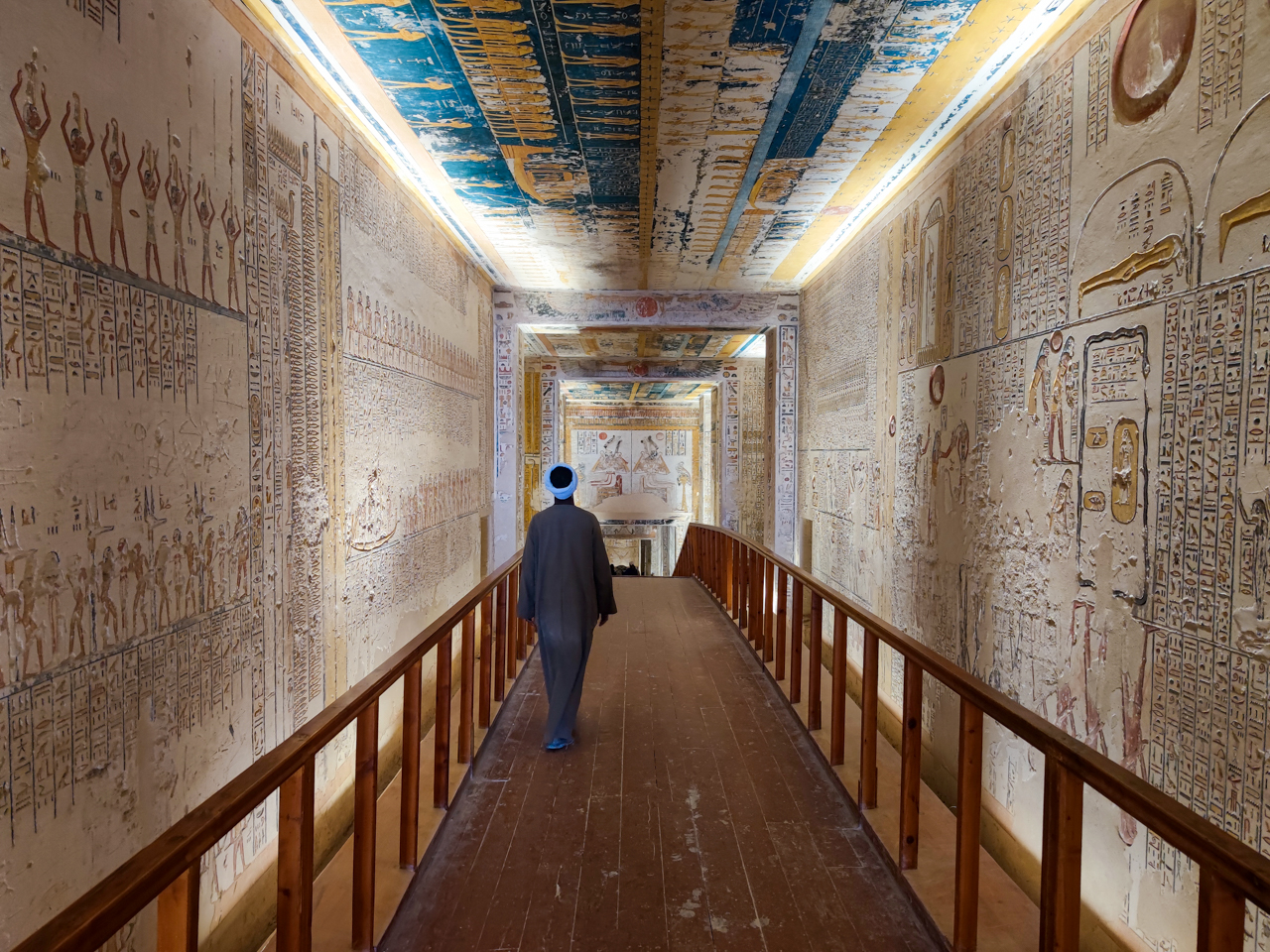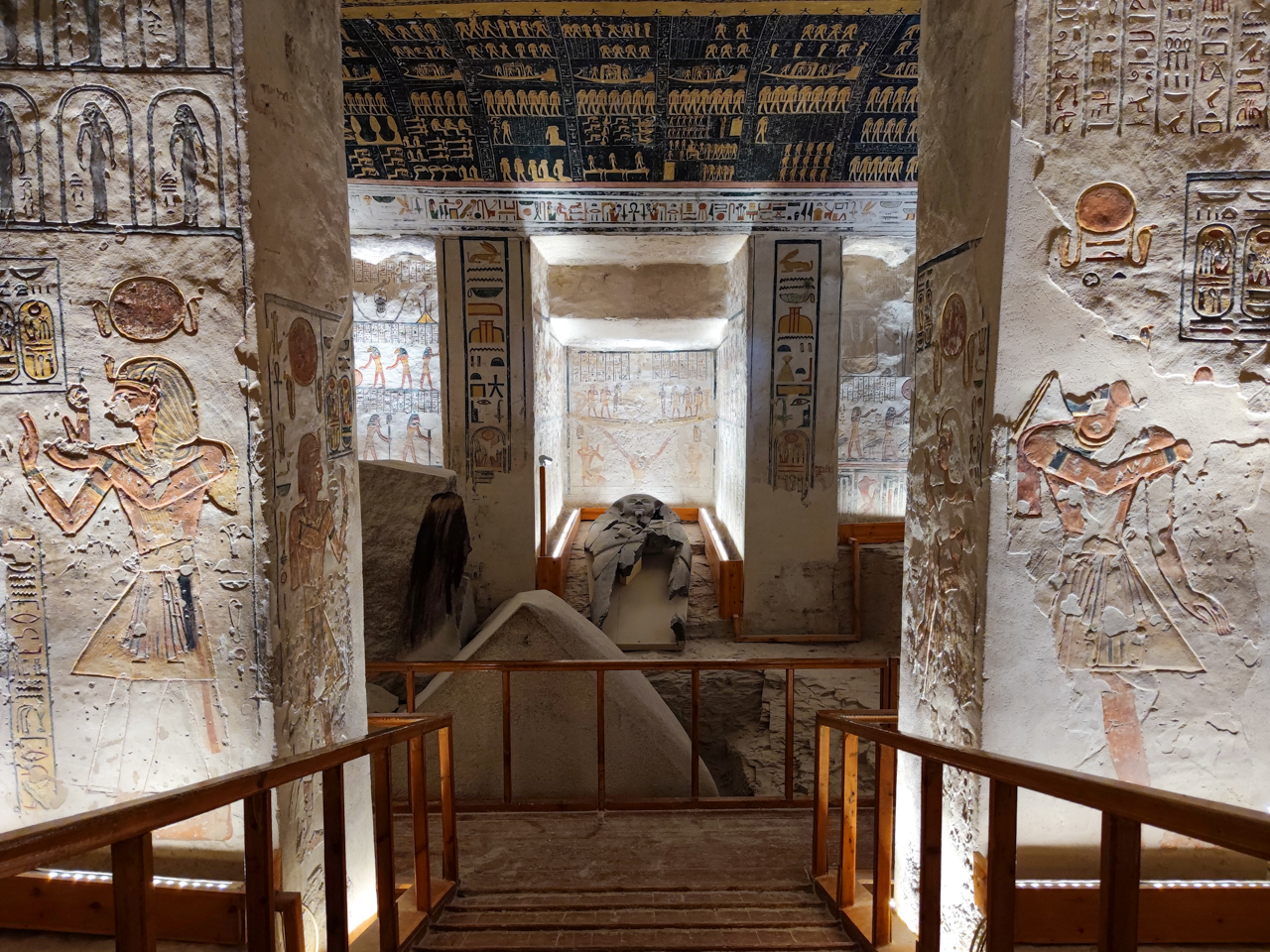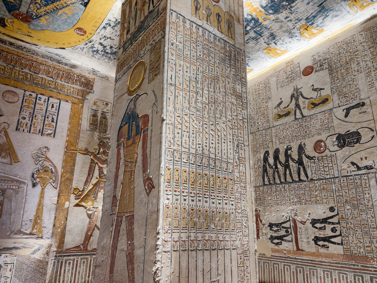 Finalement, on n’en a pas assez vu. On décide de retourner dans la vallée des rois, visiter les tombes que l’on avait pas pu voir la dernière fois. De toute façon, la journée est tellement venteuse, que l’on ne peut être dans un meilleur endroit que dans les tombes. On se dit que l’après midi on devrait arriver à un moment où il y a moins de monde. Encore une fois on est ébloui par les fresques dans les tombes que l’on visite aujourd’hui. On commence par la tombe de Tomb of Ramses IV, une des plus belles et que l'on n'avait pas pu visiter la dernière fois. On ne regrette pas tellement on est stupéfait par les fresques très différentes des autres tout au long de ce long boyau qui s'enfonce sous la terre jusqu'aux vestiges du tombeau royal.