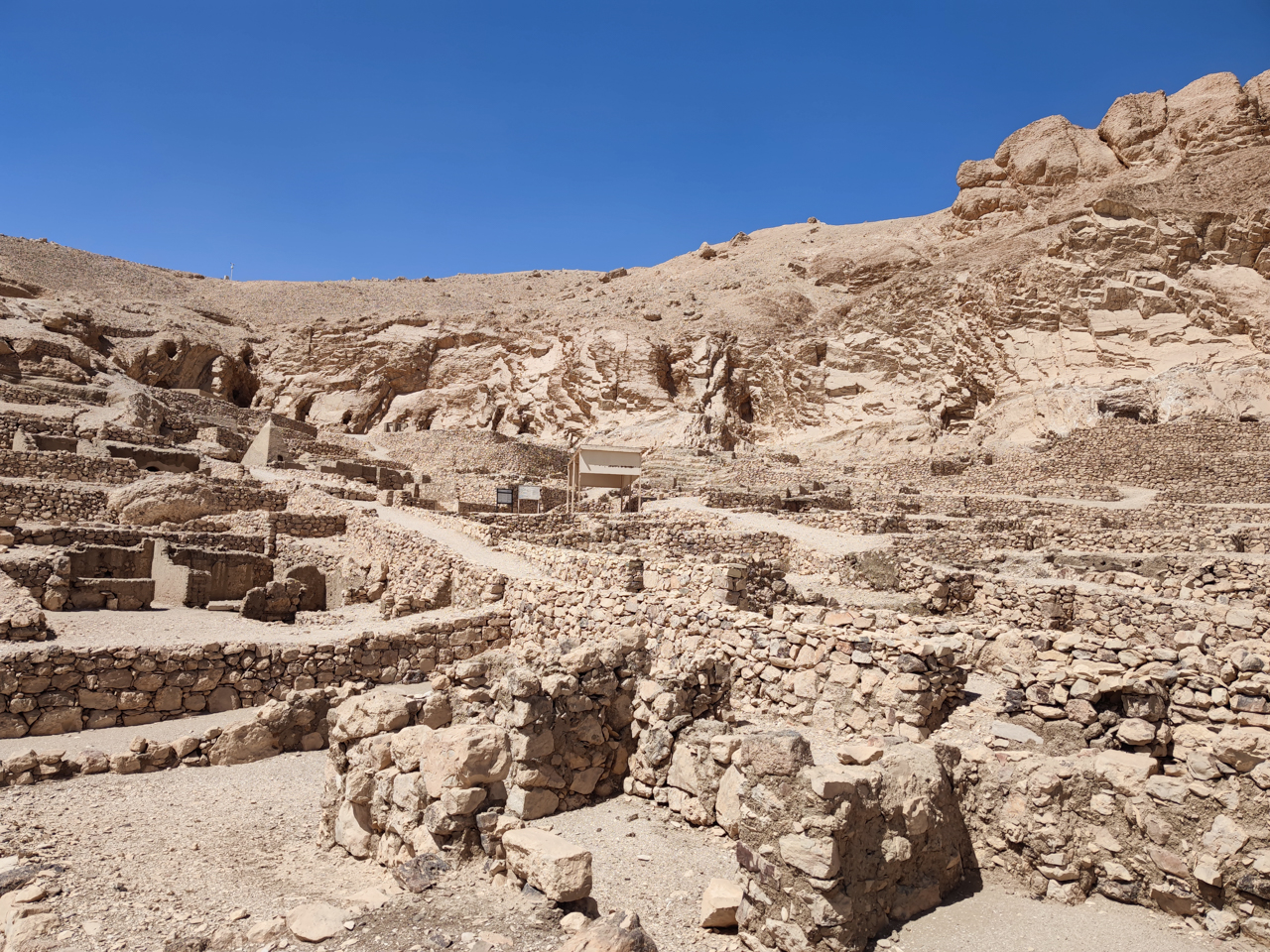 Clairement les tombes de la vallée des Reines nous ont semblé beaucoup moins intéressantes que les autres, mais le plus beau trésor de toute la région est probablement la tombe de Nefertiti que l'on regrette de ne pas avoir visité et qui je pense justifie la visite. Dans la même zone, on peut visiter une autre zone de tombe, les tombes des artisans à côté de leur village. Attention, je tiens à dire que cela fait largement partie d’un des endroits que l’on a préféré de toutes nos visites à Louxor. Les tombes sont plus petites, peu de visiteurs viennent ici, et les vestiges du village des artisans dont il ne reste plus que des murs sont impressionnants, posés au milieu du désert dans un creux entre les montagnes.
