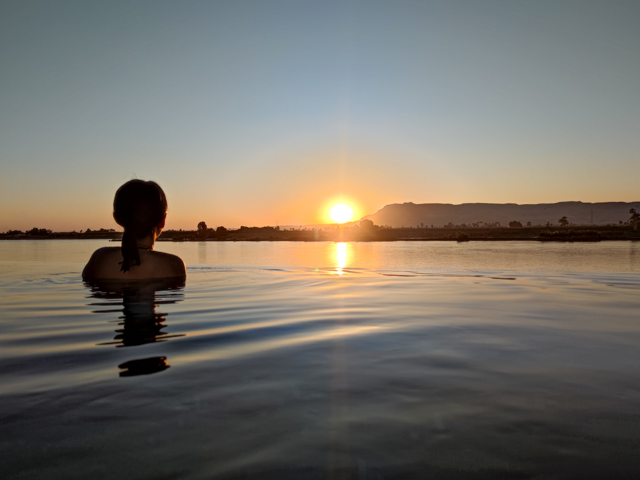 Ce soir, on profite des installations de l’hôtel qui a une piscine à débordement qui donne sur le grand fleuve face au coucher de soleil.