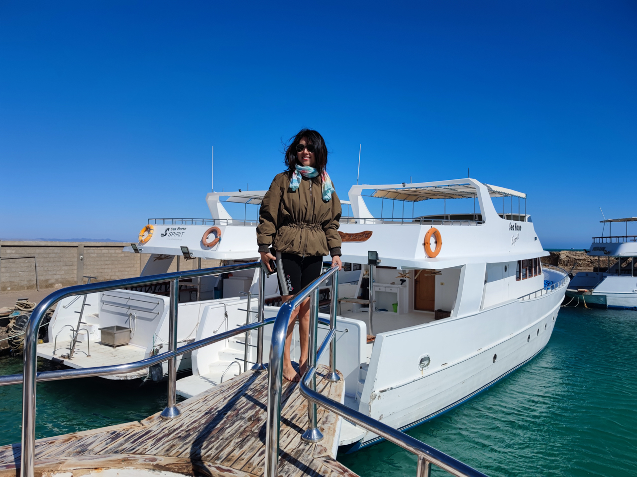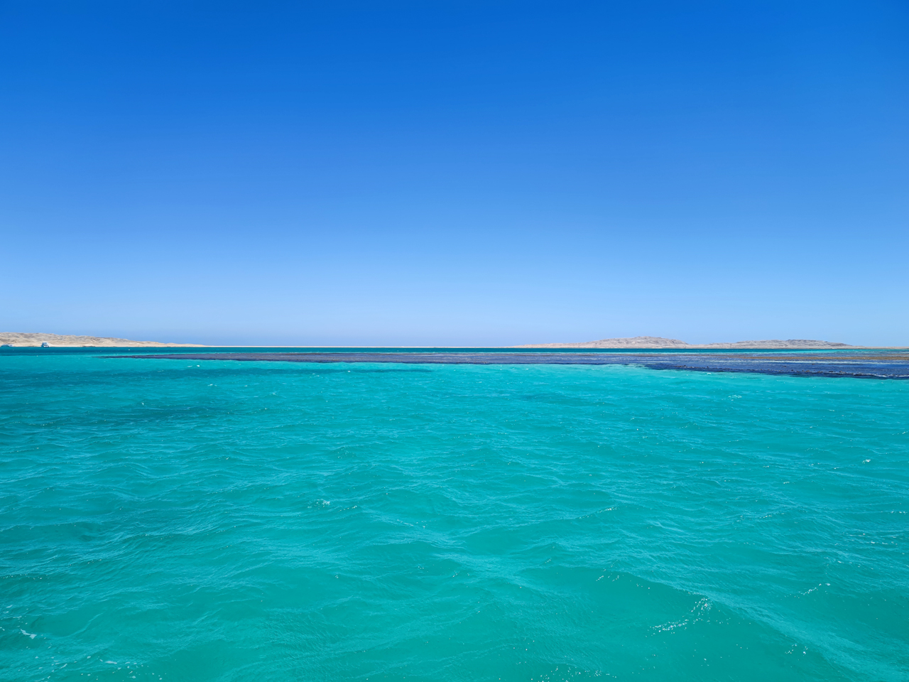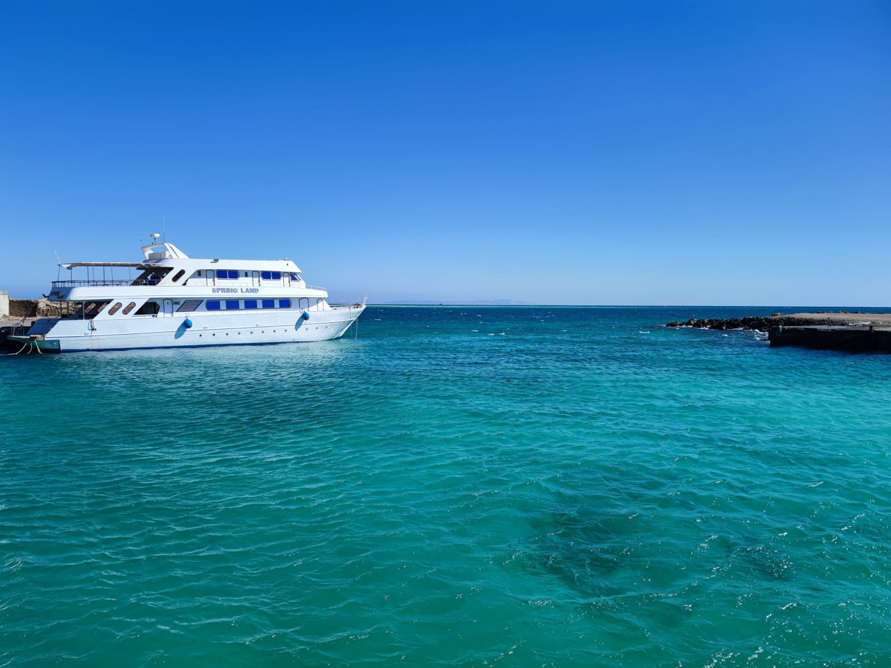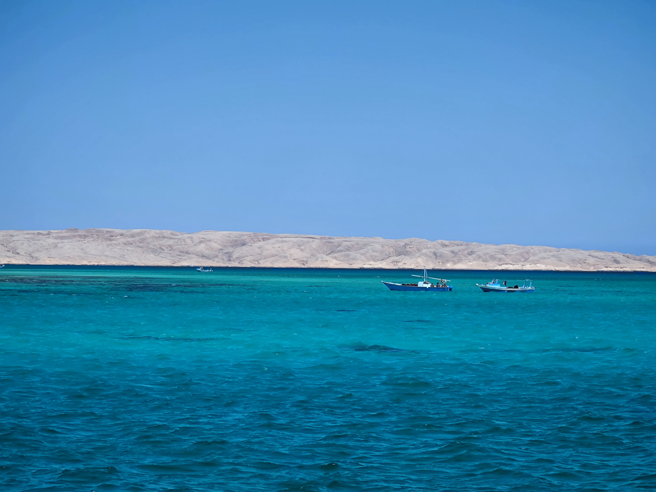 Un petit bateau à moteur vient nous chercher pour nous déposer au port de l’hôtel. La journée sur l’eau nous a ébloui avec tant de teintes de bleus. Les coraux ne sont pas si abimés qu’on le craignait et on est convaincu que l’on doit revenir à Hurghada pour une semaine de plongée.