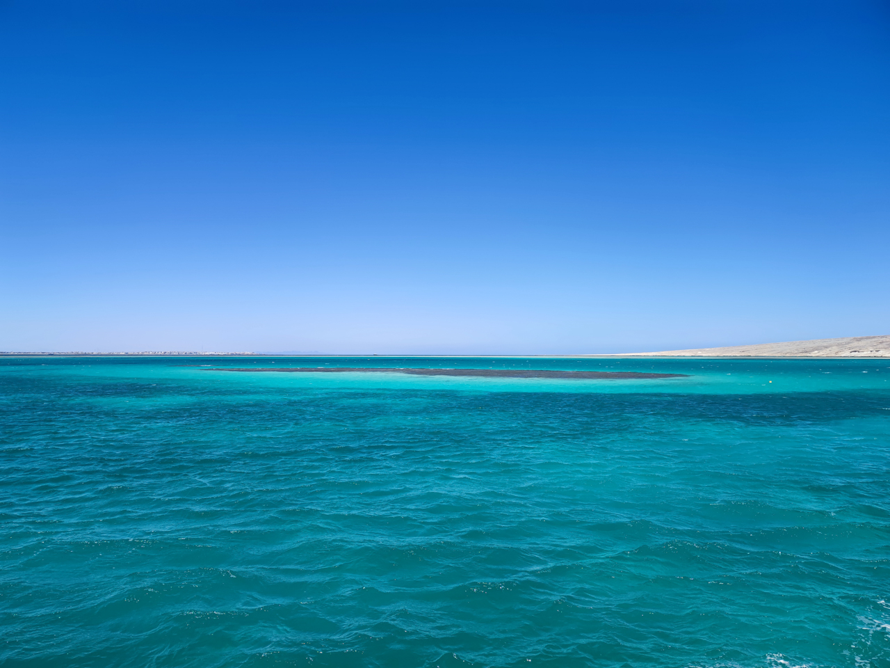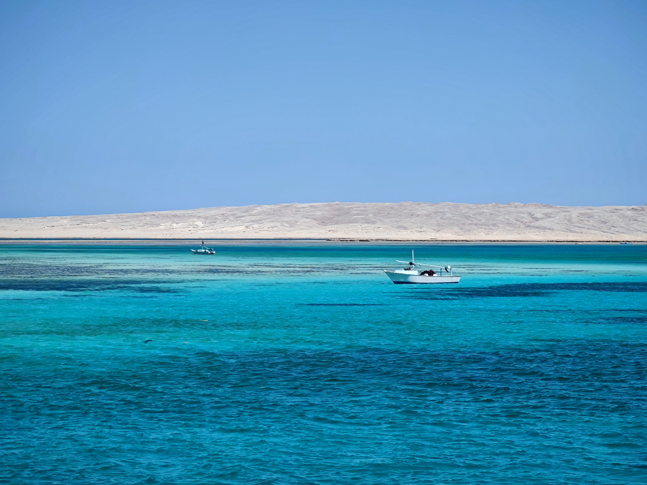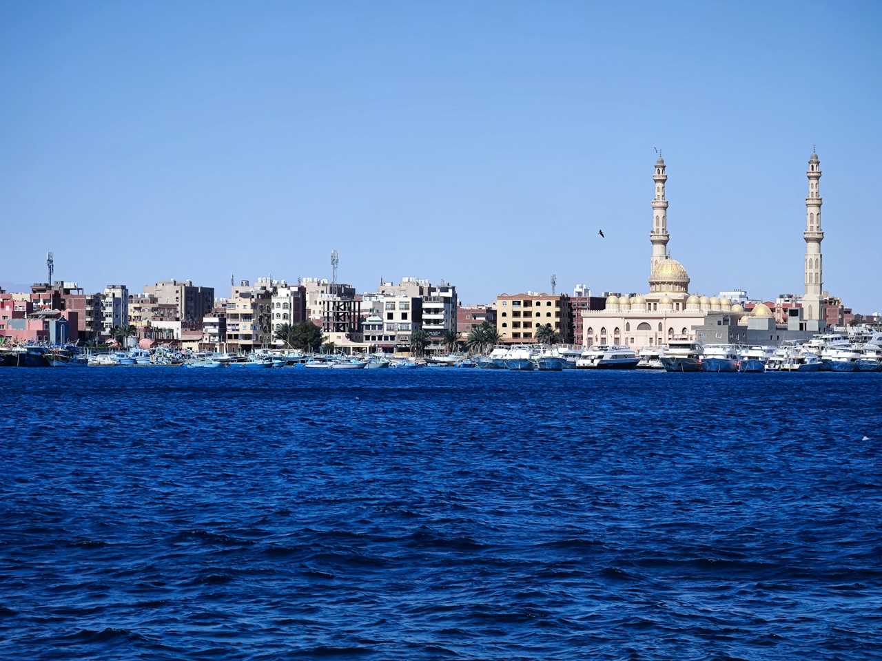 On part pour une traversée du détroit entre les îles Giftun à la recherche des dauphins. On a une vue panoramique sur la ville, la barrière de corail, son front de mer et les montagnes du désert en arrière plan. D’ici on peut prendre la mesure de la ville qui est tout sauf un village fantôme perdu au bout du désert.
