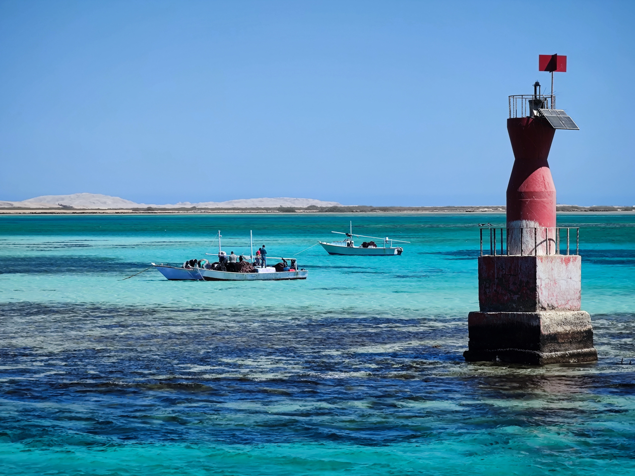 On traverse des zones de haut fonds, le chemin à prendre pour rejoindre l’île Giftun serpente au milieu des coraux. Un phare a été installé pour éviter aux bateaux de faire naufrage.