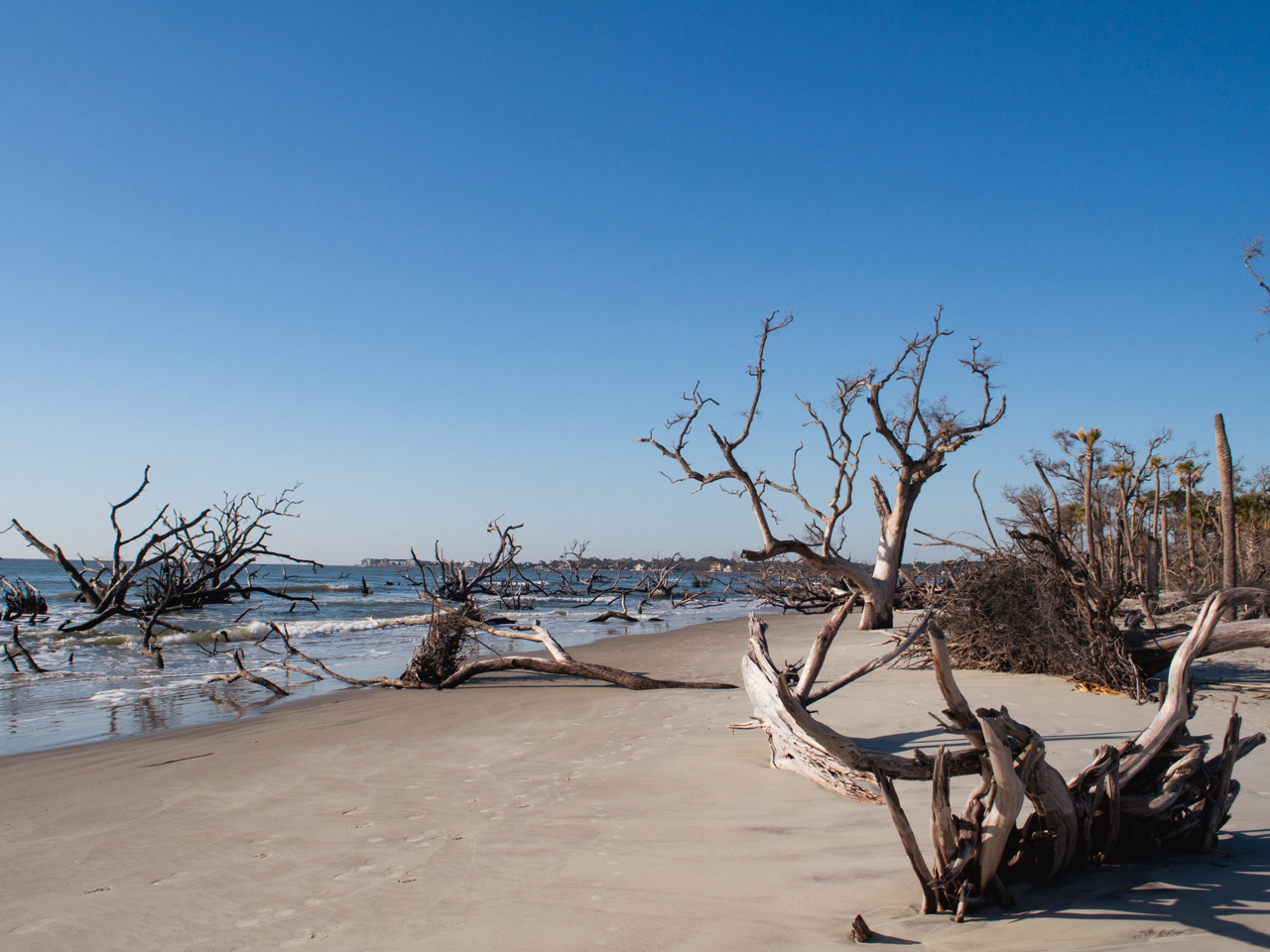 Je m’installe sur un arbre mort pour contempler l’océan. Je suis content d’avoir acheté un énorme tube de crème solaire la veille à Charleston car le soleil tape très fort ce matin. On est au Sud des Etats Unis et sans cela je pense que j’aurai déjà littéralement cramé. Un américain vient promener ses deux grands chiens tout au bout de cette plage. On commence à discuter et comme la totalité des américains que je rencontrerai dans ce séjour, il est très friendly et à la discussion très facile. C’est vraiment un trait commun que je trouverai chaque jour. Je continue mon chemin ensuite en faisant le tour de l’île. Il faut enjamber les nombreux troncs d’arbre morts, c’est assez incroyable.
