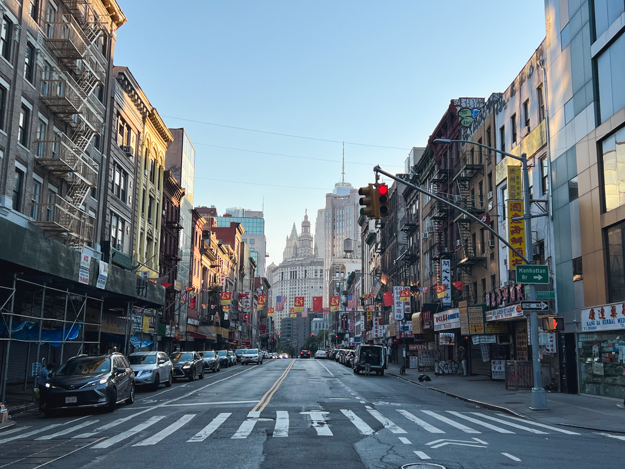 Au Nord de Lower Manhattan, juste à côté du grandiose quartier financier on change d’univers en quelques rues. En traversant le passage piéton, c’est comme si on avait traversé l’océan Pacifique et se retrouve comme projeté en Chine. Un vieux monsieur assis à un carrefour joue des airs de musique traditionnelle chinoise sur son Erhu, les affiches des magasins, les prix des produits, les publicités sont en carctères, les étals du marché vendent du poisson et des fruits avec leurs odeurs (durian) qui rappellent le Sud de la Chine, même le niveau des règles d’hygiène semblent s’être mis au niveau.