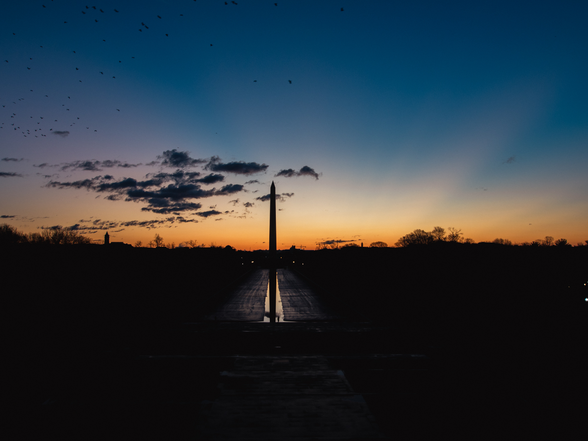 L’immense obélisque qui est au centre de la ville est le monument en souvenir de Washington, le commandant en chef de l’armée qui s’est opposé à l’Angleterre et premier président des Etats Unis. Ce monument trône au centre du Mall, face à la Maison Blanche à une position stratégique. Son style s'inspire des obélisques que l’on trouve à Louxor en Egypte. Avec 169 mètres de hauteur, il fut pendant une courte période le bâtiment le plus haut du monde, de 1884 à 1889 avant d’être détrôné par la Tour Eiffel. Il y a quelques photographes qui sont là aussi avec leur trépieds pour capturer ce moment.