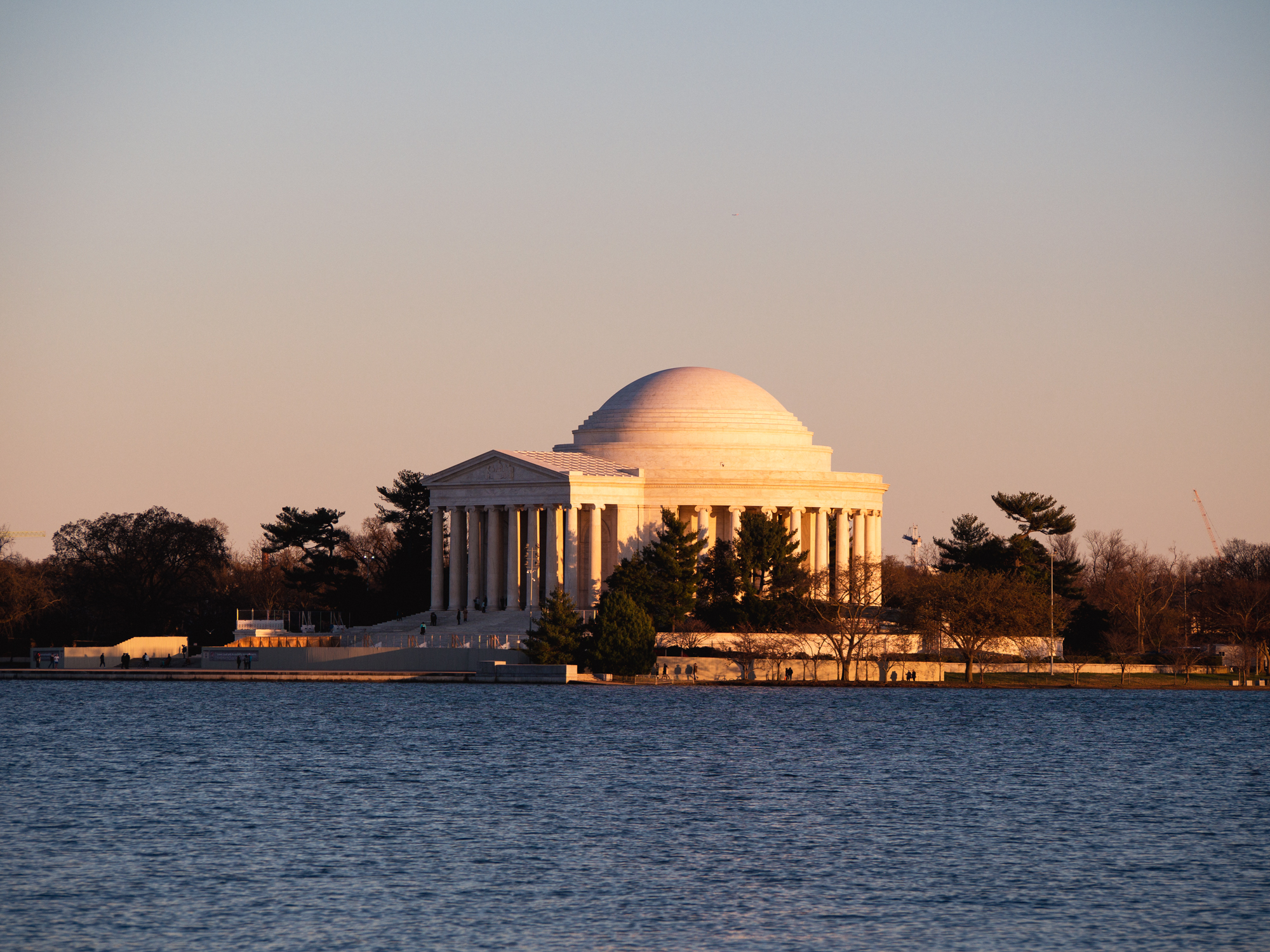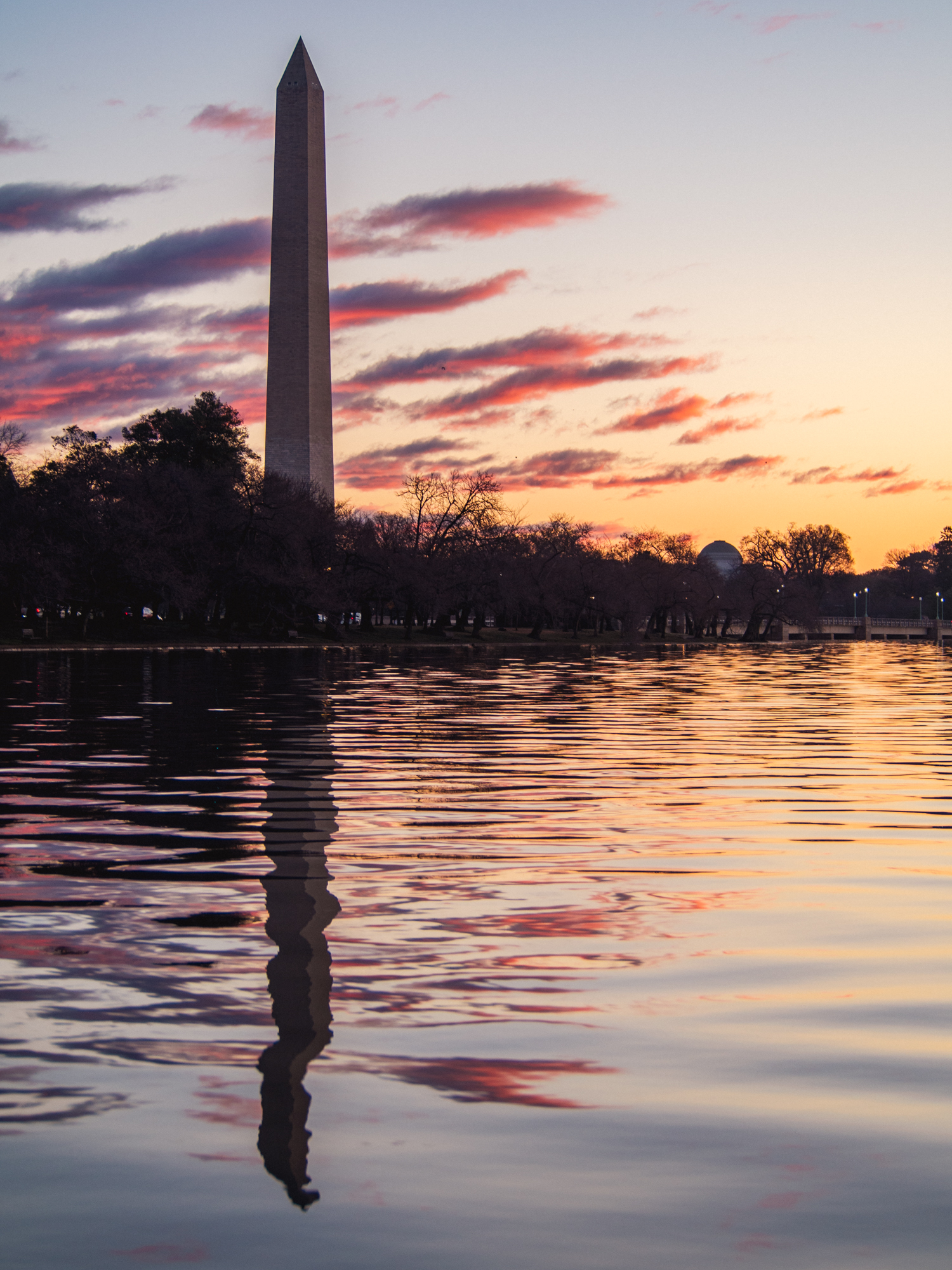 Le soleil descend vers l’horizon et les bâtiments du Mall en marbre prennent une couleur chaude. Sur le Tidal Basin, le Jefferson Memorial et son dôme est magnifique avec cette teinte, tout comme le Washington Monument.
