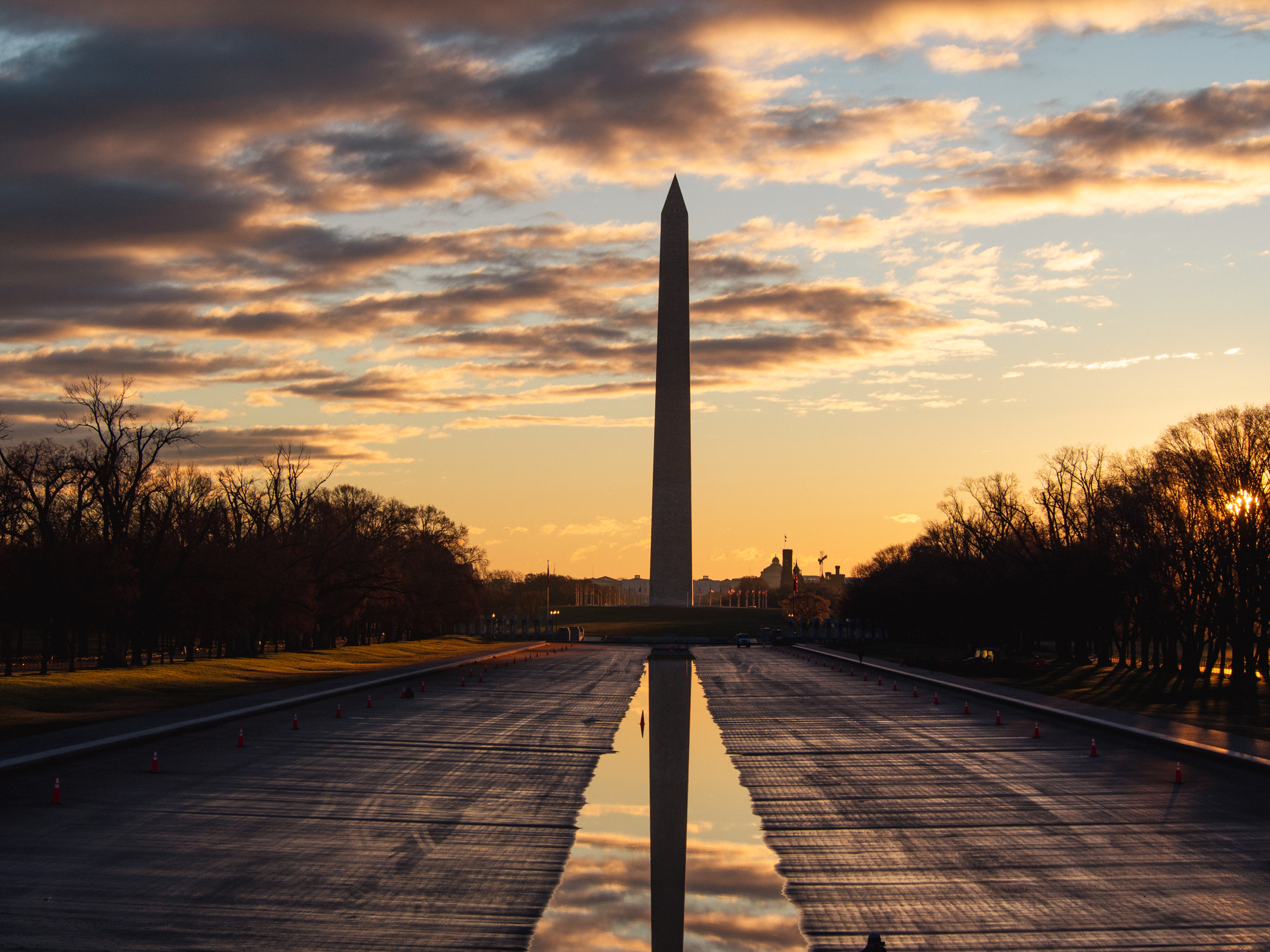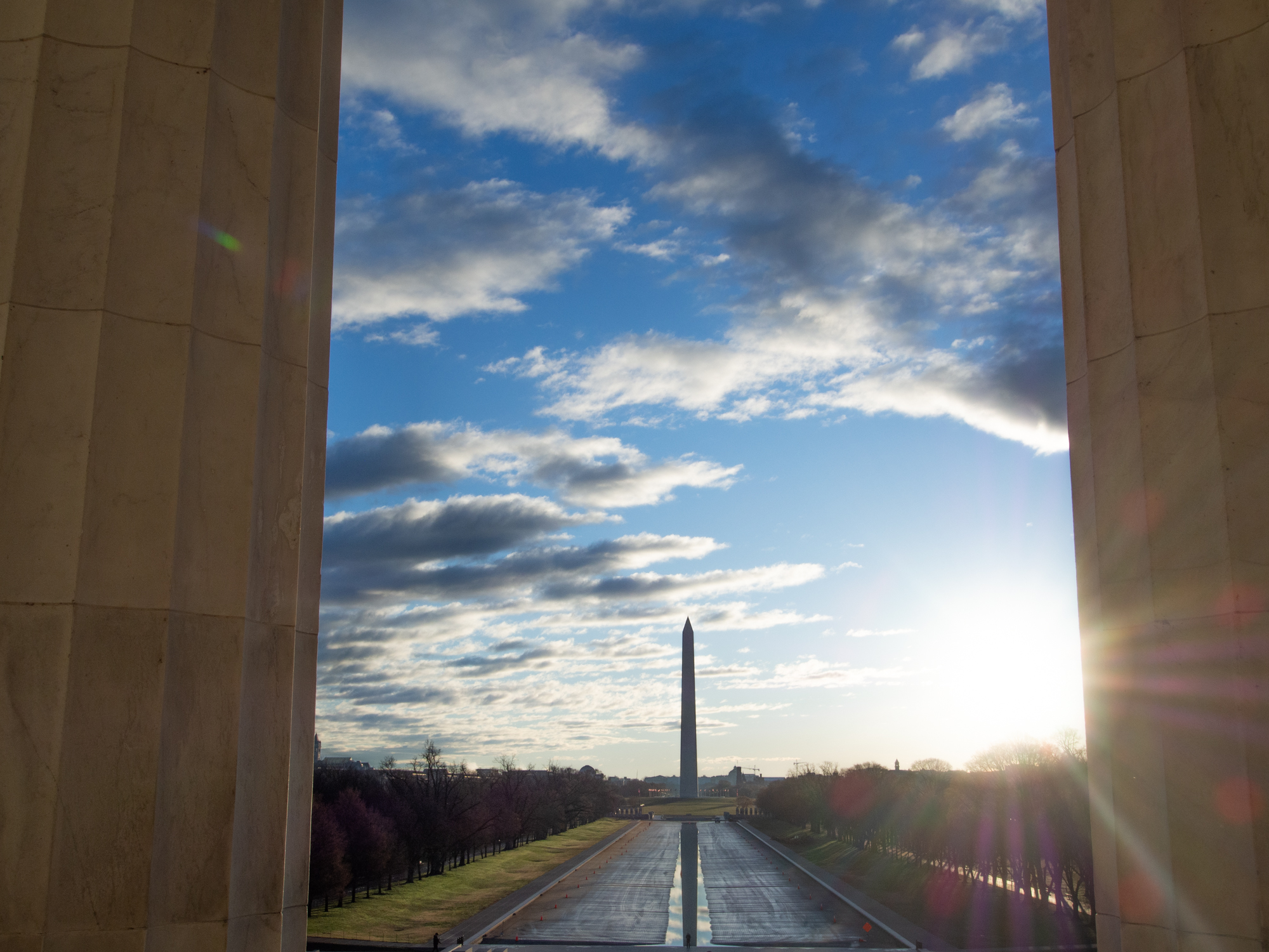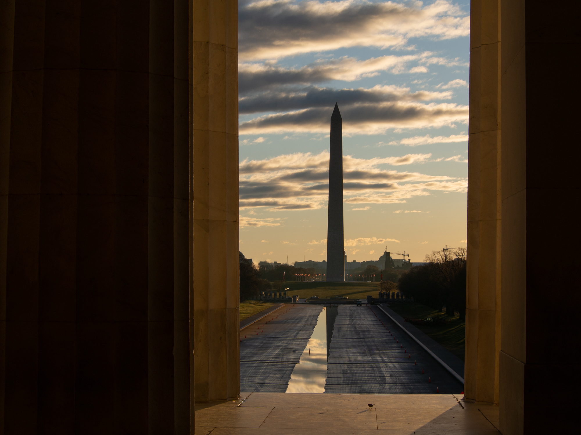 L’arrivée à Washington depuis l’Europe se fait à l’aéroport de Dulles dans l’Etat voisin de Virginie, un des deux aéroports qui dessert la ville. C’est un grand aéroport et le passage à l’immigration est comme souvent dans ces aéroports américains très long et lent. Pas facile après presque 10 heures de vol. J’arrive finalement après presque 40 minutes d’attente à passer devant le douanier qui ne me retient que quelques instants, alors qu’il avait posé des questions pendant 5 minutes aux voyageurs devant moi, vraiment bizarre… Pas de chance encore, je sors du terminal impatient de découvrir la capitale des Etats Unis et là je suis saisi par le froid, le crachin et le vent qui me refroidissent instantanément. Ça caille ici ! Heureusement, mon Uber vient me récupérer très rapidement, il est prévu 45 minutes de route jusqu’à mon hôtel situé en plein coeur du centre ville. 45 minutes ? C’est vraiment pas à côté, mais bon, on est au milieu de l’après midi et il faut se recaler sur l’heure locale, j’en profite pour finaliser mon planning du week-end sur le téléphone en consultant des blogs de voyage. Juste avant d’arriver sur le pont qui traverse la rivière Potomac, un accident bloque la circulation et les sirènes des pompiers retentissent derrière nous. Oh ça ne sent pas bon et finalement, on reste bloqué plus d’une heure sur cette voie rapide sans pouvoir bouger. Pas facile après une longue journée coincé dans le siège de l’avion, ce contretemps n’est pas agréable mais pas pas le choix, il faut prendre son mal en patience. Je me dis que de toute façon il pleut aujourd’hui et je n’ai pas envie de prendre froid en cette fin d’hiver, donc je n’aurai rien prévu si j’étais arrivé à l’heure à l’hôtel. Quand j’arrive devant la porte de l’hotel, finalement presque deux heures après être parti de Dulles International Airport, je suis épuisé par le décalage horaire et je file directement me coucher. Je me réveille très tôt et je regarde par la fenêtre pour voir quel temps il fait. Il fait encore nuit noire mais en tout cas il ne semble pas pleuvoir, c’est déjà ça. Mais pourtant je vérifie le temps sur le téléphone et ce n’est pas très encourageant pour cette matinée, du vent et des nuages en majorité. Dommage, car j’avais prévu de partir découvrir le Mall au lever du soleil, ça a l’air super beau à ce moment là. Mais bon, je me dis que tant qu’à être là et de toute façon je suis levé, je m’habille chaudement et pars quand même en direction du Lincoln Mémorial en Uber. Quand je monte dans la voiture, le chauffeur me demande ce que je vais faire là bas à cette heure-là, c’est beaucoup trop tôt. Et pourtant c’est au moment de l’aurore que je me rends compte que la météo n’était pas juste, le temps est magnifique, avec un peu de nuages, cela va rendre super bien en photo. Lorsque j’arrive au Lincoln Mémorial, le moment est juste idéal, le timing est parfait, je grimpe sur les marches pour avoir une photo du Mall dans son ensemble, ce grand parc qui rassemble les plus grands monuments de DC sur une longueur de 4 kilomètres. C’est magnifique avec les rayons du soleil qui percent l’horizon.