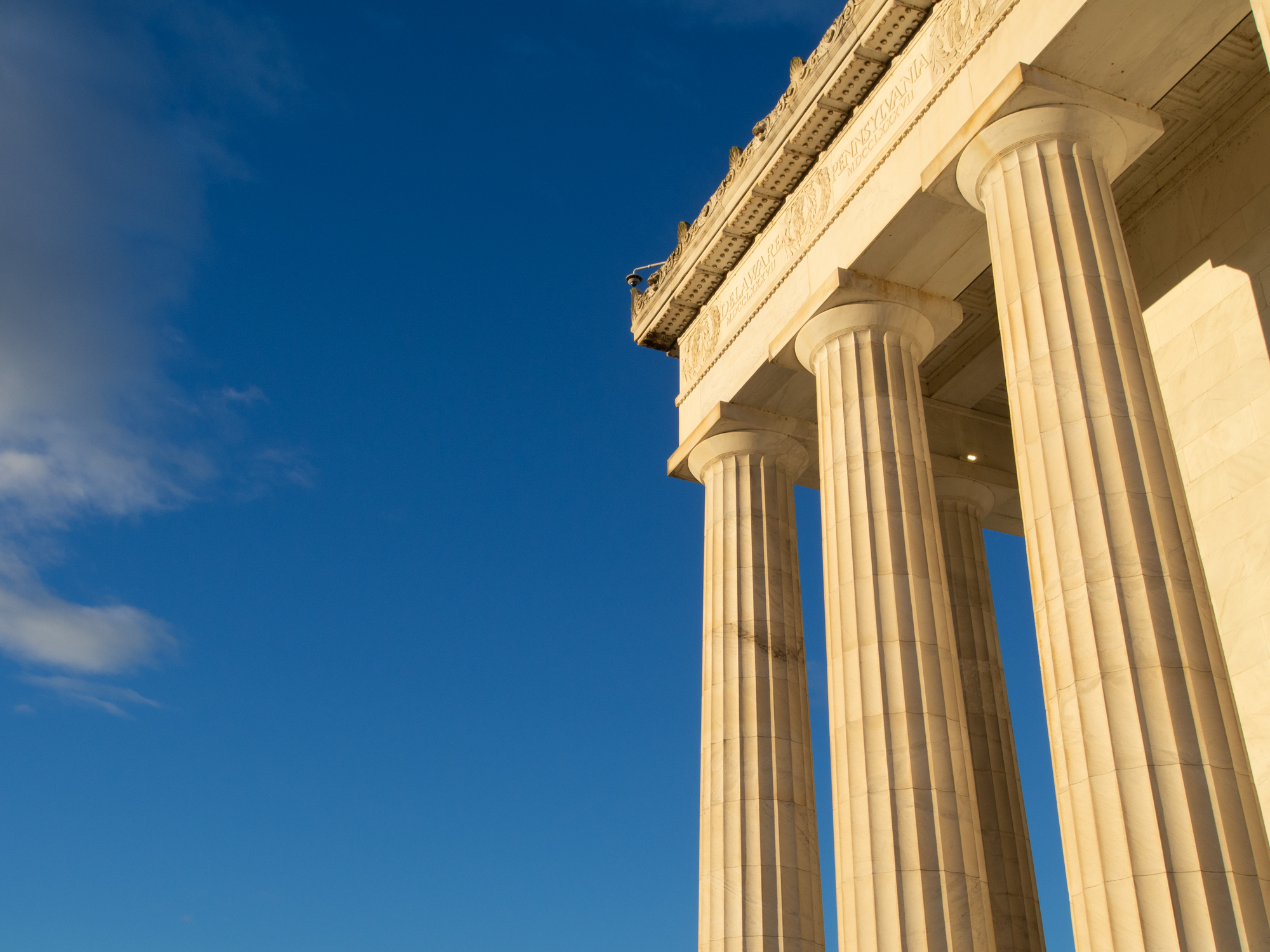 Les rayons du soleil pénètrent directement à l’intérieur du Mémorial et viennent illuminer la statue du Président Lincoln qui siège à l’intérieur.