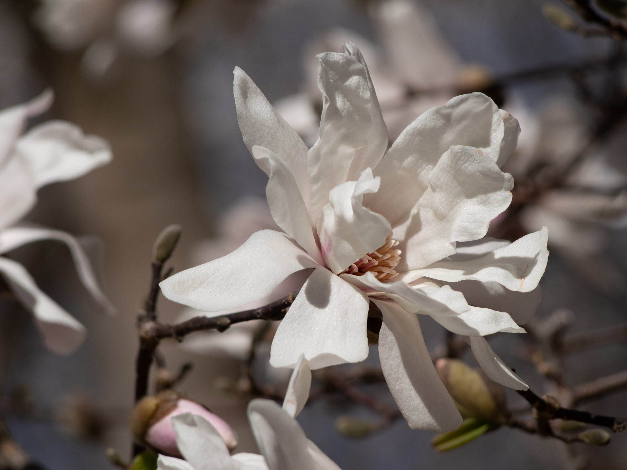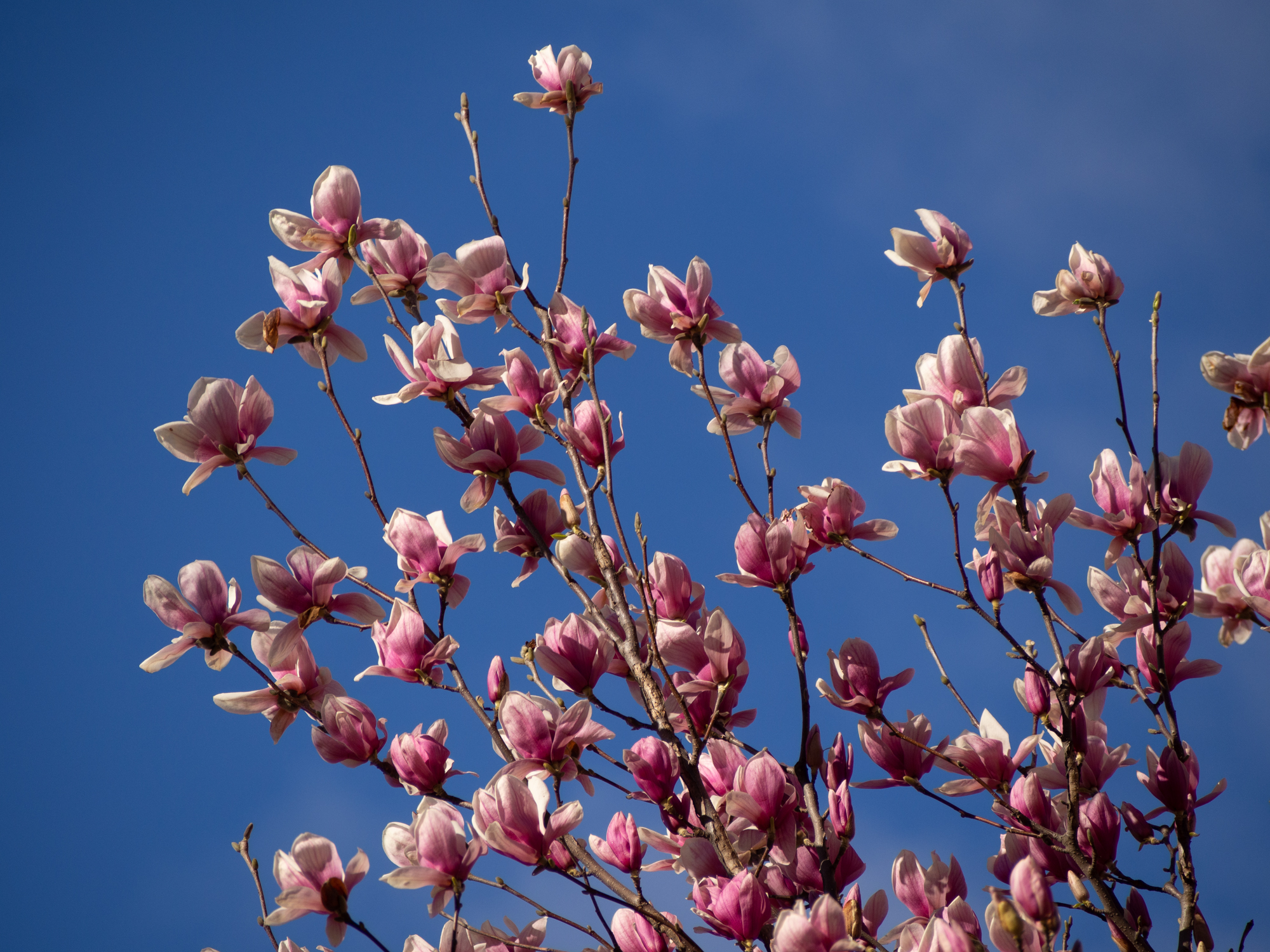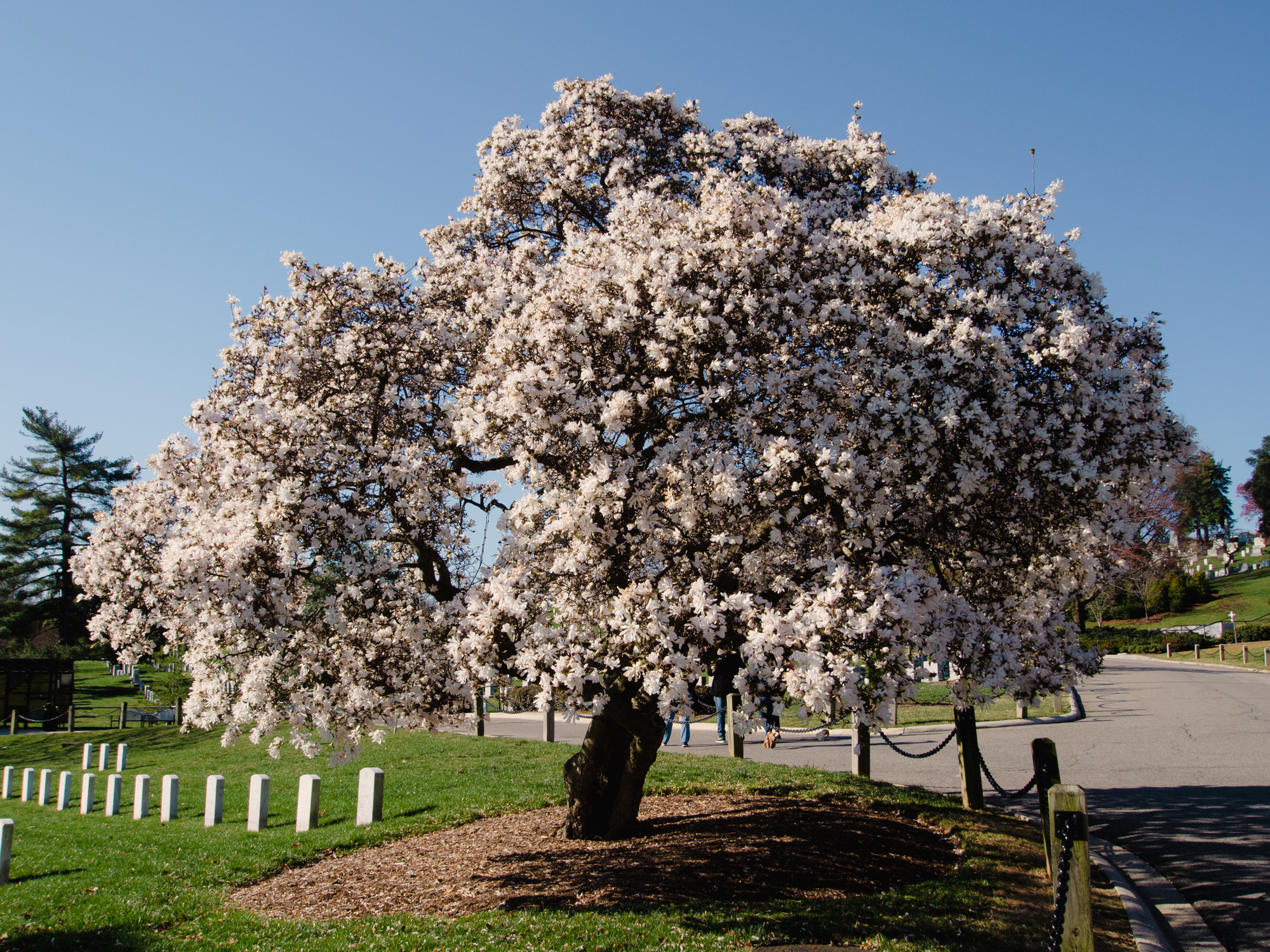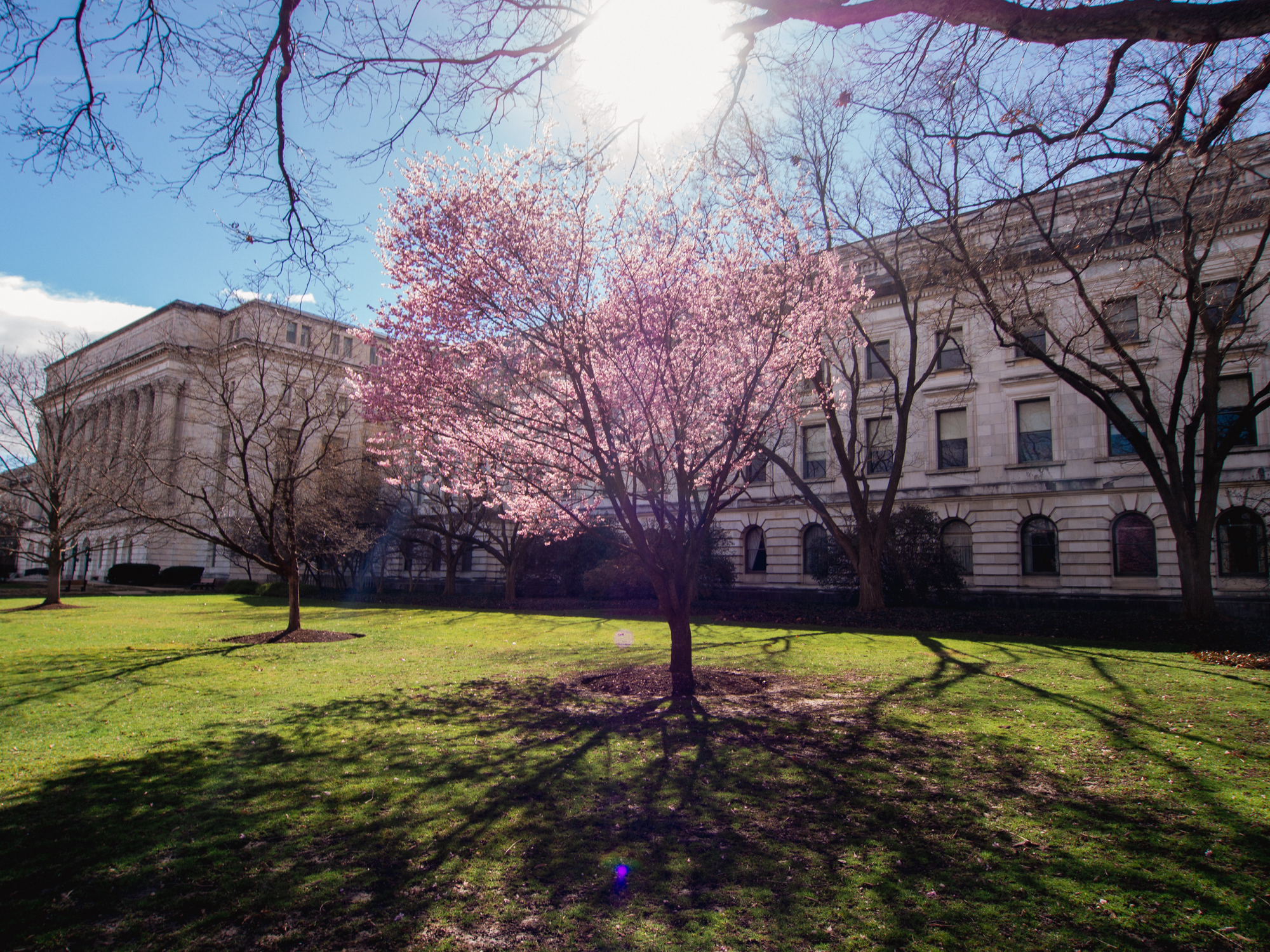 De grands arbres sont plantés mais ils sont tout dégarnis, l’hiver n’est pas encore tout à fait fini, on a la chance d’avoir quelques arbres arbres avec de grosses fleurs.