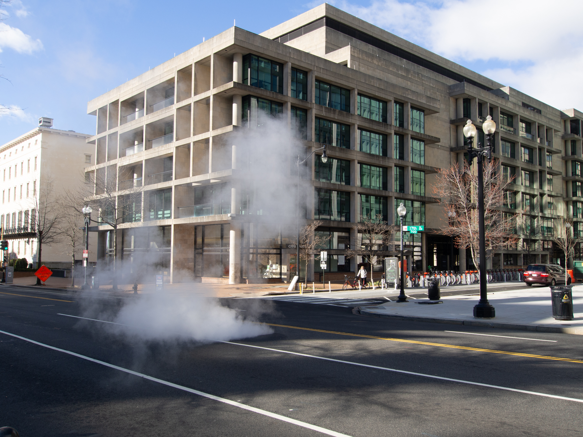 Comme a New York, on voit de la vapeur s’échapper depuis une bouche d’égout. Par contre ce sera la seule du week-end, alors que dans New York, le phénomène est beaucoup plus courant.