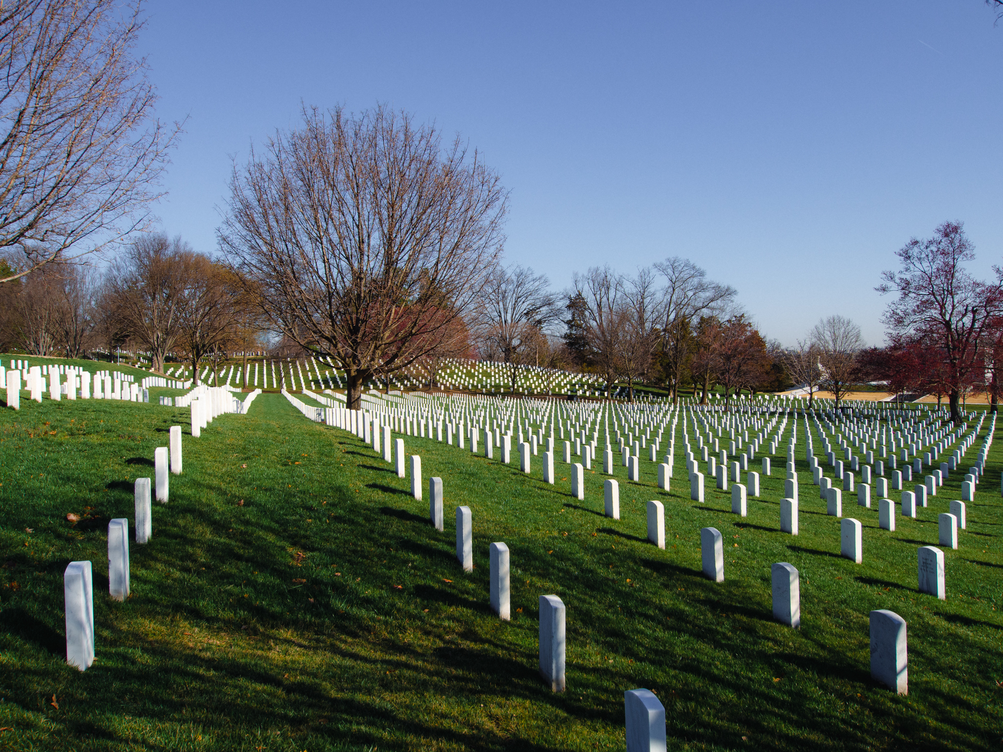 La pelouse qui remonte le long de la colline est recouverte de pierres tombales. Il y en a de partout. Cela donne un sentiment de tristesse mais aussi rappelle à quel point la culture américaine est si proche de la guerre.