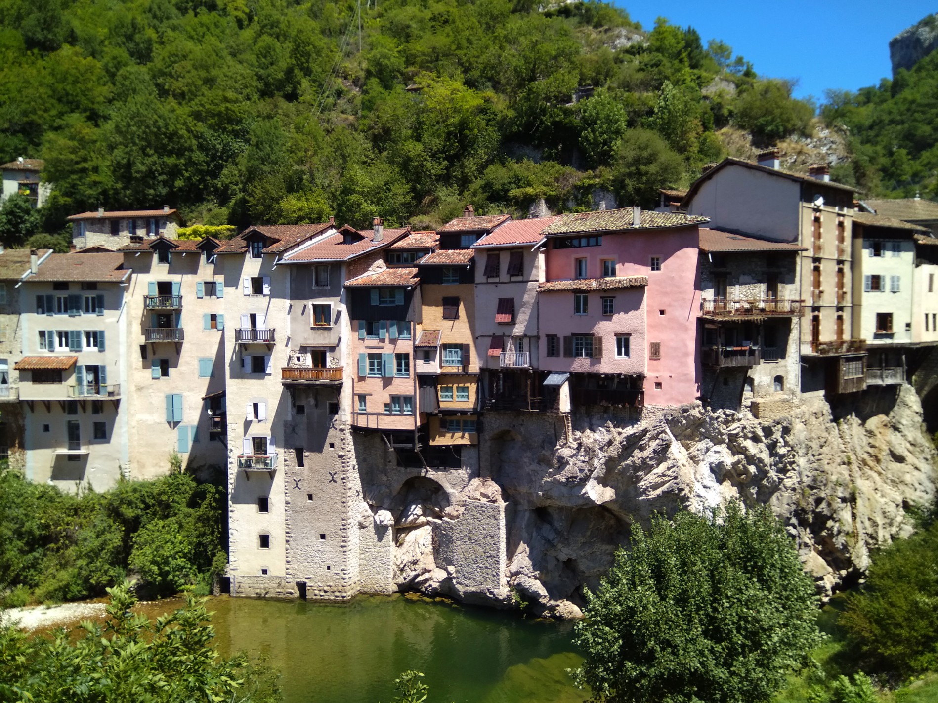 Pont en Royan est une belle étape sur la route du Sud, situé à proximité de Valence et au contreforts du Massif du Vercors. Ce village s’est installé dans un passage étroit traversé par le torrent de la Bourne, et comme son nom l’indique, c’est donc ici qu’avait été construit un pont pour permettre de franchir le cours d’eau. Sa renommée vient de ses charmantes maisons suspendues colorées construite tout en hauteur au-dessus de l’eau.
