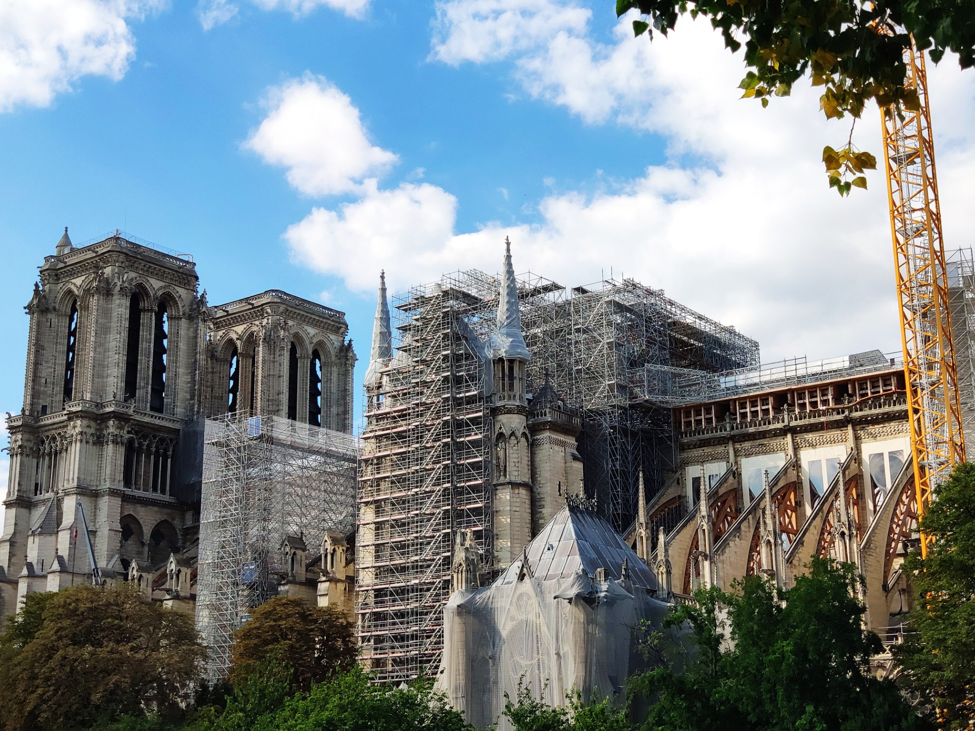 Et pourtant lorsque l’on continue de longer les quais, l’arrière de la cathédrale dévoile le chantier en cours pour tenter de la sauvegarder. On imagine que l’incendie aurait pu avoir des conséquences bien pire, que l’édifice s’écroule complétement, on voit que certaines structures sont retenues par des structures en bois ou en métal. Cette vision nous glace le sang et nous rend très triste. Comment imaginer que cette cathédrale presque millénaire puisse subir ce genre de catastrophe ? Elle fait vraiment partie du patrimoine de l’humanité, et le monde entier a été bouleversé par les images.