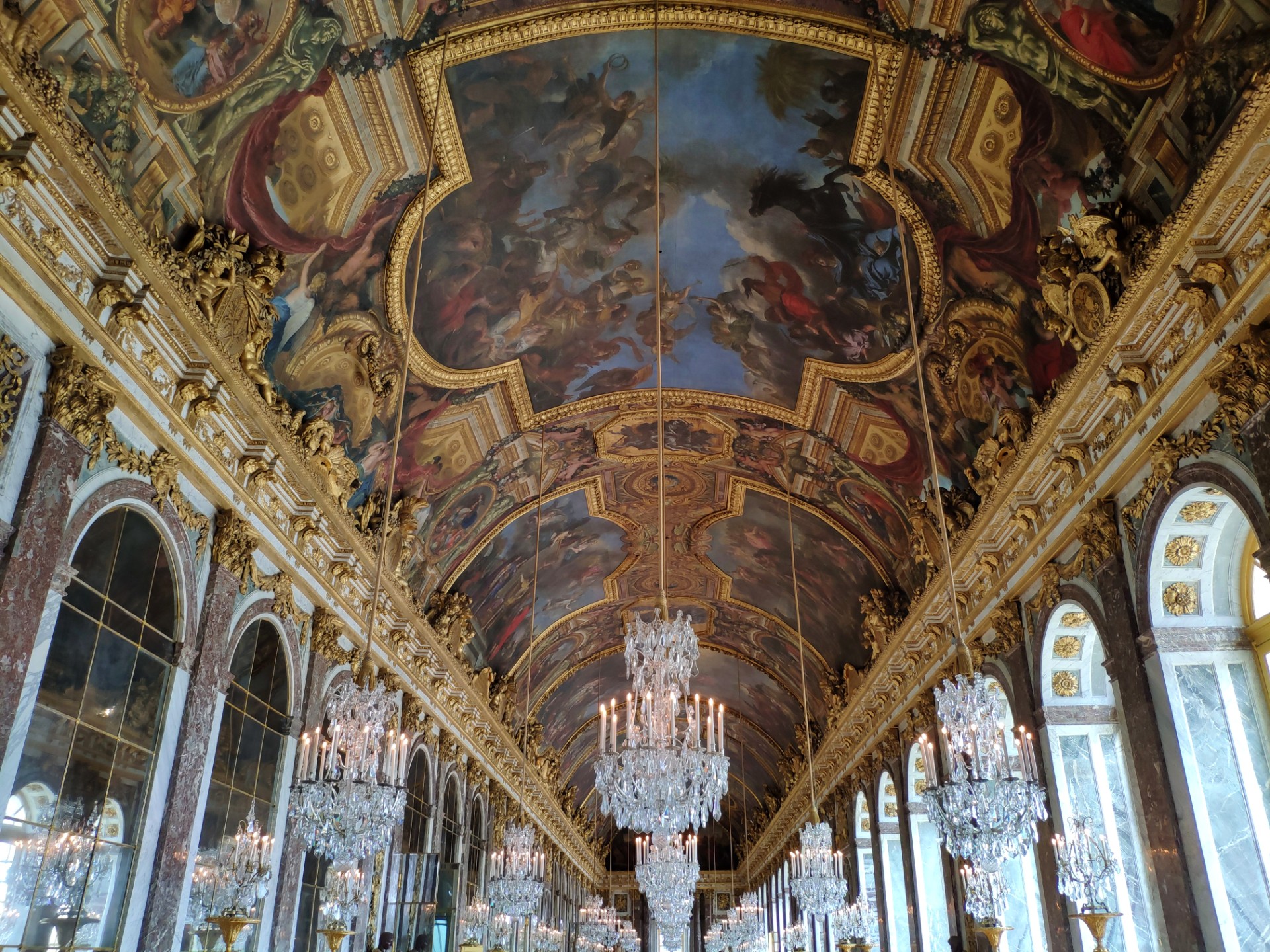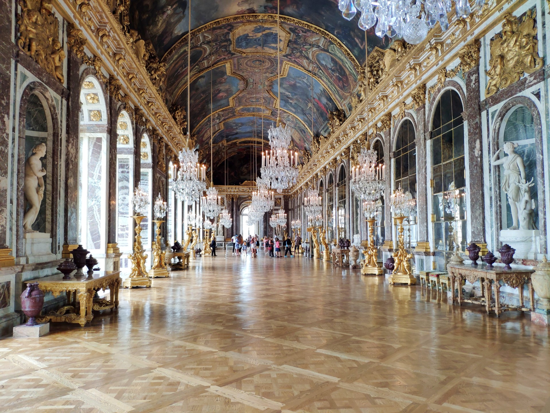 On retourne dans la galerie des glaces qui nous ébloui par sa splendeur. On se rappelle aussi que c’est dans la galerie des glaces que se sont déroulés des moments importants de l’histoire européenne. Notamment c’est ici que sera proclamé l’empire allemand en 1871 mais aussi ici que sera signé la fin de la guerre avec l’Allemagne en 1919.