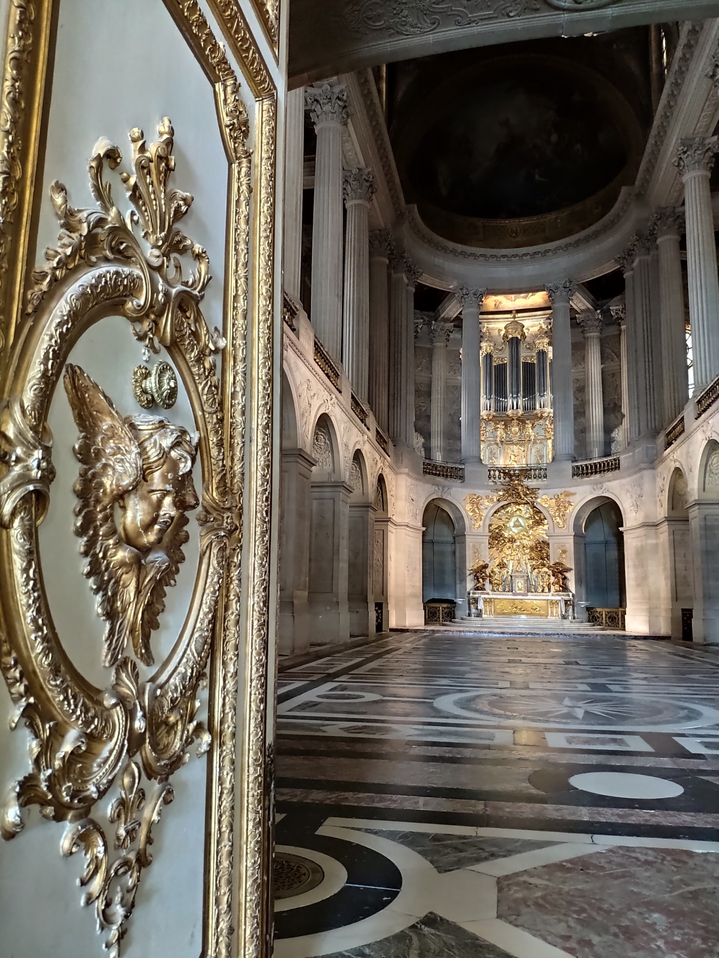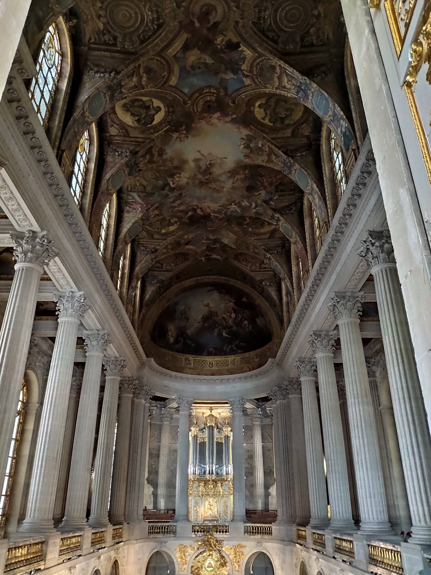 La Chapelle de Versailles, véritable bijou du château est malheureusement fermé, on peut quand même l’apercevoir depuis l’extérieur. L’autel et l’orgue sont magnifiques, ainsi que le plafond que l’on peut voir depuis le premier étage. Quel dommage que l’on ne puisse entrer et l’apprécier à sa juste valeur.