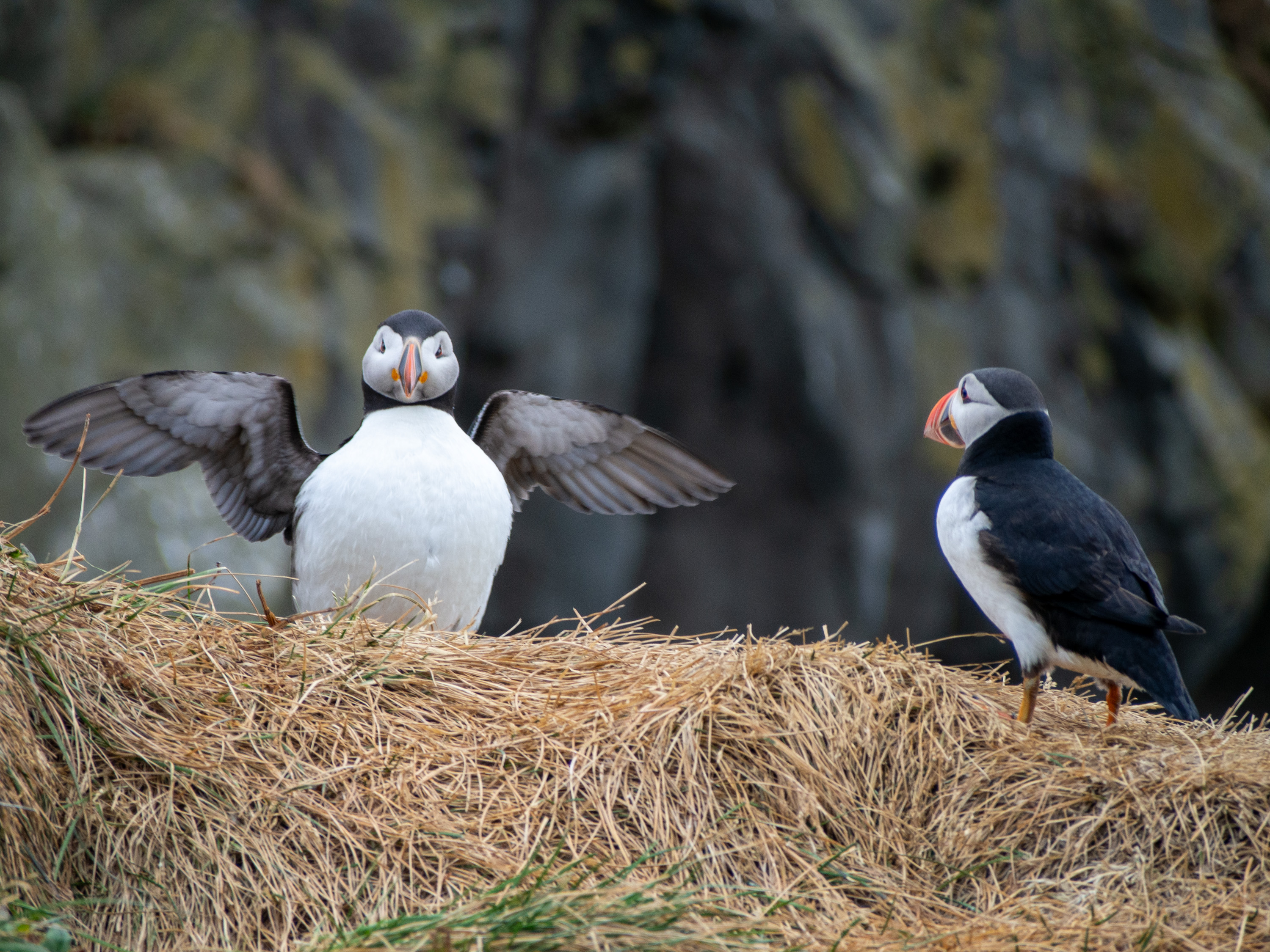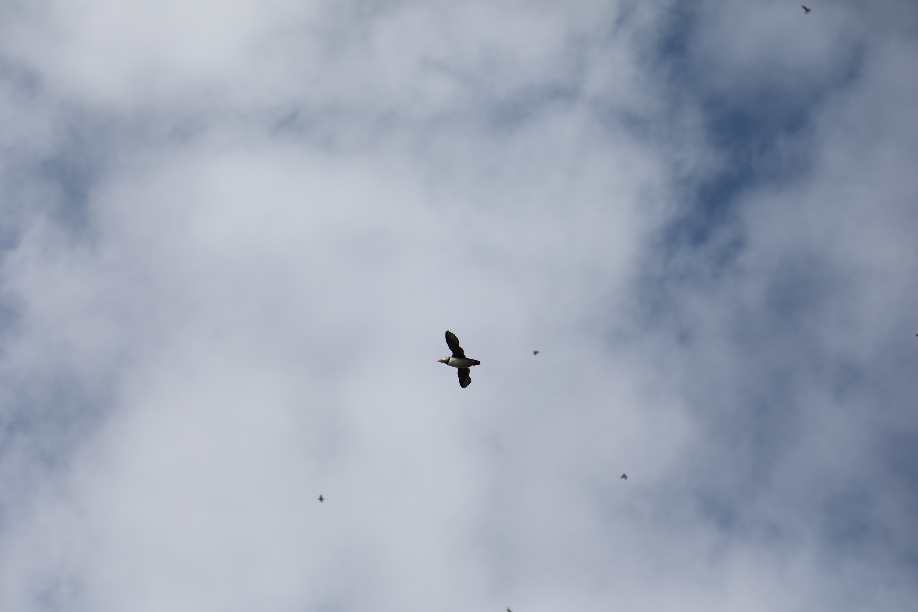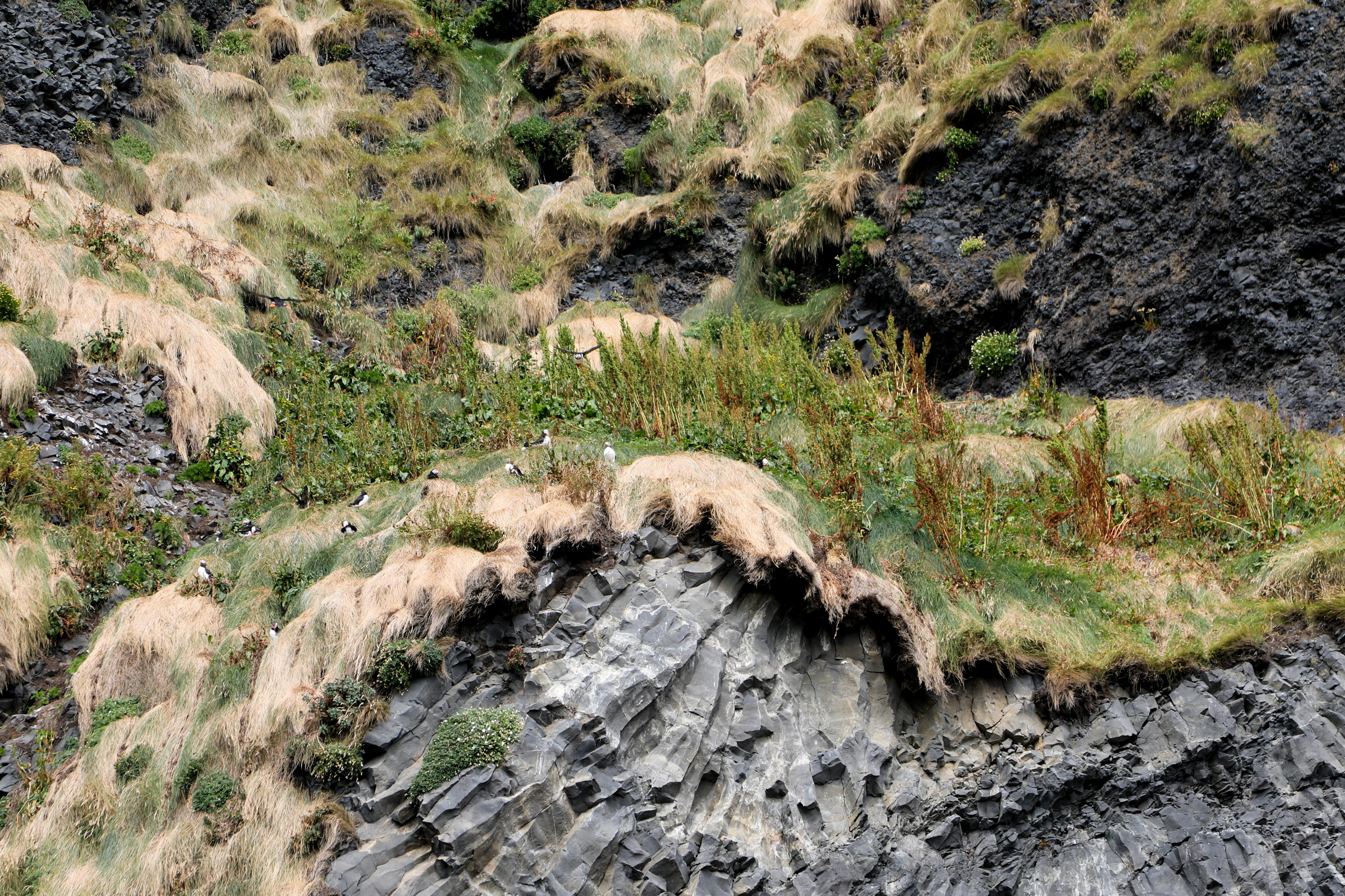 Les falaises abritent une colonie de macareux qui sont très actifs, ils volent au-dessus de nos têtes et il faut faire attention aux déjections.