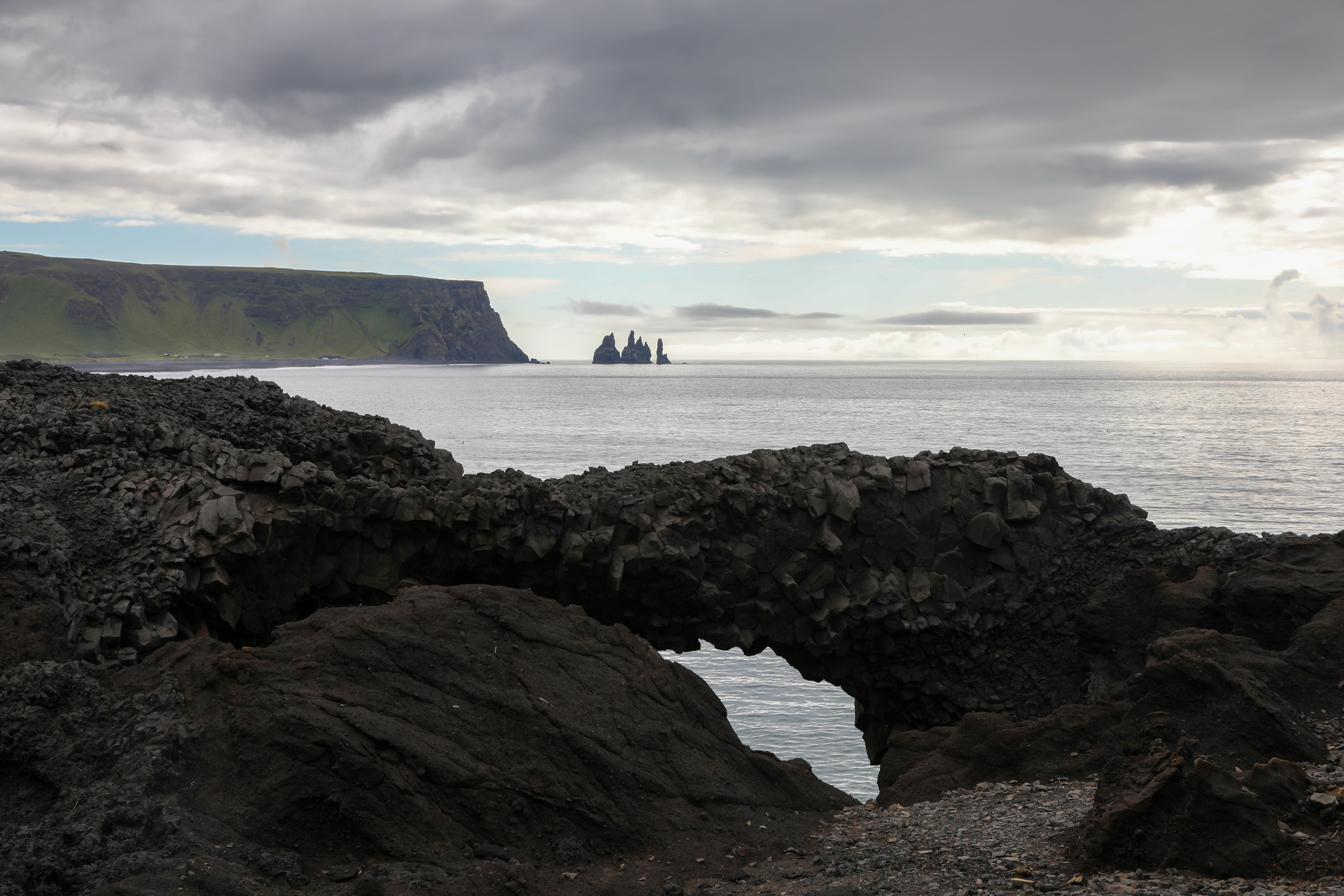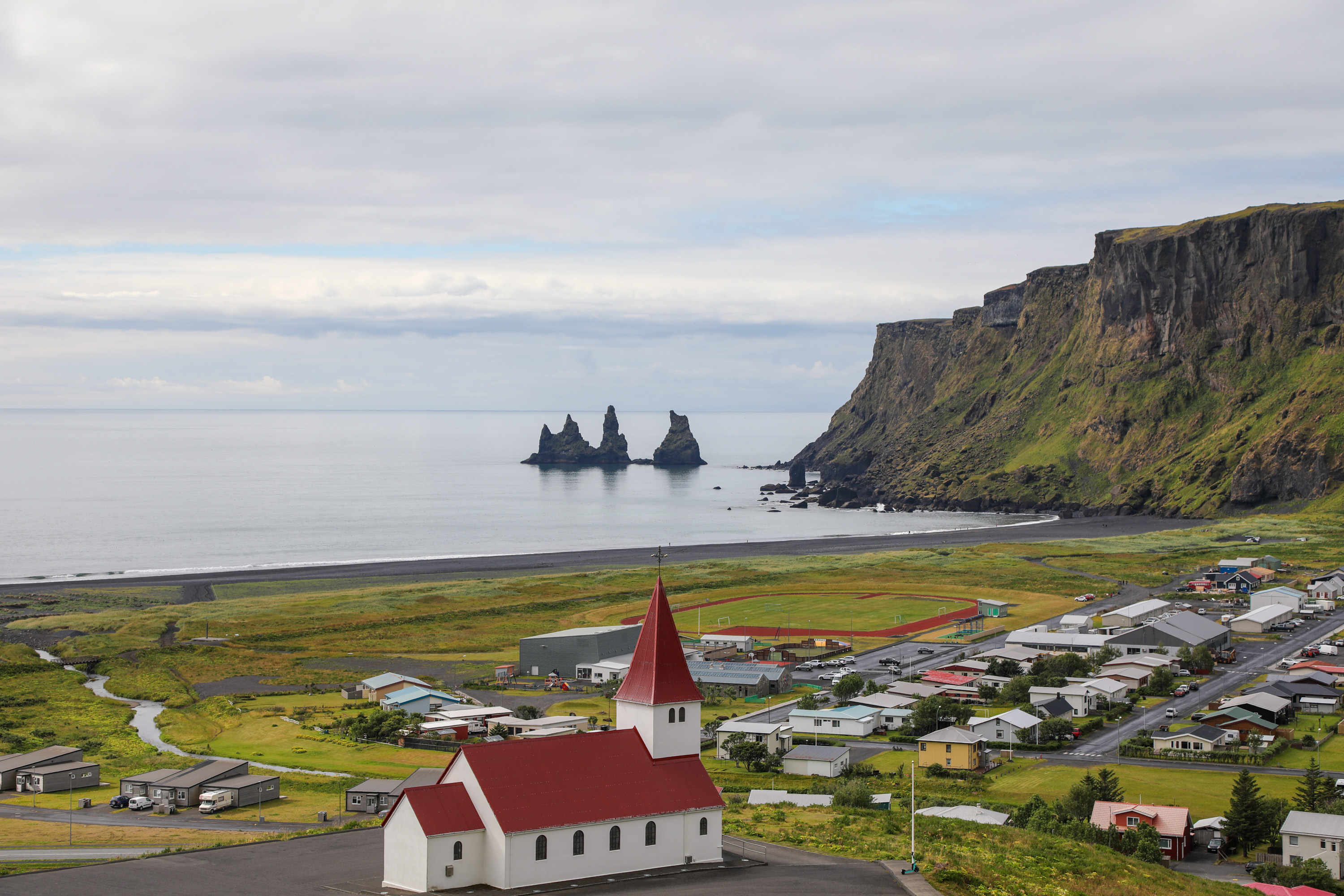 Après une belle matinée au plus près des macareux, le temps se met subitement à virer à la pluie. Les gouttes commencent à tomber et on se réfugie juste à temps dans la voiture. On profite de cet intermède pluvieux pour remplir une tache logistique importante, nous partons pour Vik afin de faire nos premières provisions en Islande. Il faut bien remplir la glacière. On s’arrête au Kronan de la ville et on découvre que la légende sur les prix des produits alimentaires en Islande n’est pas infondée, c’est vraiment hors de prix ! Il y a quand même de quoi s’arranger, avec les prix sur la charcuterie et le pain qui sont assez raisonnables, les produits laitiers, et certains fruits. Le temps de faire les courses que l’on sort et une autre légende Islandaise qui se vérifie, le temps a déjà changé et maintenant le soleil est de retour. Génial ! On décide de prendre la voiture et de se garer en hauteur du village au niveau du cimetière pour se faire un pique nique face à la baie de Vik avec l’église du village sous nos yeux. L’endroit est parfait.
