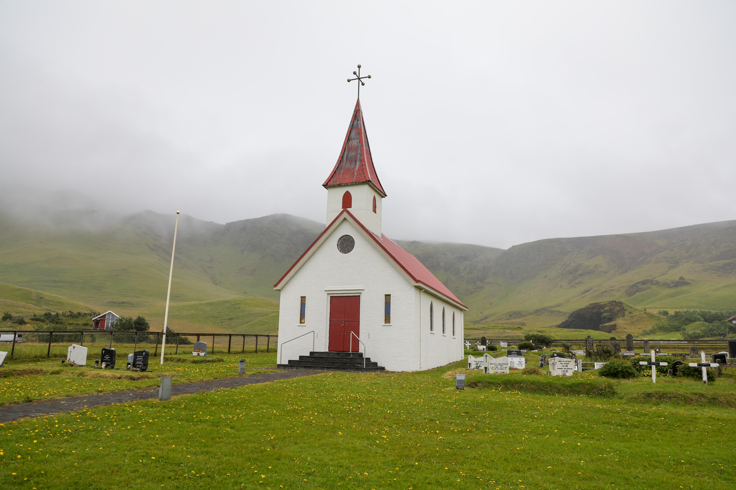 Encore une fois, la météo est changeante. Toujours sans prévenir, la pluie vient nous surprendre. On remonte dans la voiture, on joue au chat et à la souris avec les gouttes aujourd’hui, on se dit que ce jeu risque de durer une dizaine de jours, en tout cas pour le moment on a eu de la chance. La pluie est fine mais elle mouille bien. On s’arrête sur le chemin a une petite église installée au milieu d’un cimetière. Sans prétention aucune, elle est tout mignonne avec ses murs blancs et son toit rouge, très typique des églises d’Islande.