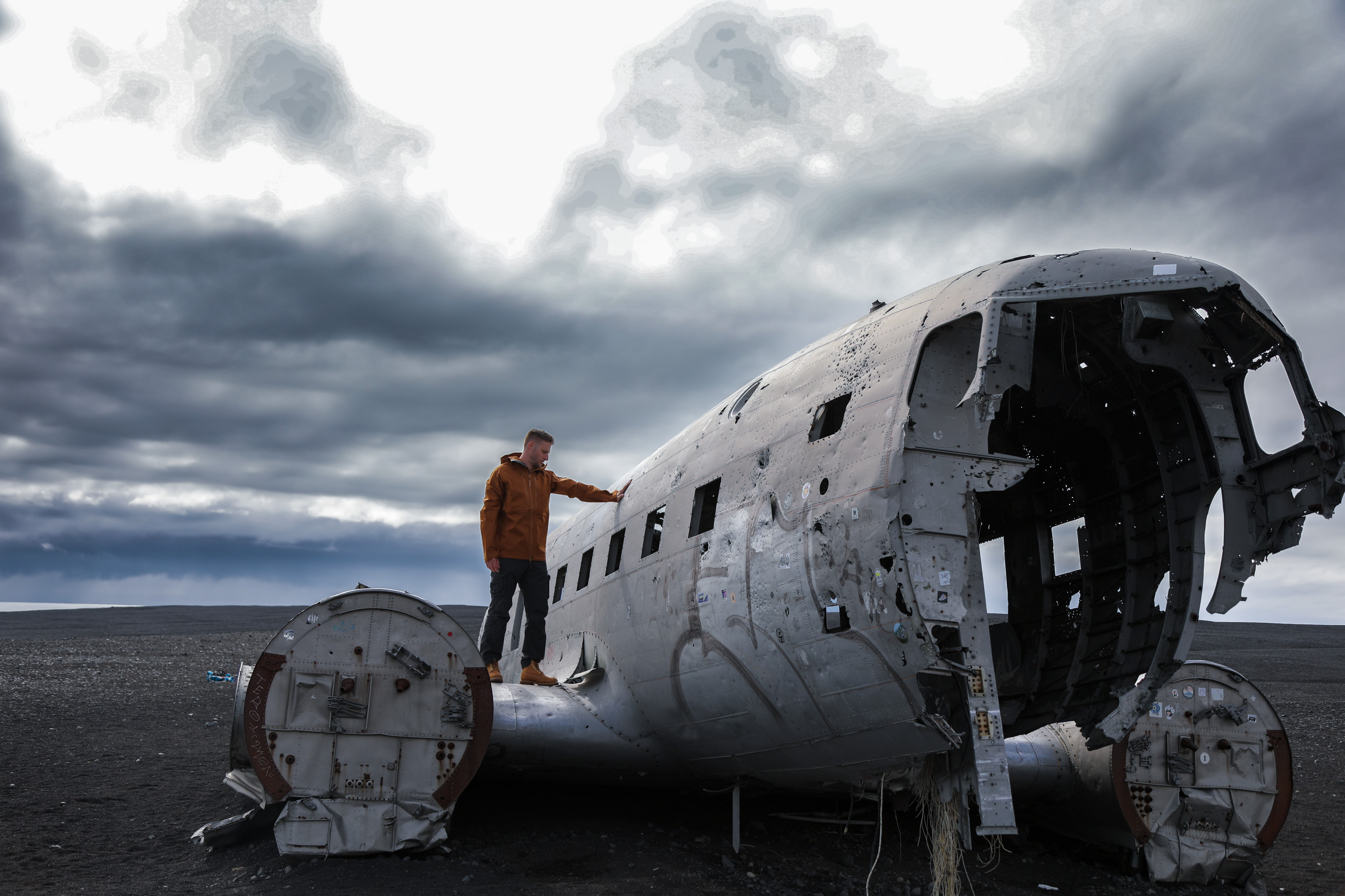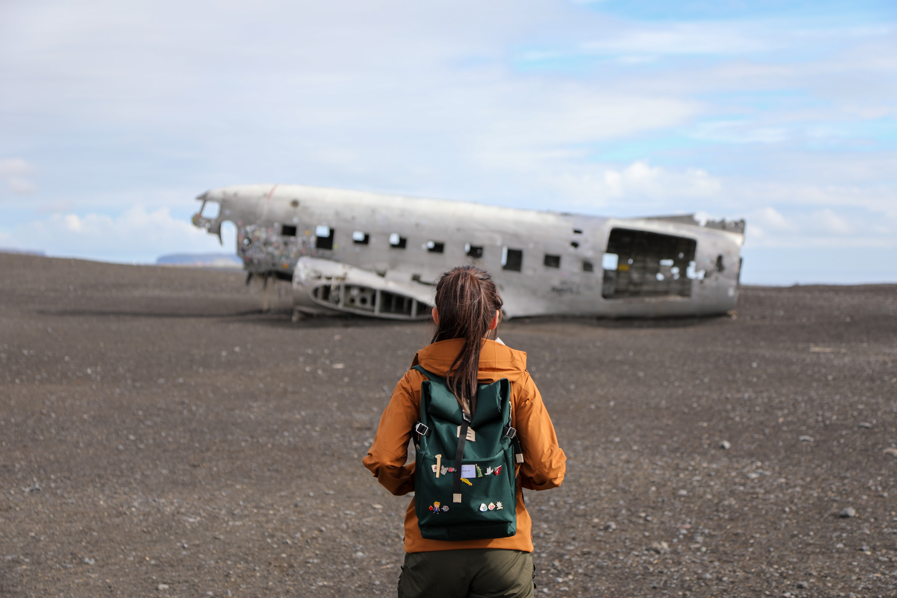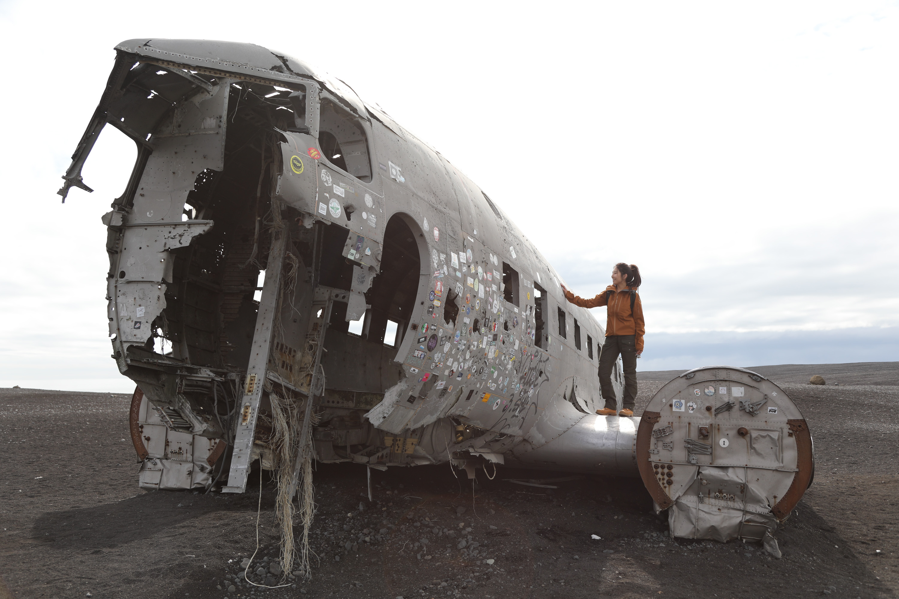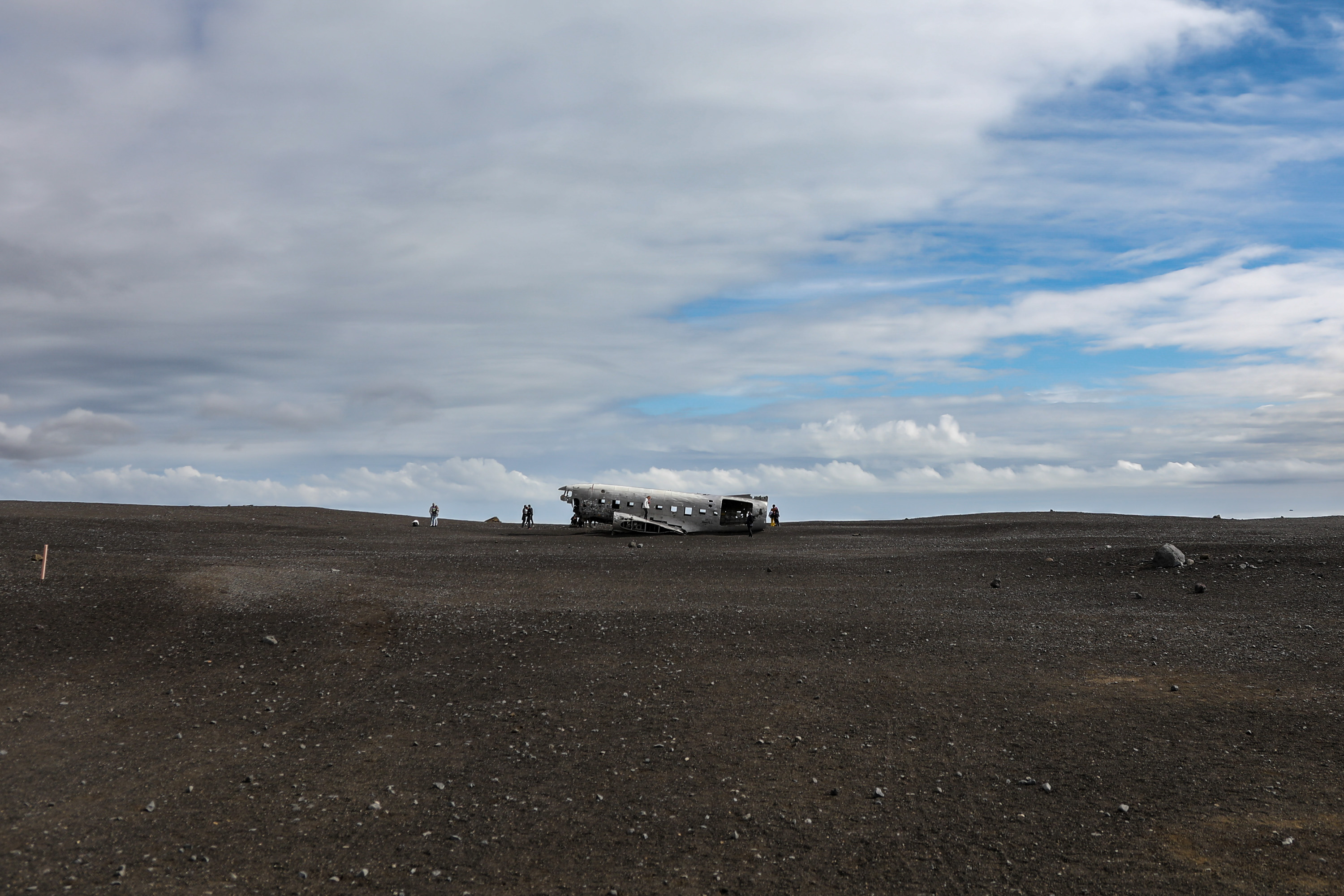 Nous ne roulons que quelques minutes et le temps a déjà changé. On se gare sur un parking au milieu de nulle part au bord de la route N1. Il y a déjà pas mal de voitures ici et pourtant il n’y a rien à l’horizon, on est au milieu d’une plaine hostile avec aucune végétation. Que vient on faire ici ? Nous préparons notre sac sans oublier d’y ranger le pantalon de pluie et la veste coupe vent. On part marcher jusqu’à l’épave de l’avion écrasé de Solheimasandur. La marche est monotone et dure plus d’une heure jusqu’à arriver à la carcasse de cet avion US Navy Douglas C-117D de l’US Air Force, qui a subi une avarie en 1973.