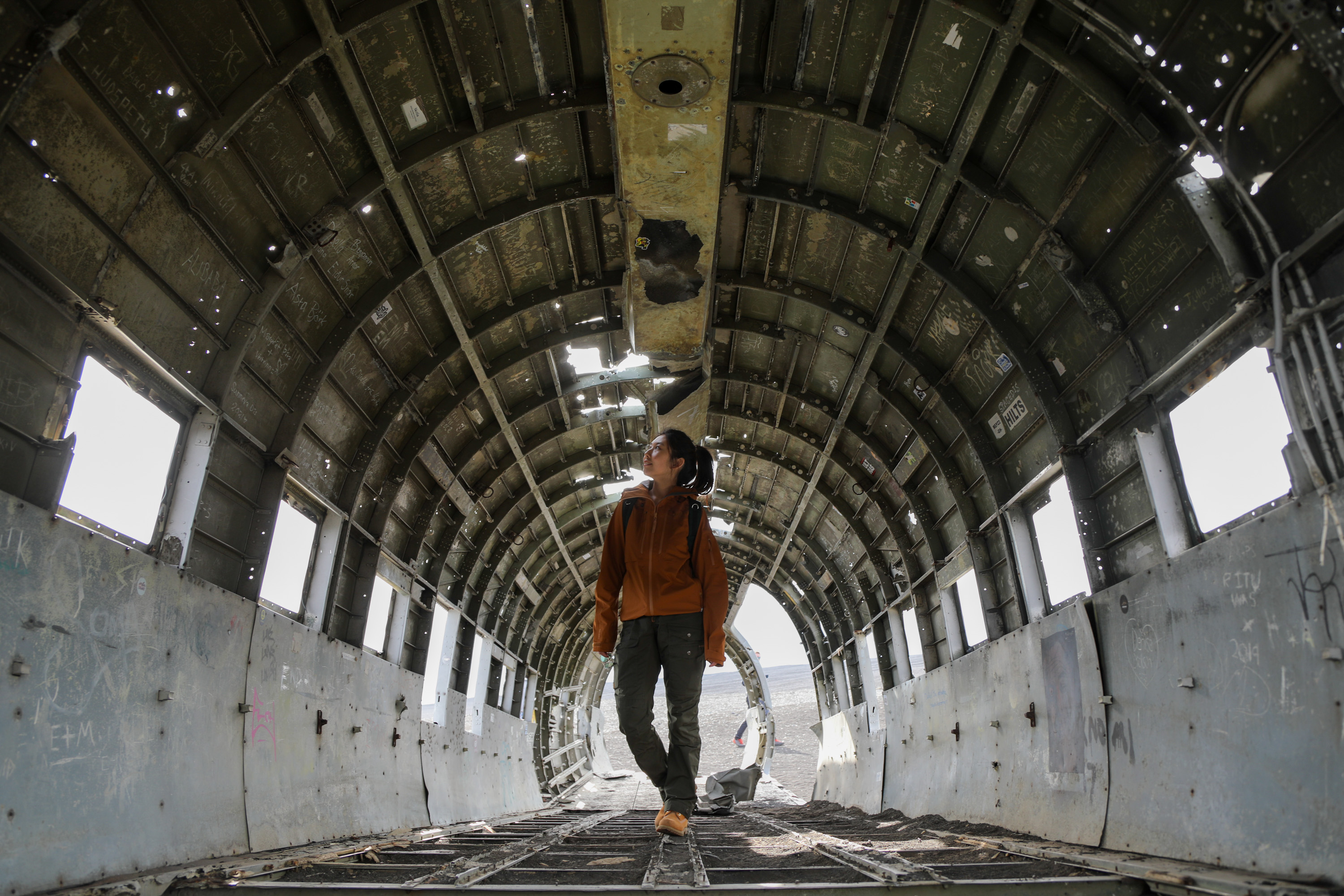 La vue de cet avion abimé au milieu de ce désert de pierre est frappante.