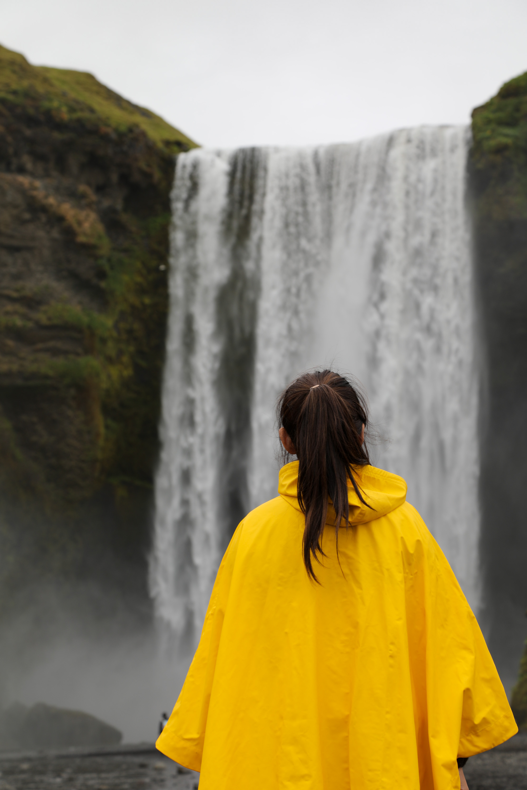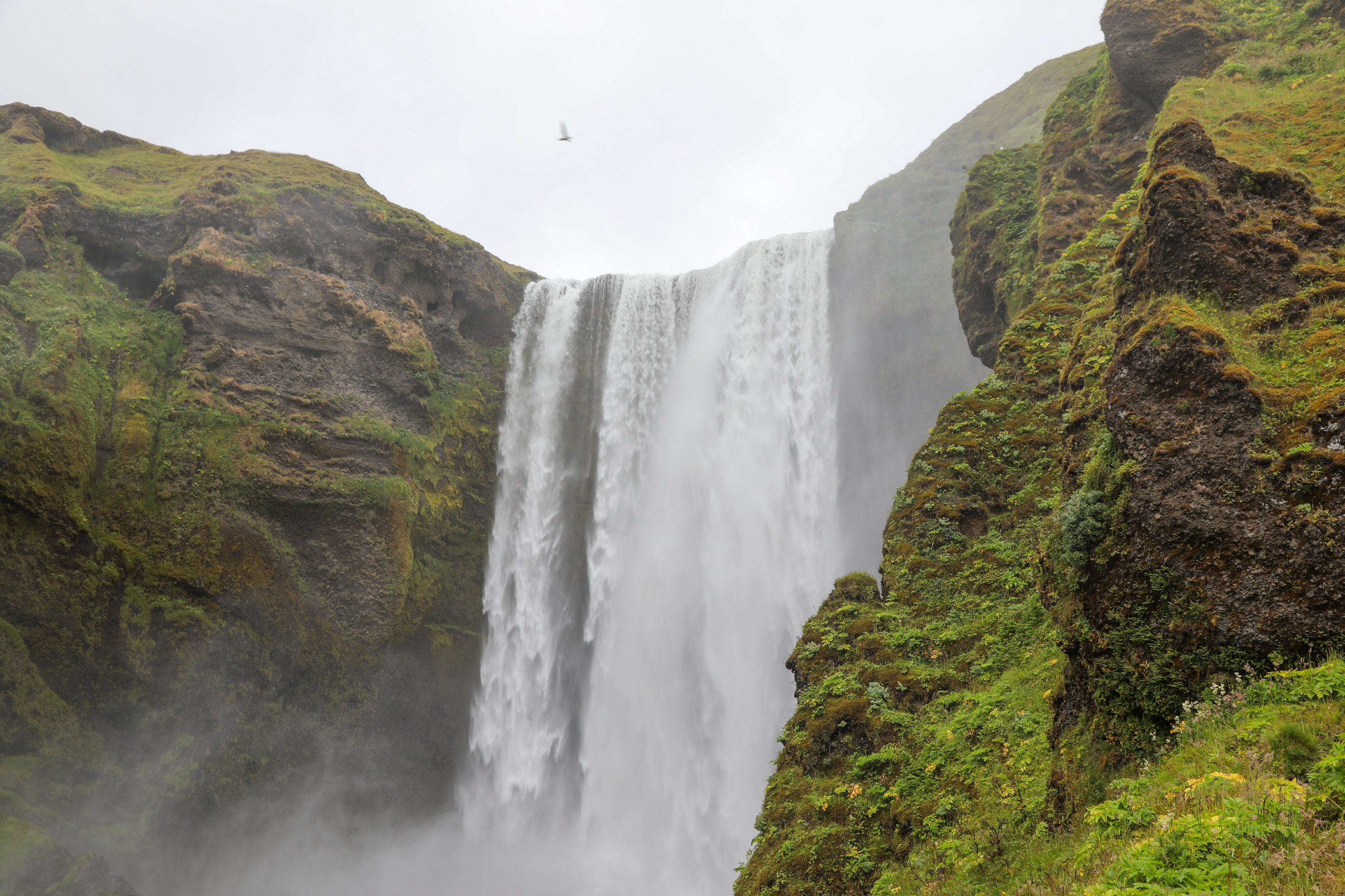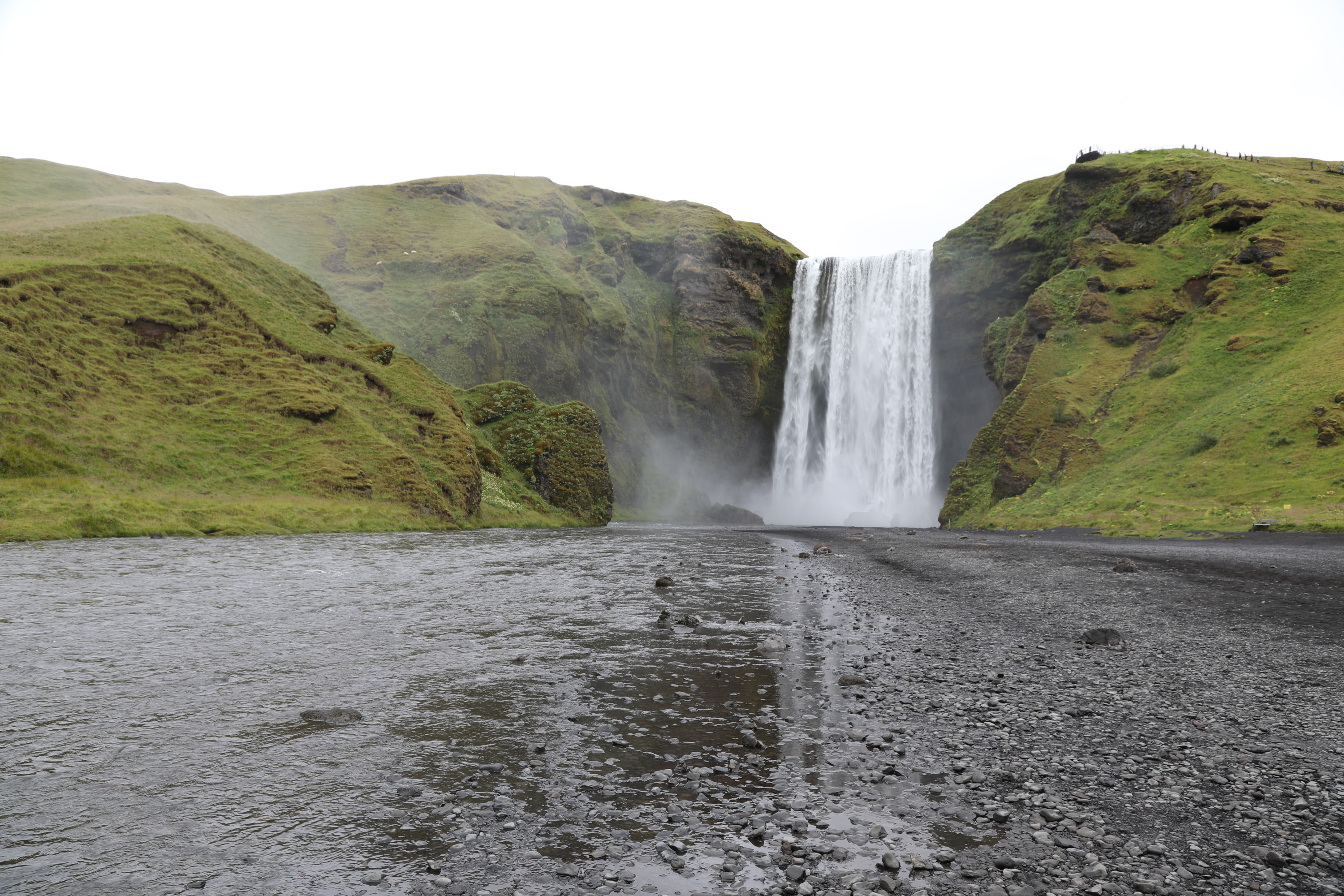 La pluie revient plus vite que l’on croit et cette fois ça ne ressemble pas à de la bruine. Le nuage est bien sombre, et sous le nuage, on ne distingue plus qu’un rideau gris qui tombe jusqu’au sol. Il faut que l’on rebrousse chemin car on risque de se retrouver sous une grosse pluie et trop loin de la voiture avec aucun endroit pour s’abriter. On marche le plus vite possible mais on ne peut éviter la douche et on enfile à toute vitesse au dernier moment nos sur pantalons et veste de pluie qui finissent trempés. Heureusement ces vêtements sont bien faits et sous ces vêtements sont toujours secs. Notre prochaine étape nous amène à la cascade de Skógafoss, une des plus grandes cascades d’Islande.