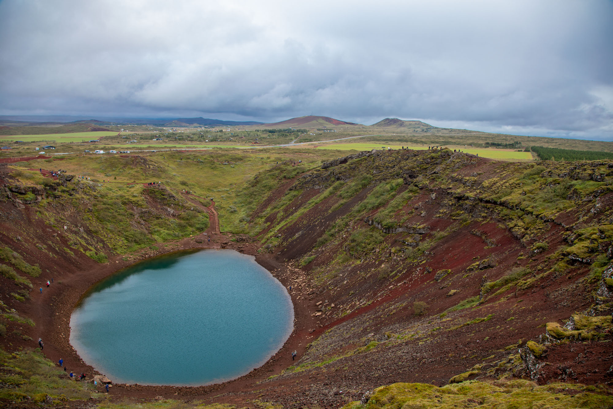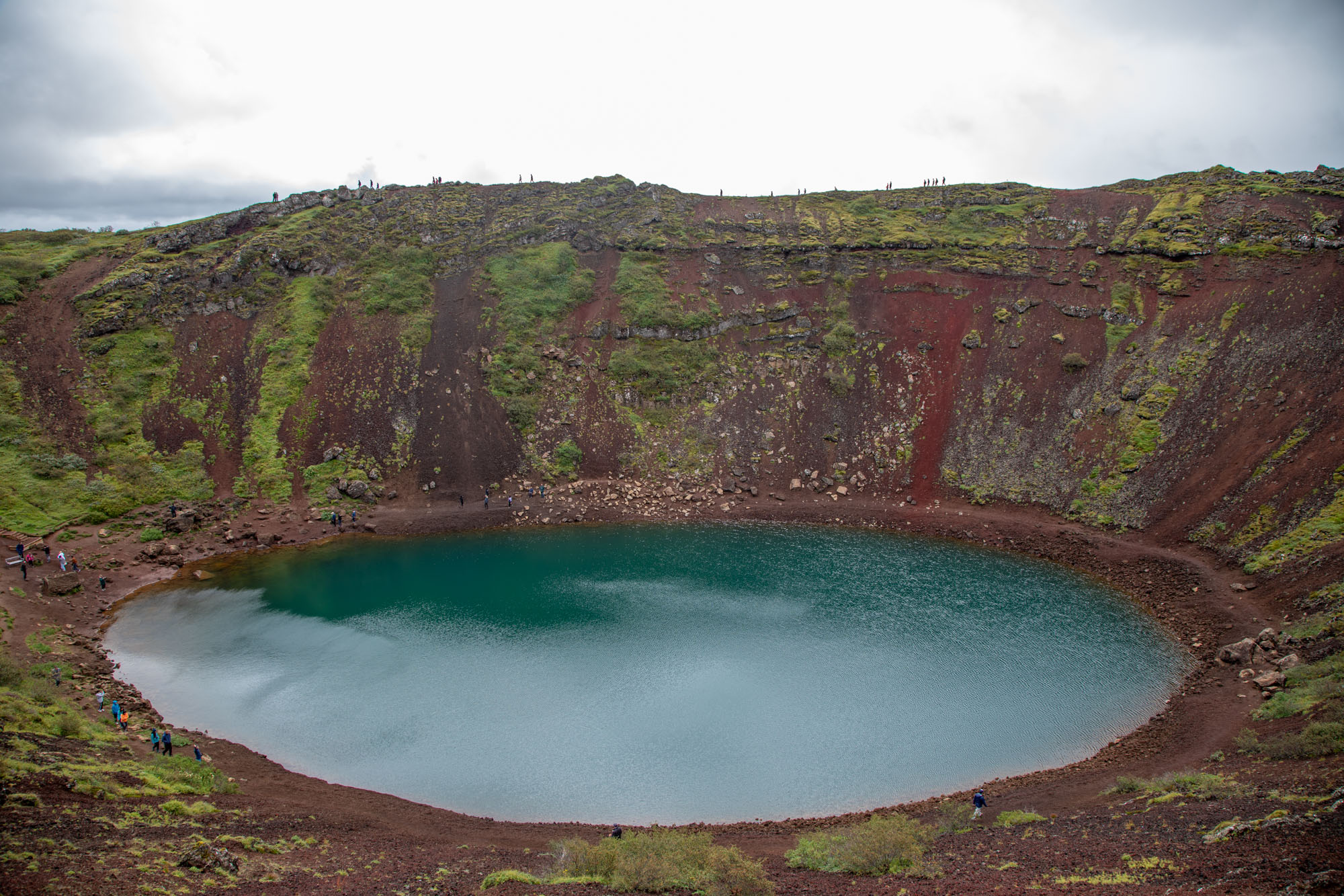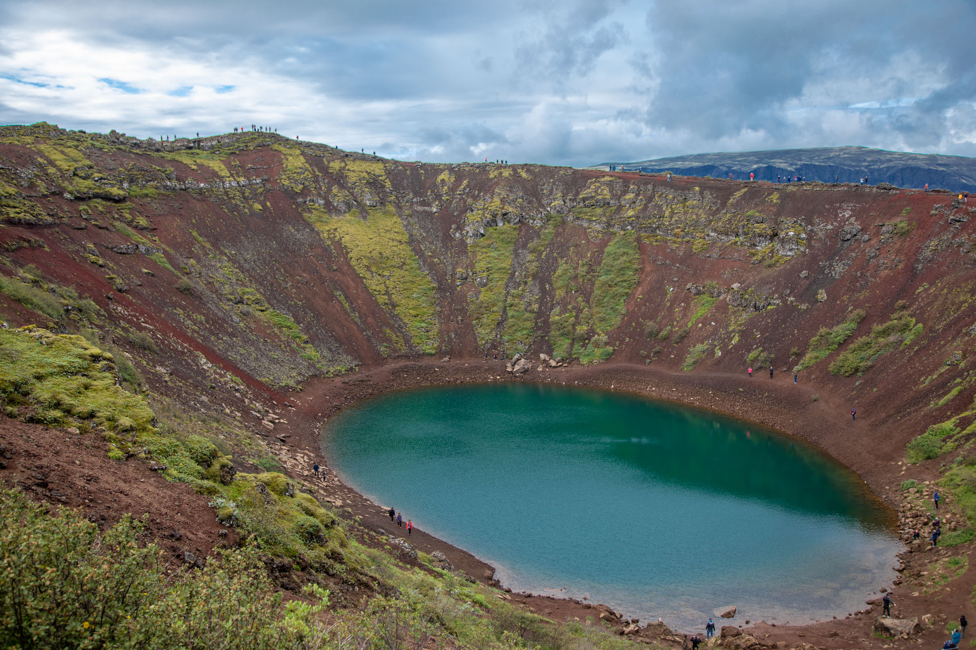 On fait le tour du cratère alors que le vent souffle très fort, il y a une alternance de beau temps et de gros nuages noirs. On voit un rideau de pluie tomber à proximité, on a eu de la chance. Le cratère de Kerid est en tout cas une jolie petite étape sur le Cercle d’or, avec des couleurs vraiment étonnantes.