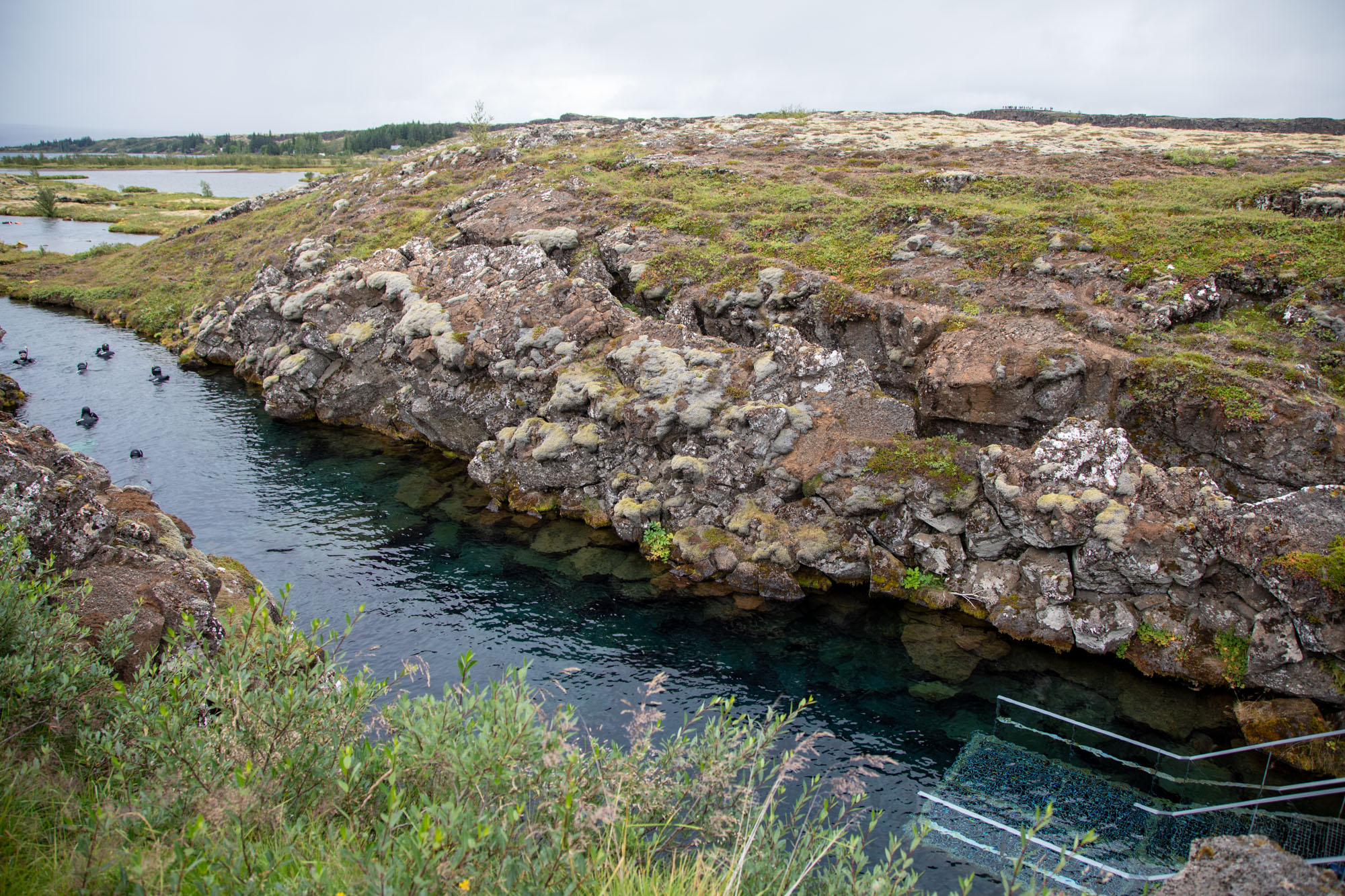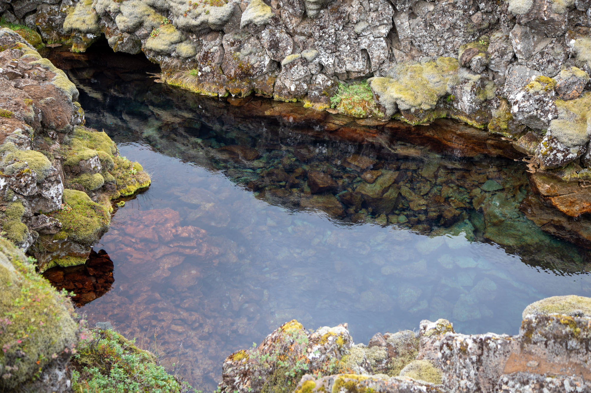 On arrive à la faille de Silfra, connue comme un des meilleurs spots de plongée du monde du fait d’exceptionnelle transparence de l’eau qui s’écoule entre les deux plaques continentales, ce qui a une grande valeur symbolique. Le prix de l’activité est quand même de plus de 160e par personne alors on n’était pas sur d’y aller, on n’est pas très motivé de payer si cher pour avoir très froid… On se laisse convaincre mais finalement il n’y a pas de combinaisons à ma taille donc on se dit que l’on fera cette activité lors d’un prochain voyage en Islande. Depuis la surface l’eau est en tout cas déjà capable d’apercevoir la pureté de l’eau.