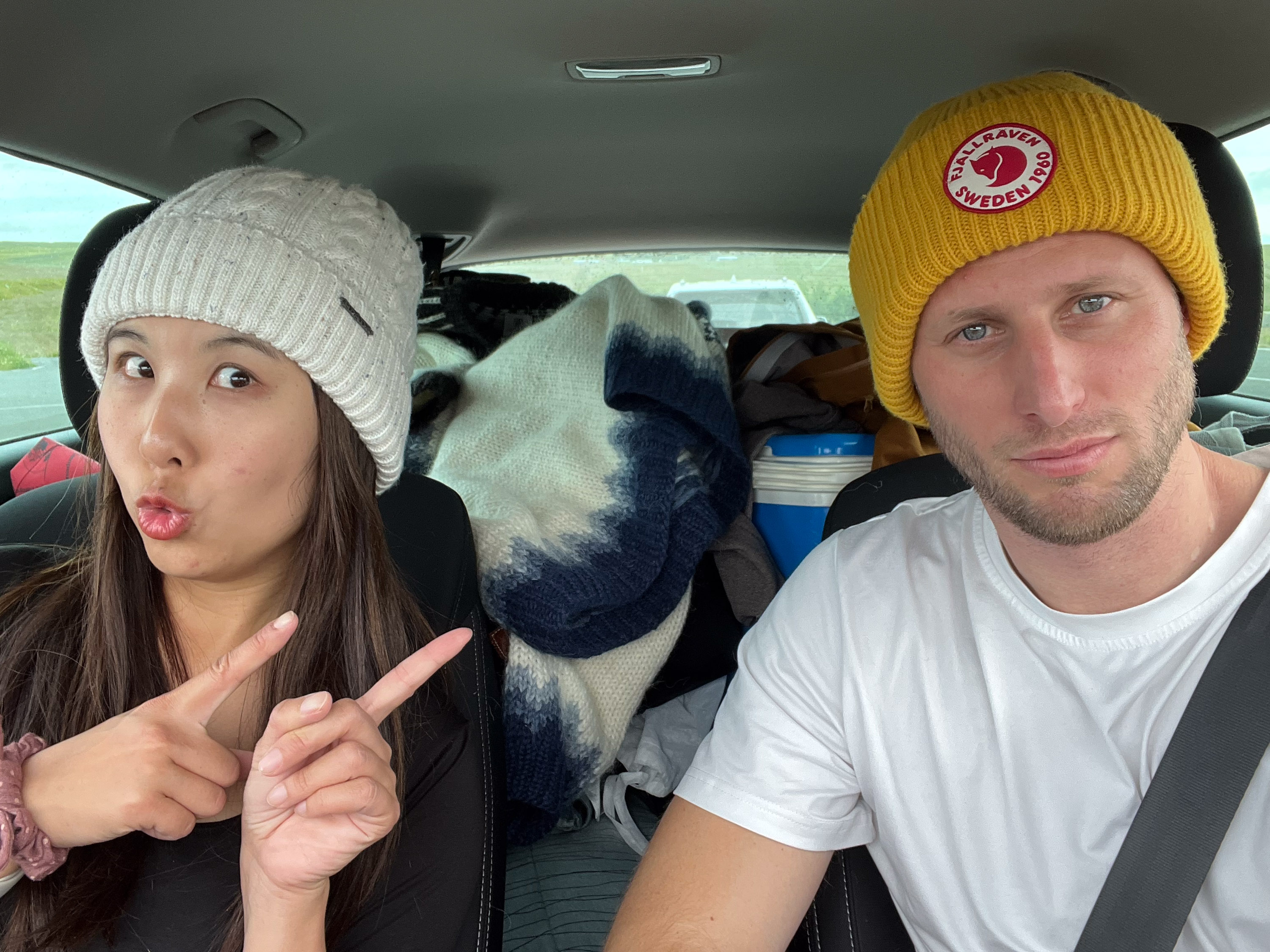 On profite du grand parking de la cascade pour faire un petit peu de rangement. En effet, ici il faut faire un petit aparté concernant notre organisation pour la voiture avec tout le matériel. On a donc loué un 4x4 avec une tente sur le toit et qui était équipé avec un peu de matériel par le loueur pour faciliter le camping, des coussins, une couette, une glacière, des chaises et une table. Sauf qu’en ajoutant nos grosses valises remplies d’habits pour affronter les éléments déchainés d’Islande, et enfin tous les achats que l’on a fait au fur et à mesure des étapes, ça devient un vrai bazar. La voiture est remplie à ras bord et on se dit qu’il est vraiment temps de faire un peu de réorganisation.