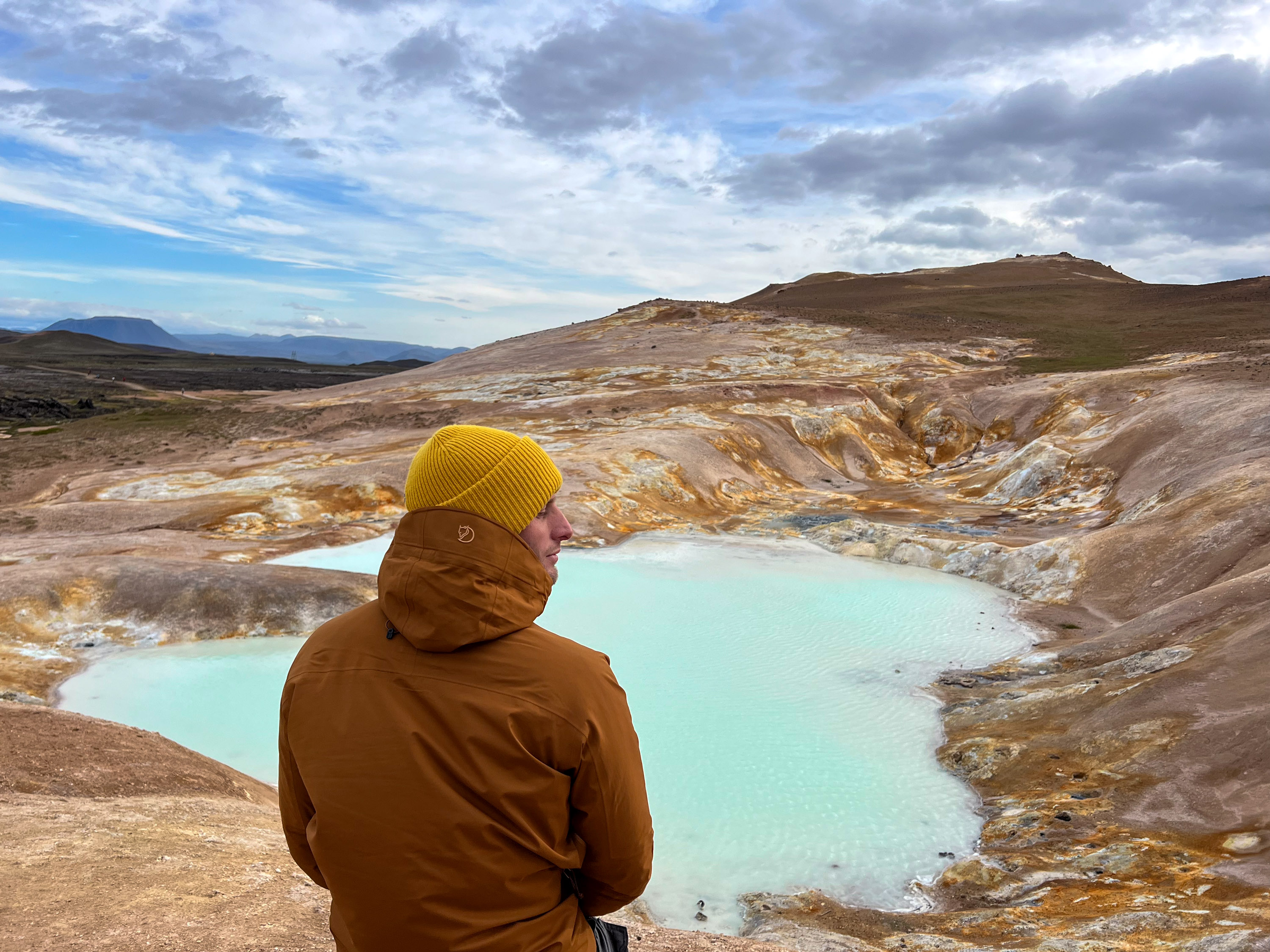 On se met en marche autour de la lèvre du cratère. Le cratère de Krafla contient un grand lac d’un bleu intense. Le vent qui souffle sur l’eau créé des formes hypnotiques fascinantes.