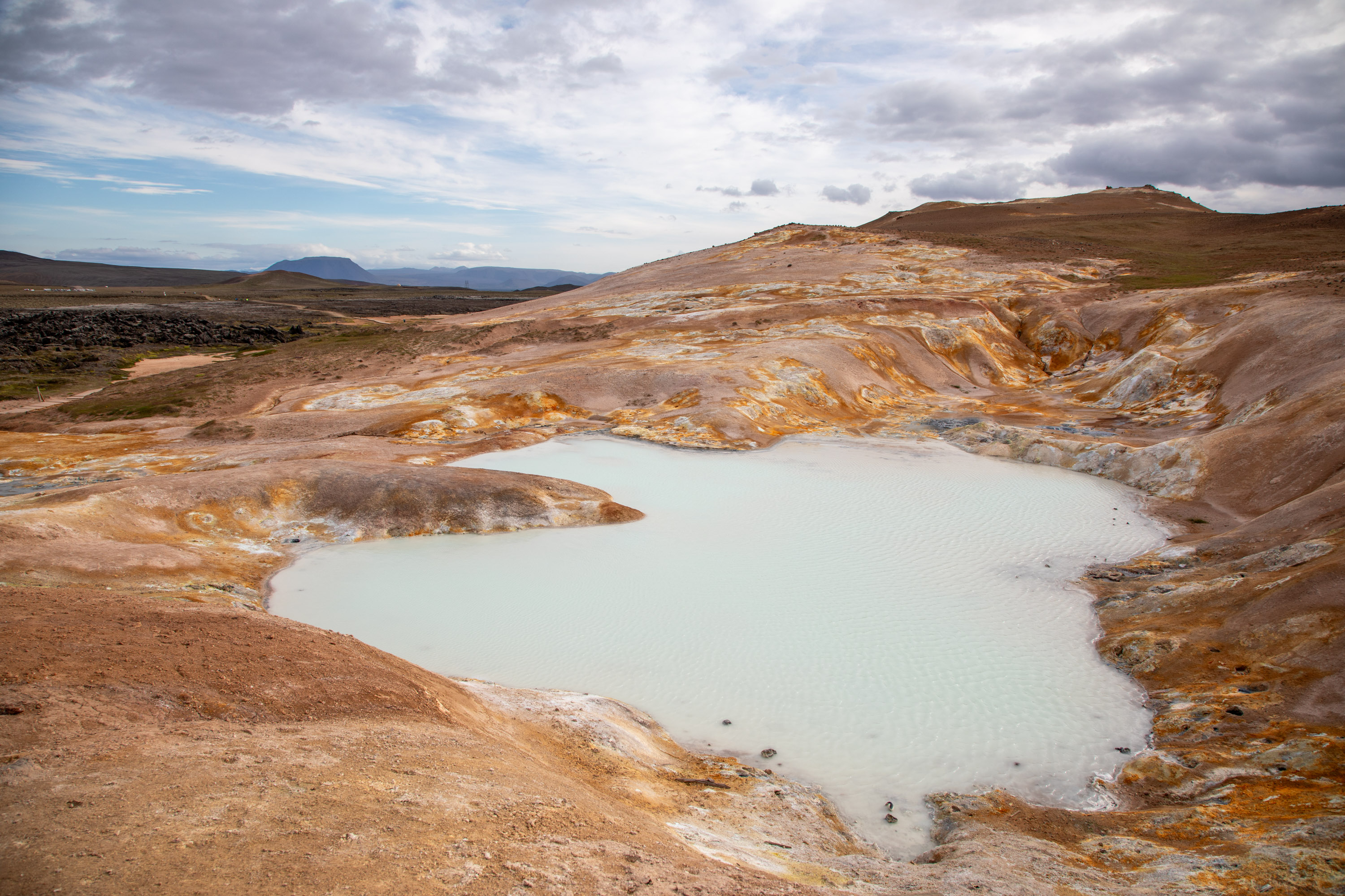 On roule maintenant jusqu’à Myvatn, cette ville fait partie des plus touristiques du pays et en arrivant sur la route qui contourne le lac on comprend pourquoi Myvatn est aussi attrayante pour les voyageurs. La route longe les rives du lac couvertes d’herbe bien verte et on est stupéfait par tous ces cônes de volcan éteints qui s’élèvent au-dessus de l’eau. C’est une autre image de l’Islande encore, un paysage vraiment unique qui tranche avec tout ce que l’on a vu jusqu’à maintenant. On reviendra explorer la région le lendemain, en attendant on roule jusqu’à une zone géothermique intense à la sortie du village. On s’arrête au parking du cratère du volcan de Krafla. Le vent souffle tellement fort qu’on a l’impression que l’on va décoller, c’est très difficile de s’extraire de la voiture avec la portière qui est repoussée. Le paysage est désolé tout autour de nous.