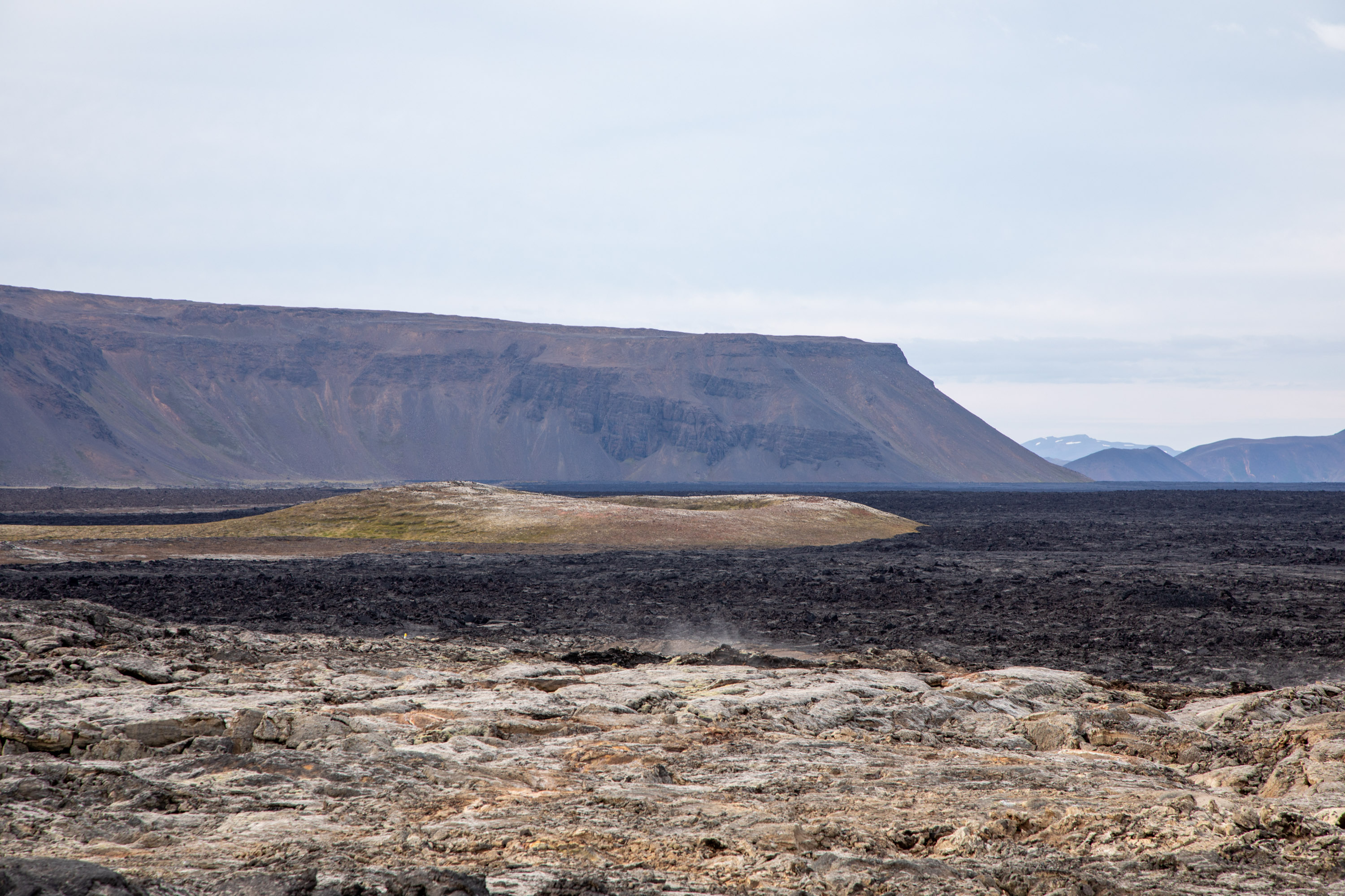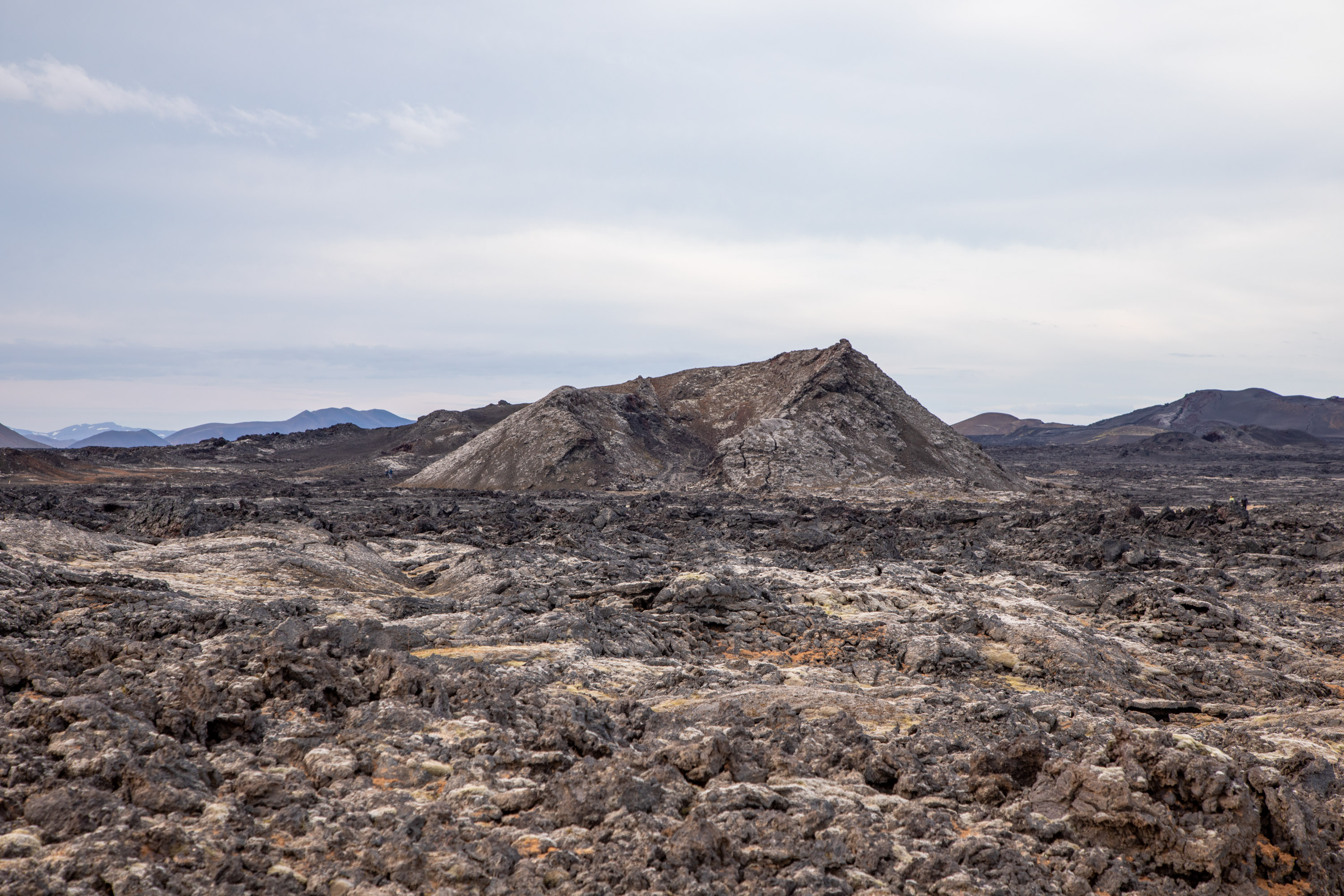 On peut sortir du chemin pour s’aventurer au coeur d’un champ de lave noir qui déroule devant un paysage infernal.