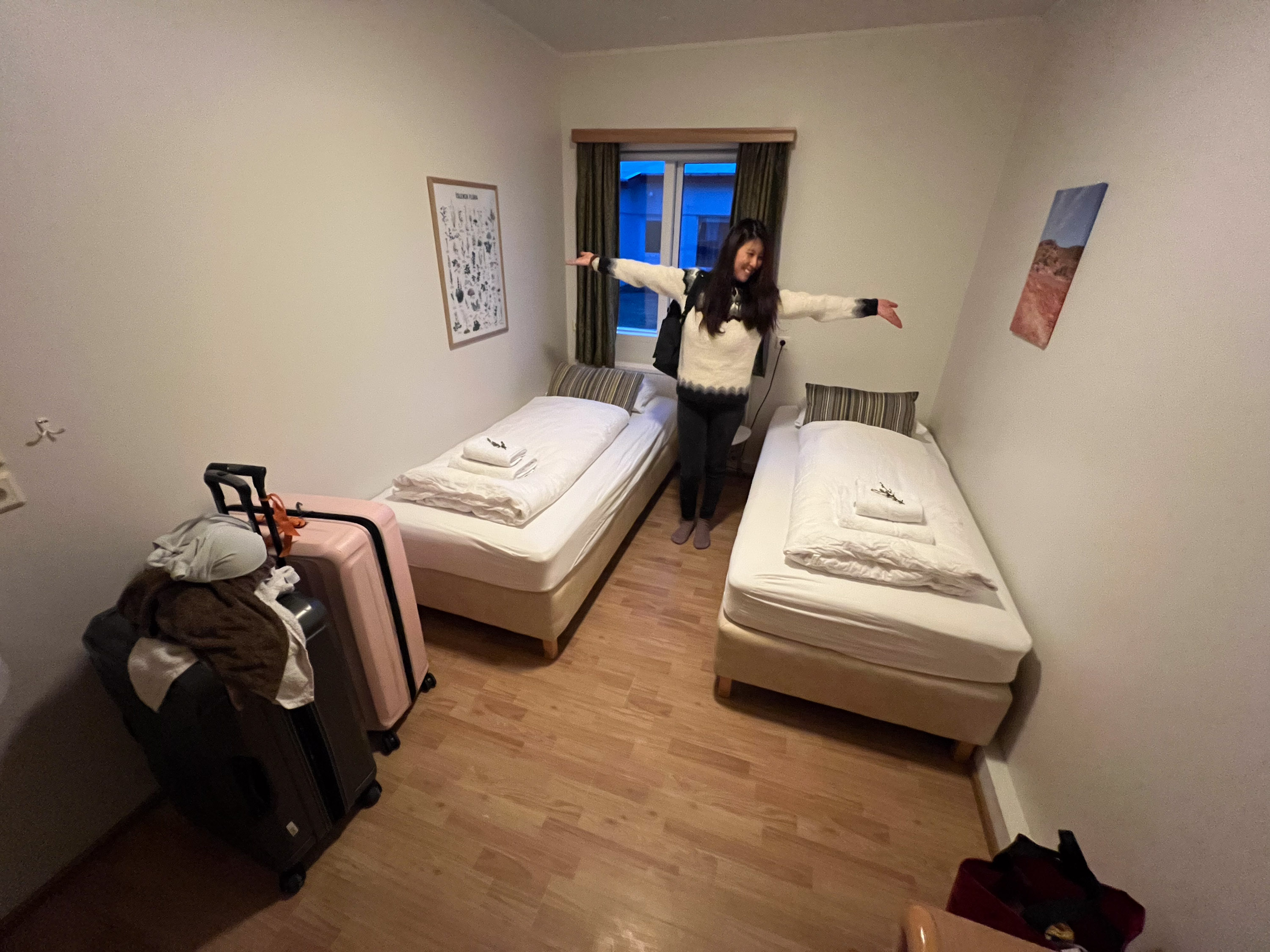 Après cette superbe ballade, les jambes sont maintenant bien fatiguées. On se dit que l’on va profiter des très longues journées islandaises pour tenter notre chance aux bains de Myvatn Nature Bath. Cela conclura idéalement cette belle journée où l’on a découvert tellement de choses diverses entre cascades, faune sauvage, paysages volcaniques grandioses. On arrive au parking et on est à ce moment là la seule voiture encore garée à cette heure tardive. On ne peut que recommander de venir jusqu’ici en tout cas. On part faire le check-in à l’hôtel à Myvatn pour récupérer les clés car on va passer la soirée aux bains et on risque de rentrer un peu tard. Bonne surprise, on a le droit à une chambre où l’on peut mettre nos deux valises, on commence à se contenter de peu après quelques jours en Islande.
