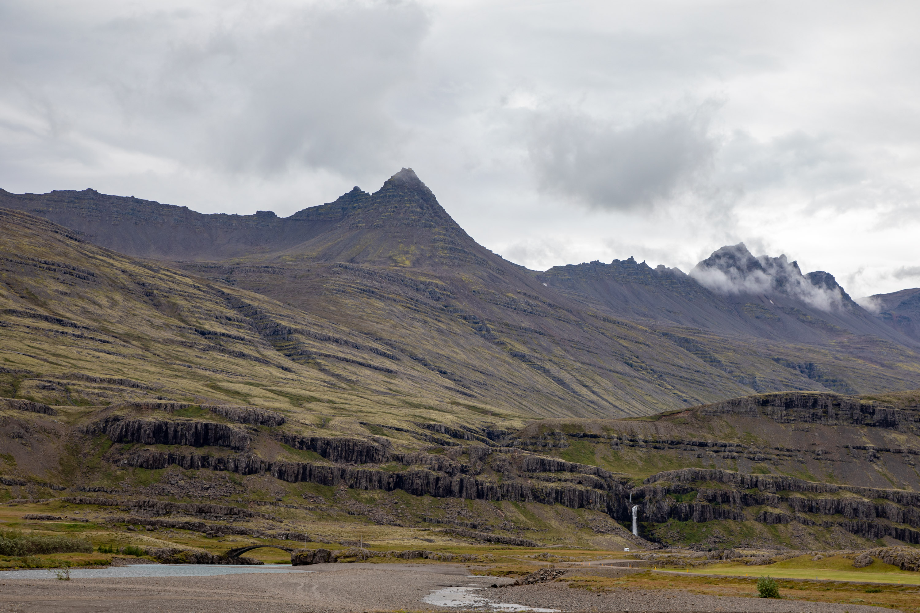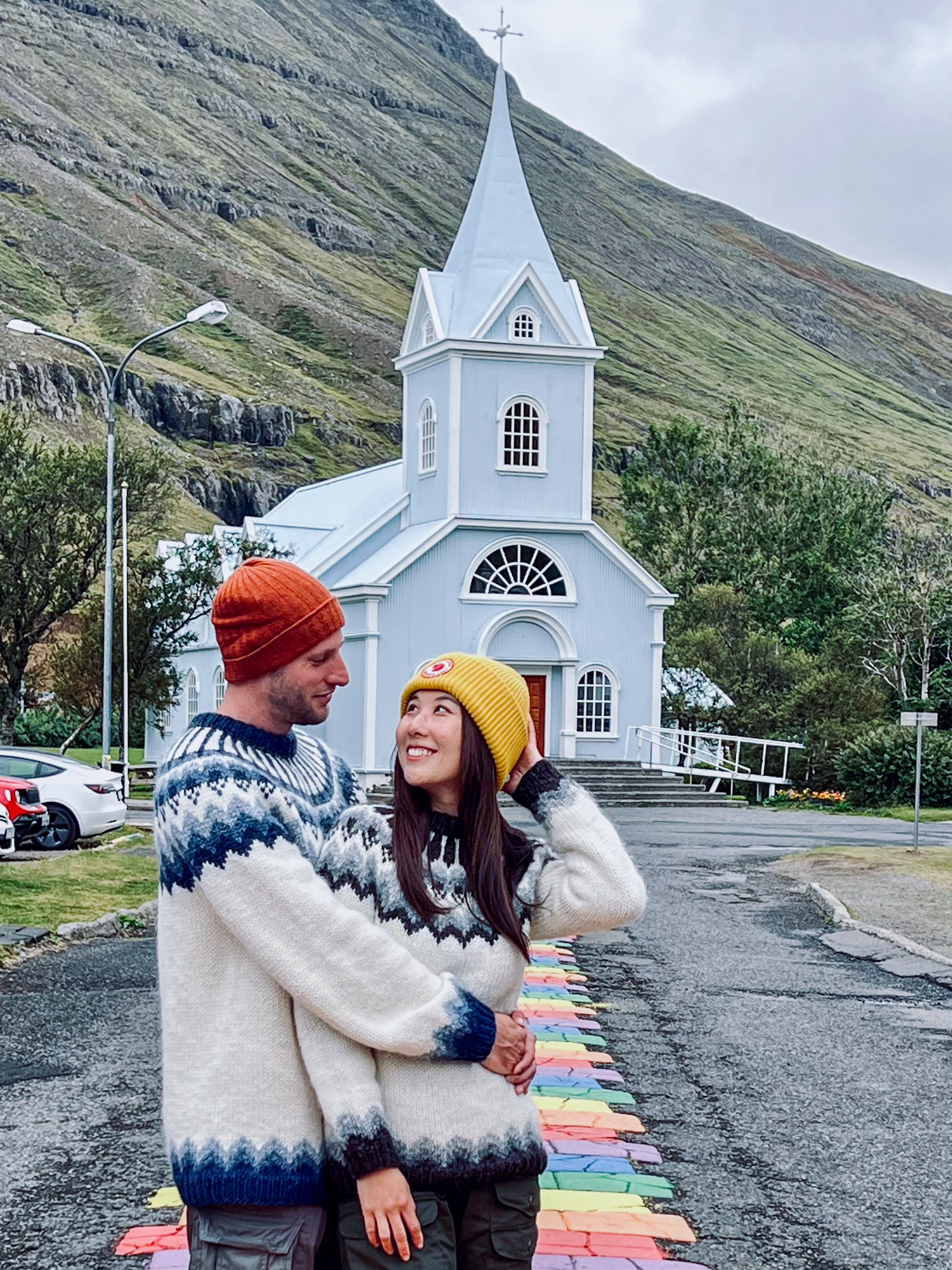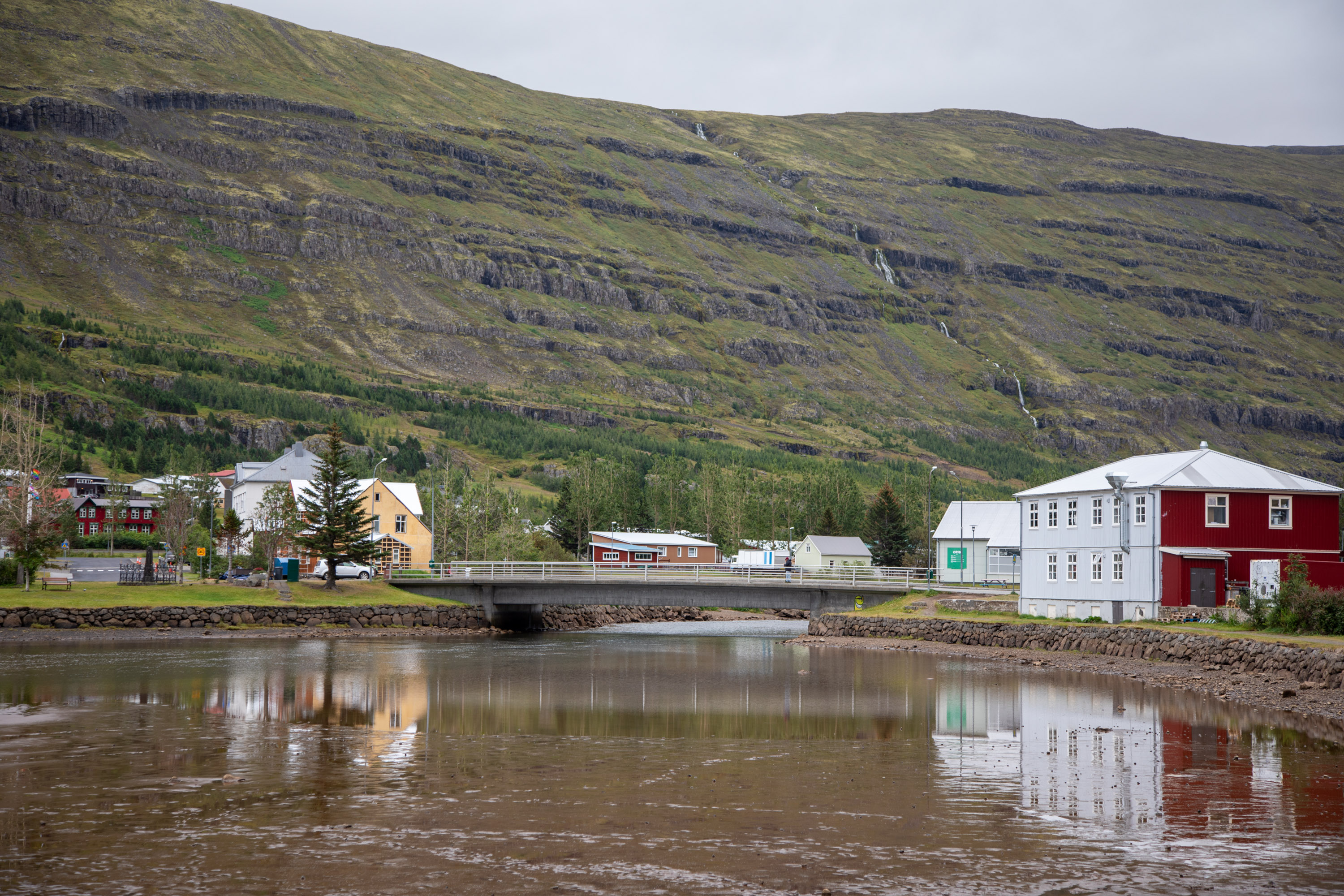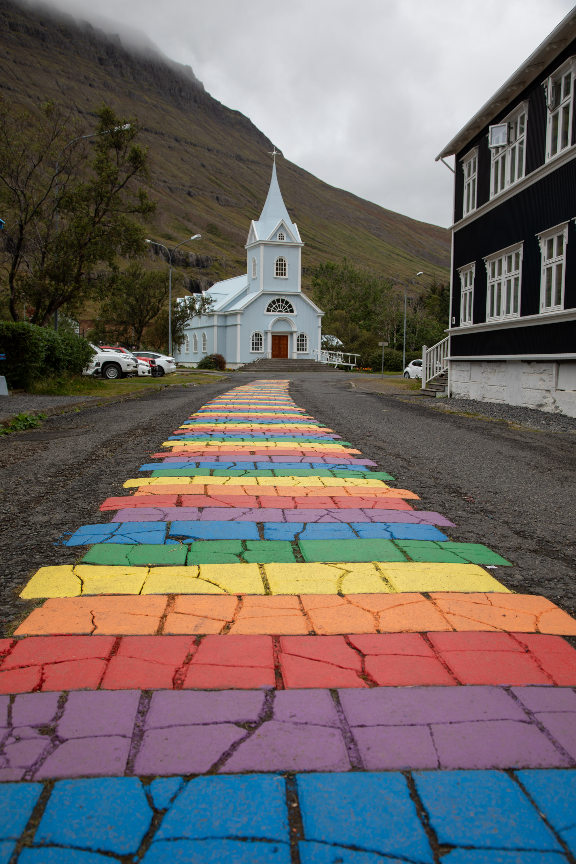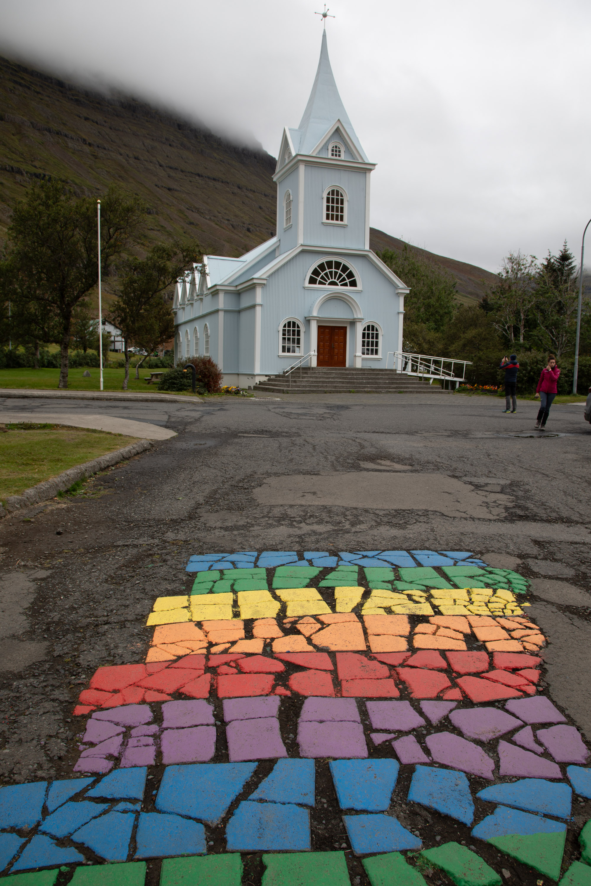 C’est un des villages les plus connus de l’Est de l’Islande et aussi le lieu de débarquement des bateaux de croisière. Il a obtenu une célébrité grâce à sa petite église en bois peinte en bleue et son chemin arc-en-ciel qui parcourt a rue principale. C’es très coloré et ça tranche avec le gris du ciel.
