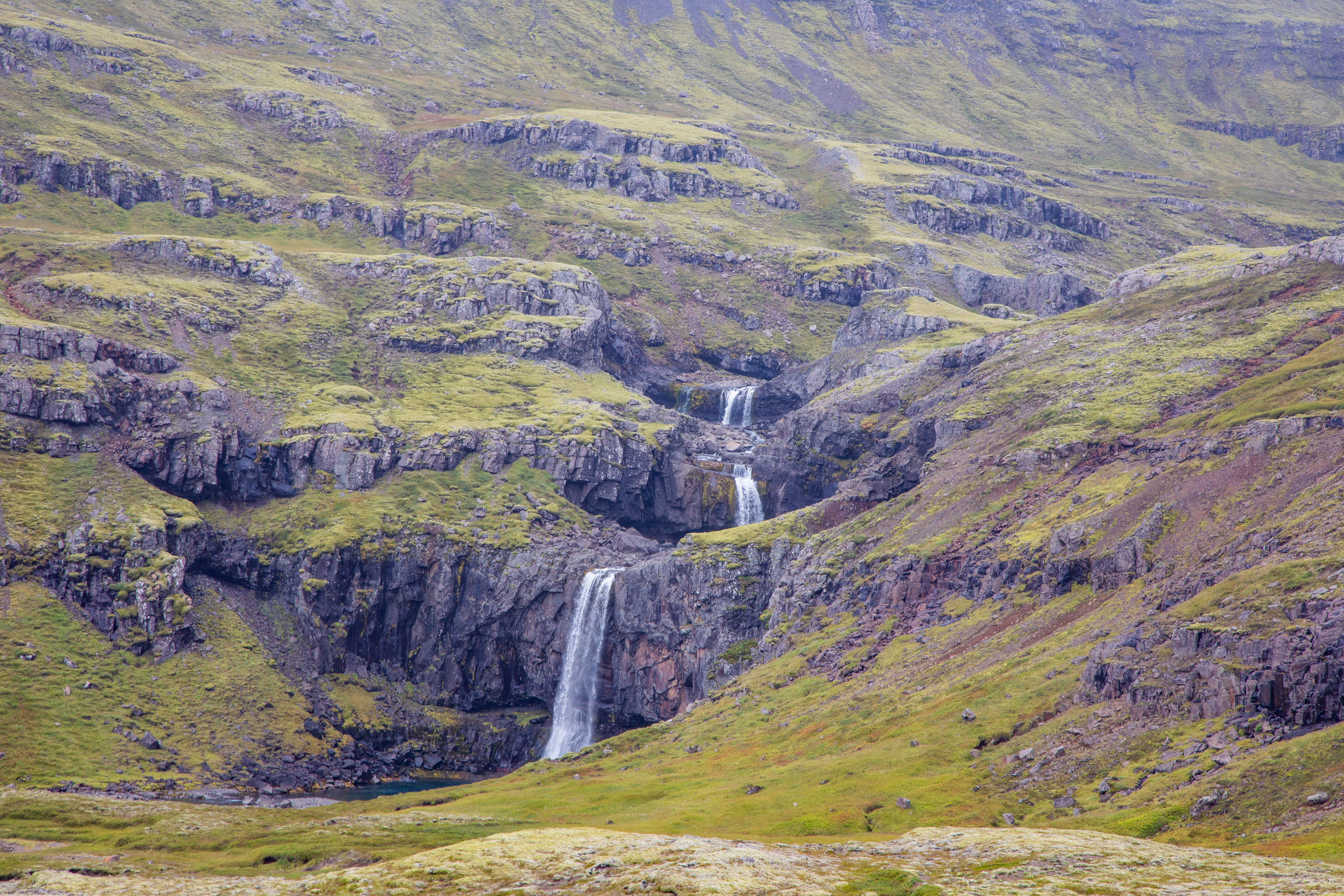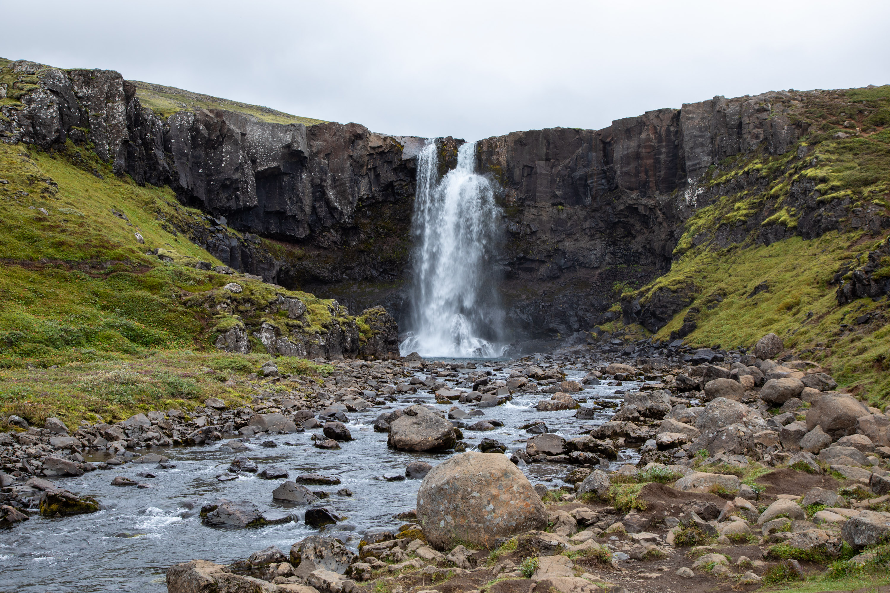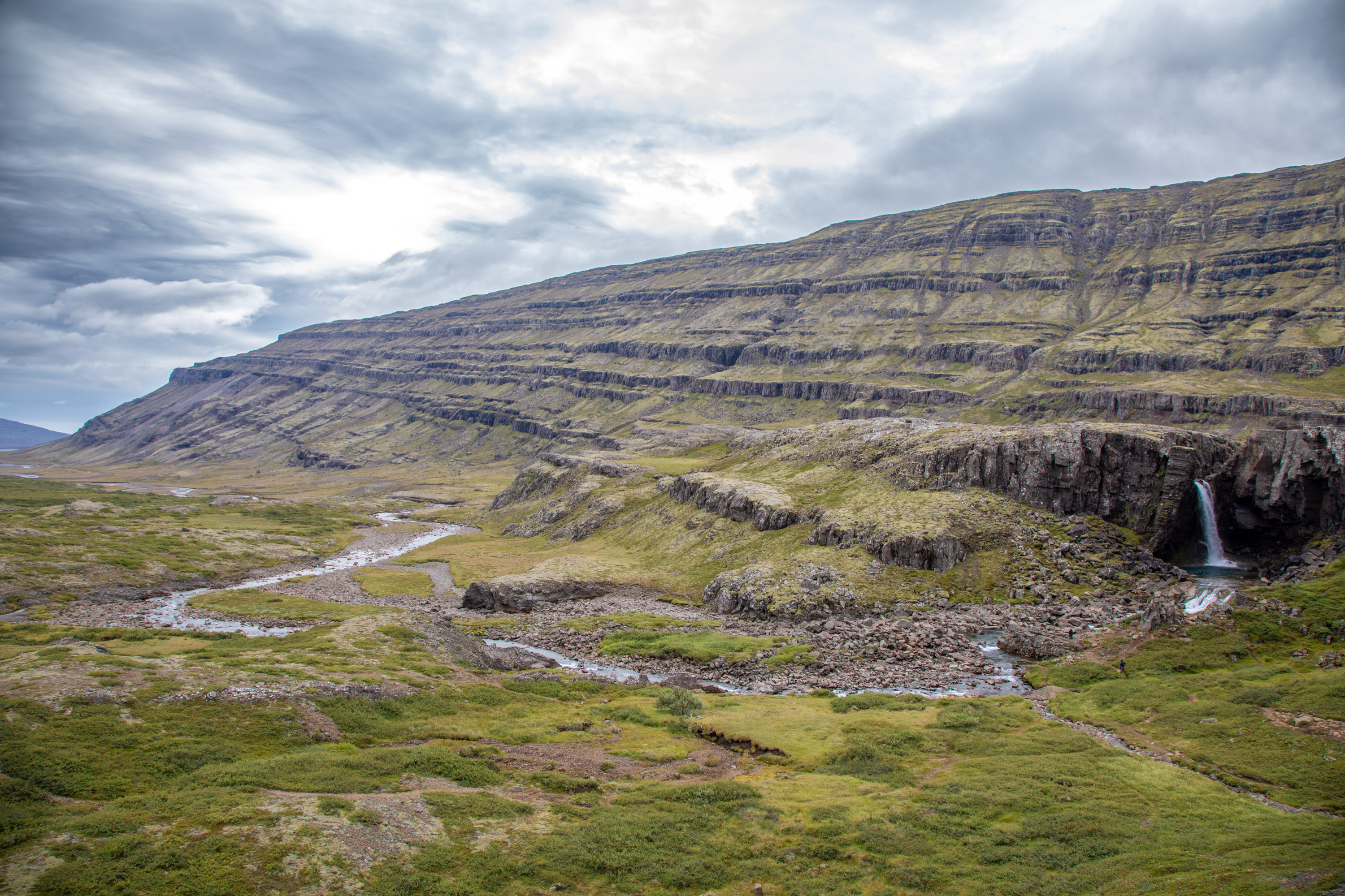 Il y a des chutes d’eau intéressantes pour faire une pause, comme la Cascade de Flögufoss qui attirent beaucoup de voitures sur son petit parking. Mais le vent est tellement fort que c’est insupportable de rester dehors sans mettre plusieurs couches de vêtements et la veste coupe vent.