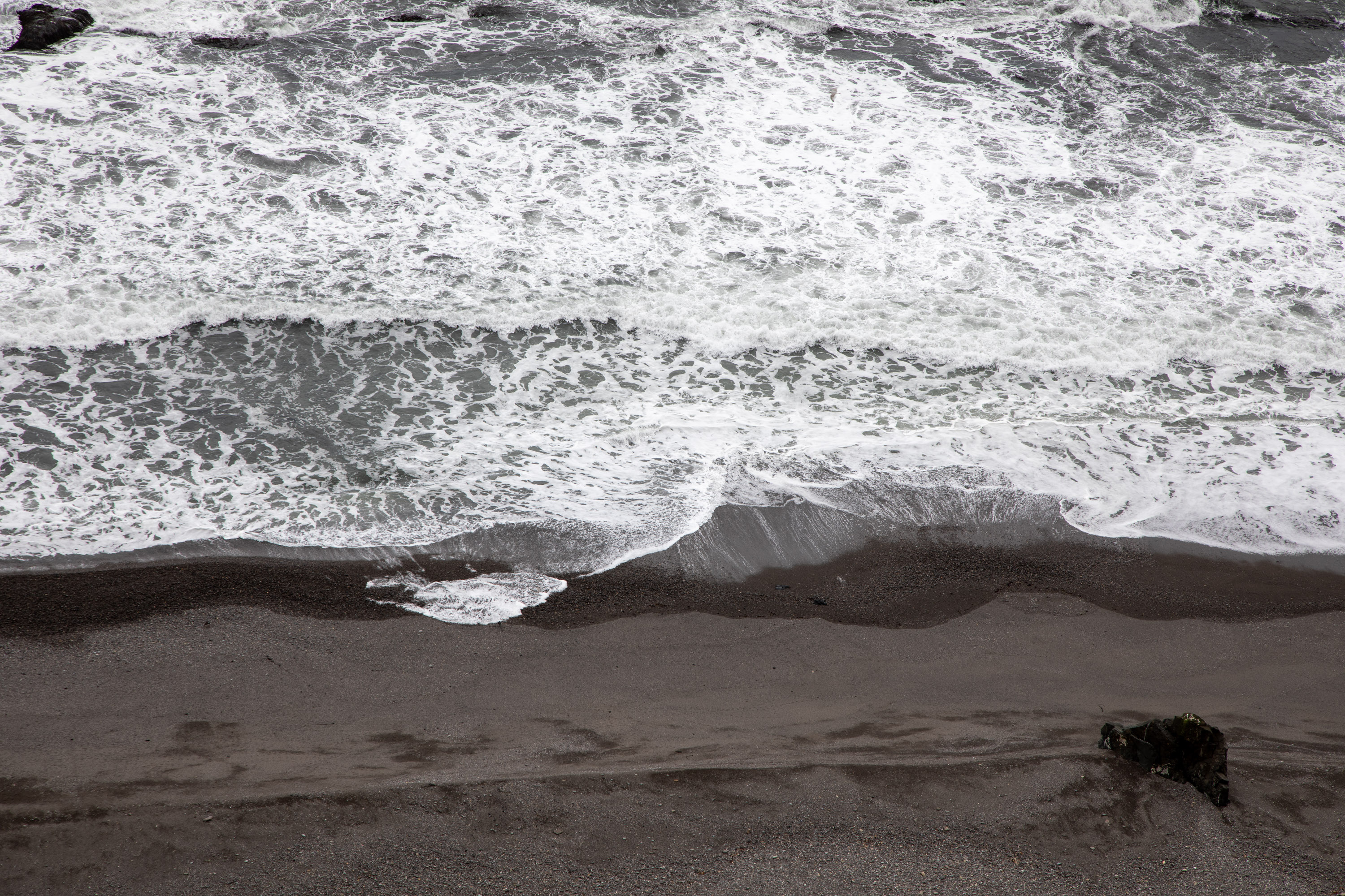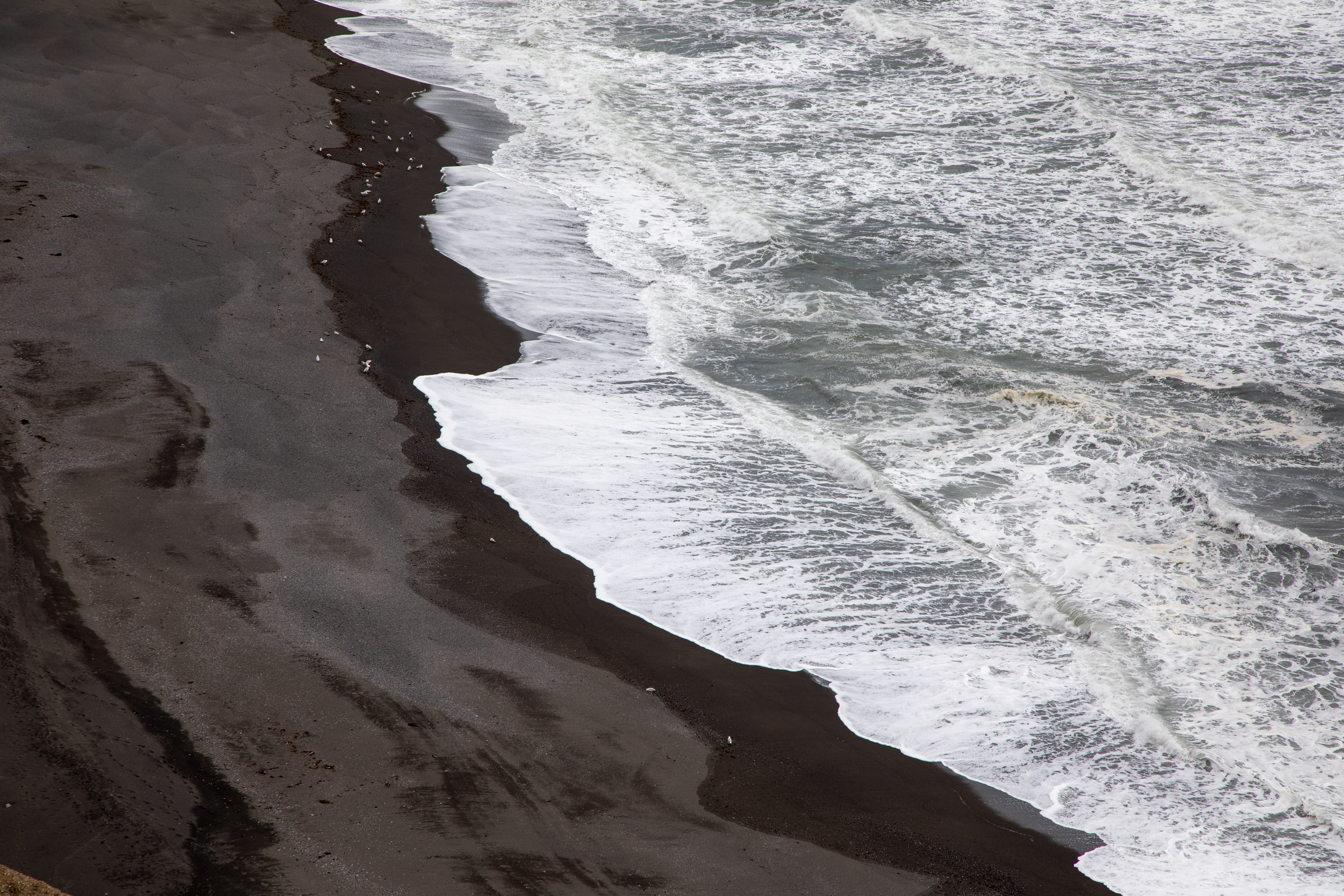 Les vagues sont furieuses en contrebas, l'air est froid, la plage est noire offrant un magnifique contraste avec l'écume.