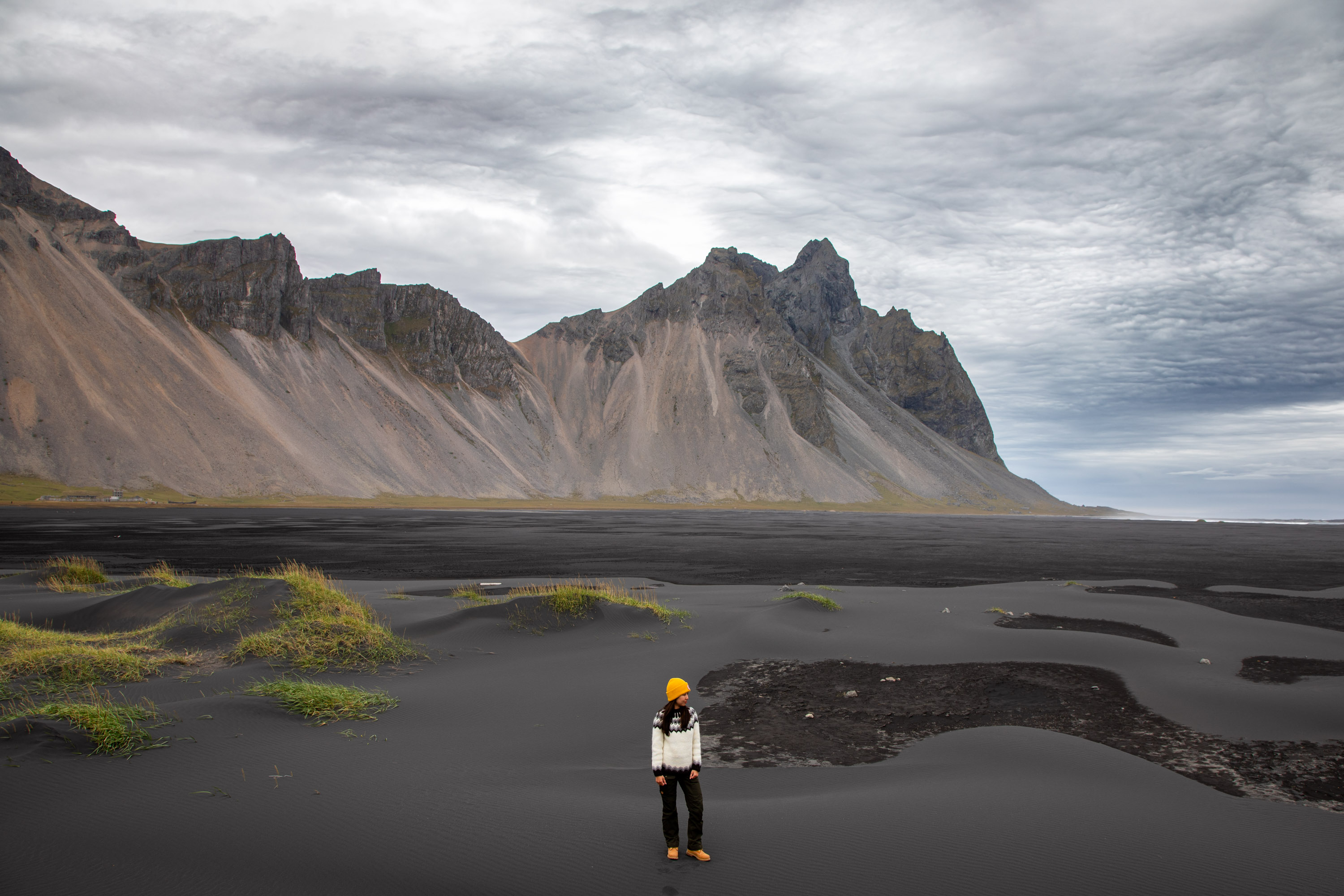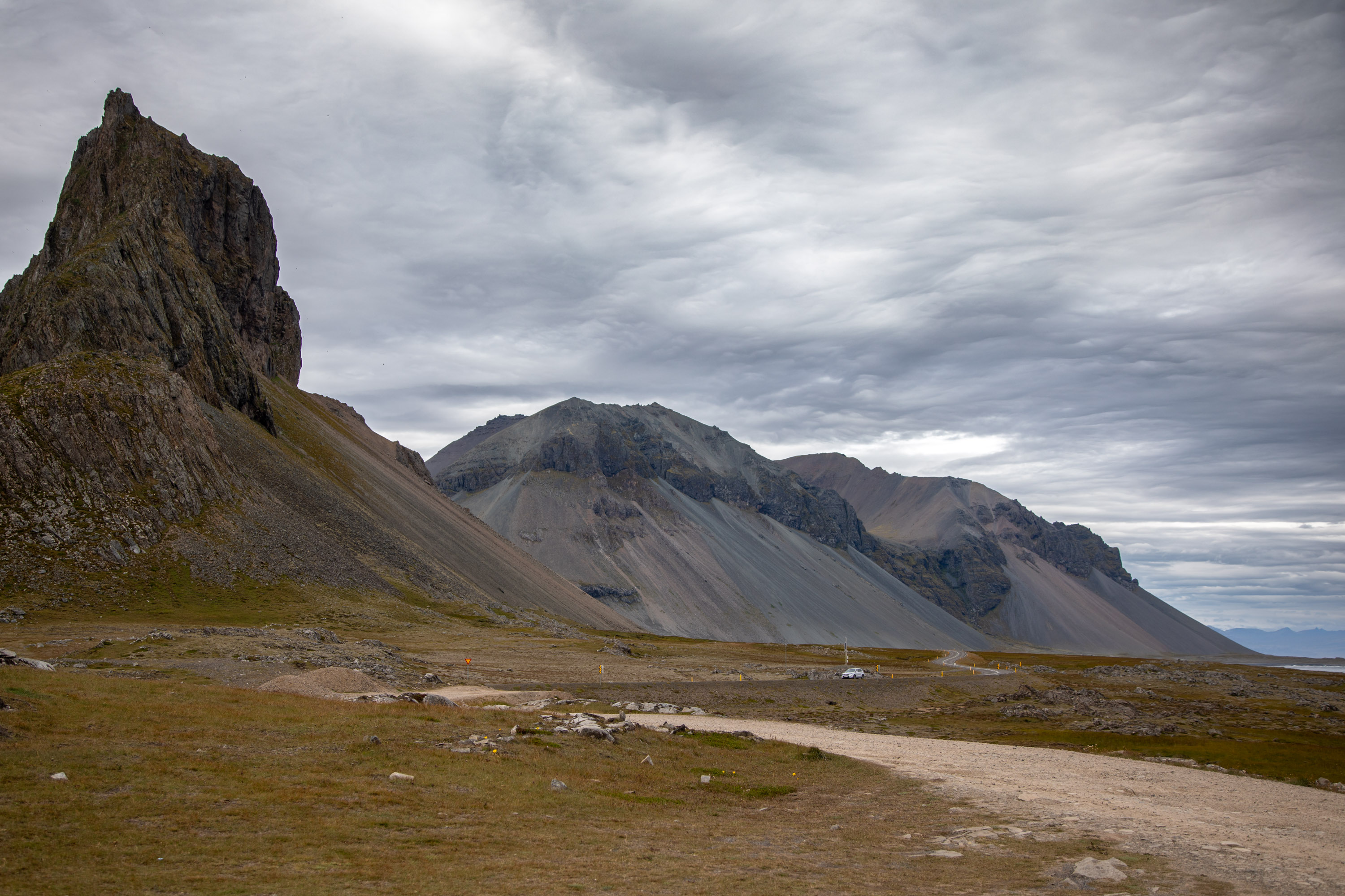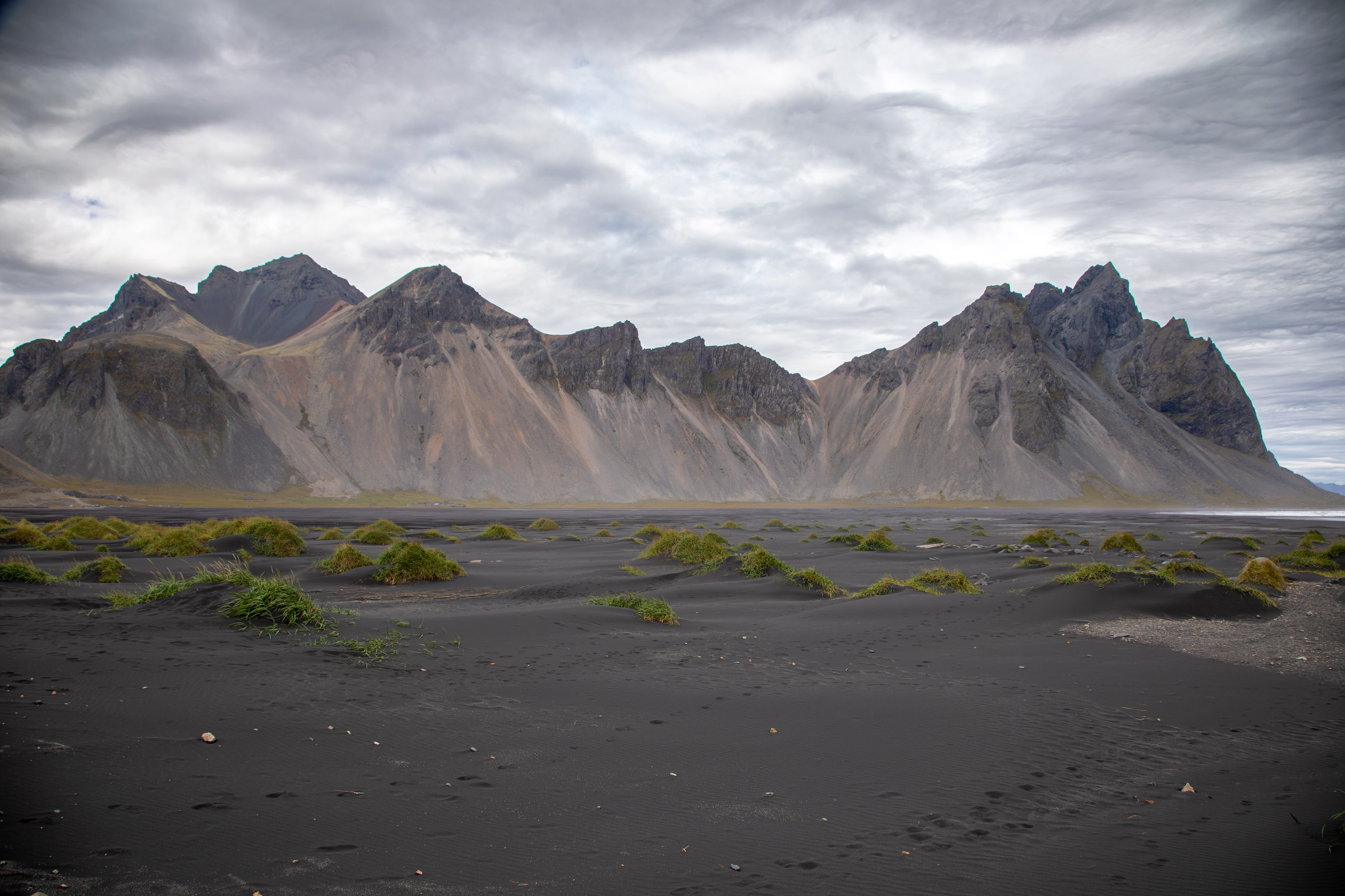 Il y a plusieurs endroits pour se garer et avoir un point de vue différent sur cette plage à la teinte sombre et surtout les montagnes en arrière plan qui sont si acérées. C’est vraiment un des endroits qui nous aura le plus impressionné de notre voyage, on attendait avec impatience de voir cela en vrai et cela vaut vraiment le ticket d’entrée. On gare la voiture et on marche dans les dunes jusqu’à la plage.