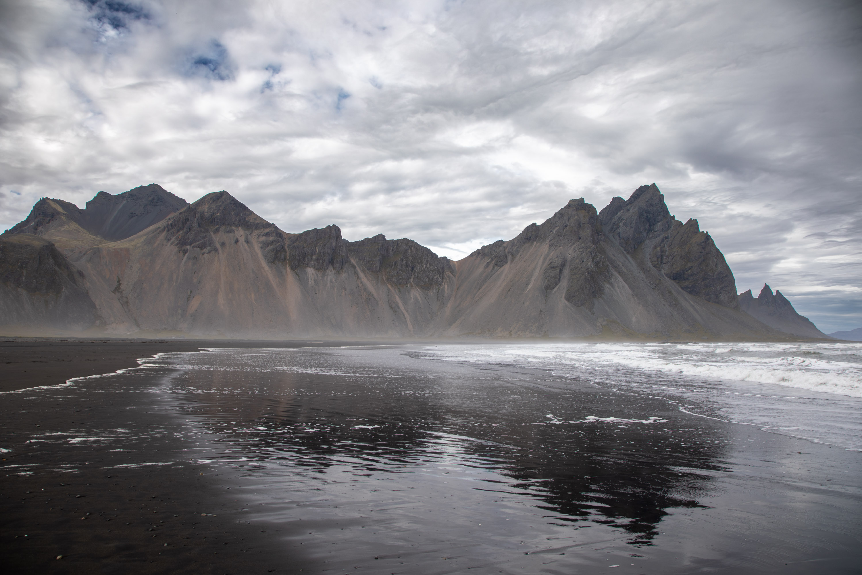 Les montagnes volcaniques sombres offrent un arrière plan incroyable à cette plage, c'est tout simplement un des plus beaux paysages que l'on verra pendant notre séjour en Islande.