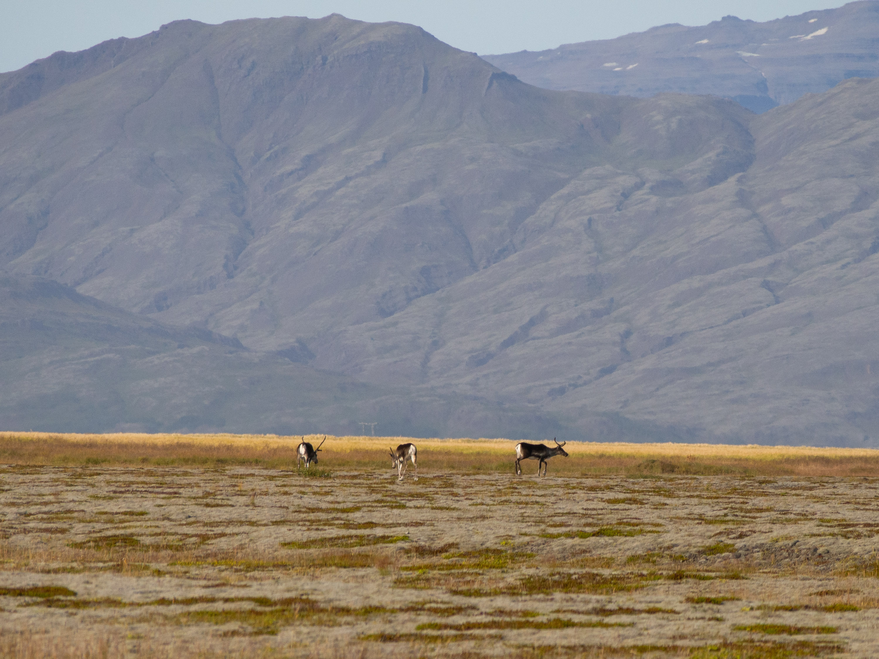 Après cette belle à Stokksnes, on n’a pas fini la journée. On rejoint maintenant le lagon de Jökulsárlón qui se trouve aux pieds des immenses glaciers qui recouvrent le Sud Est de l’Islande. On a beaucoup de chance car sur le bord de la route, on croise un troupeau de cerfs sauvages.