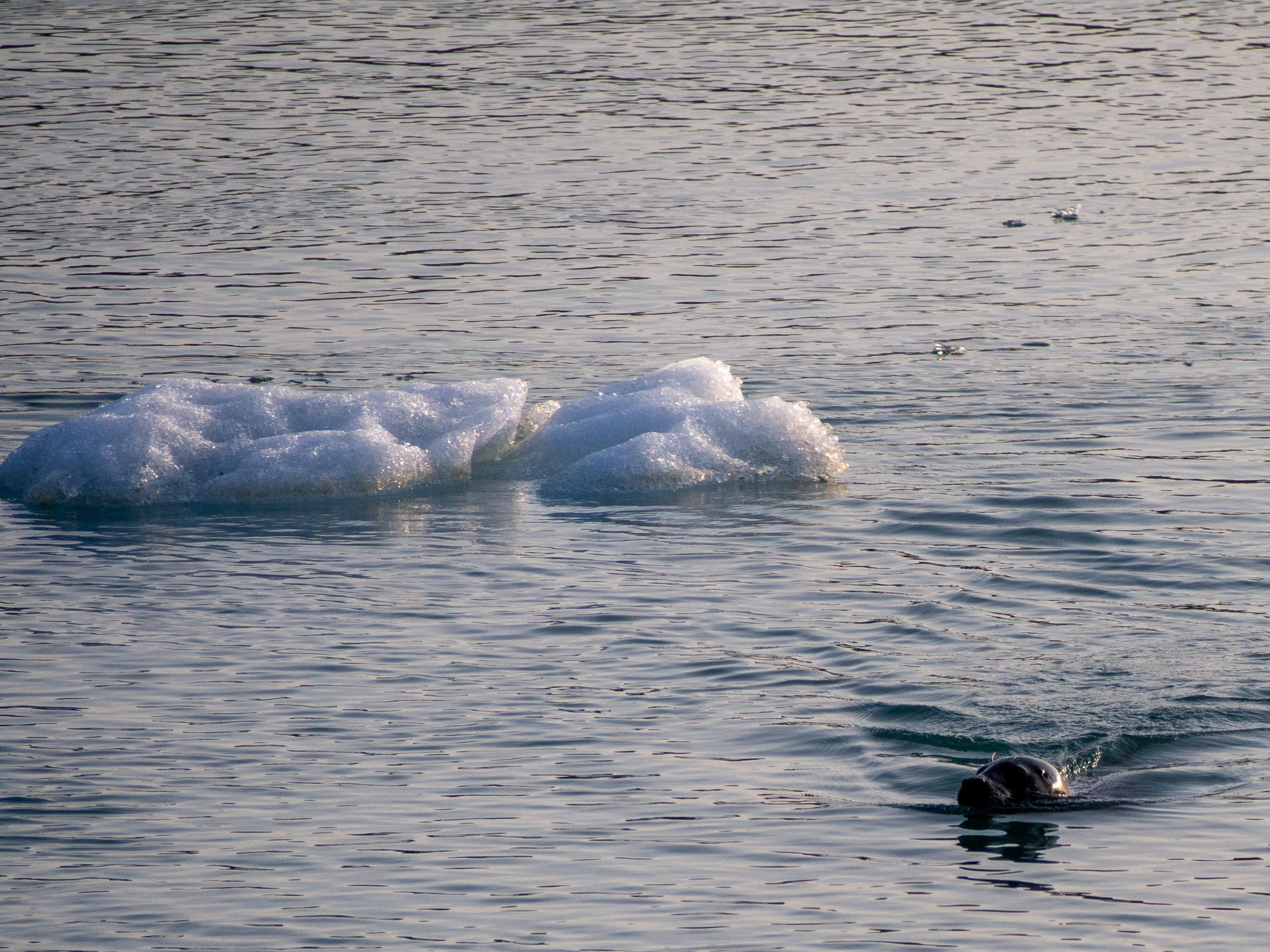 On peut apercevoir des phoques qui nagent dans l’eau glacée, on ne peut voir que le bout de leur tête.