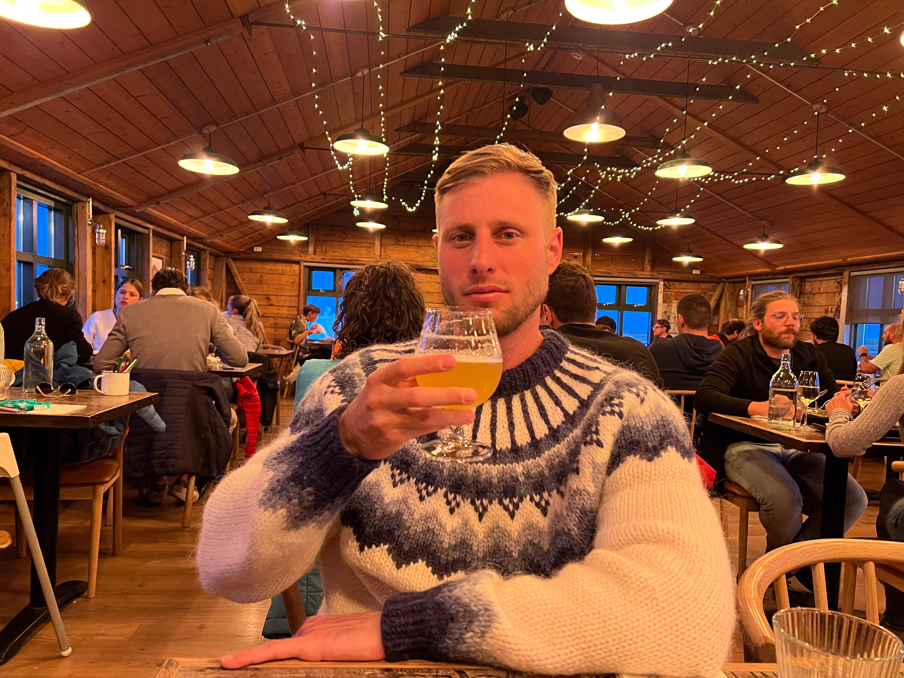 Après cette journée haute en couleur, on décide qu’il faut finir en apothéose. On se rend.à Hofn pour aller déguster la spécialité locale, le homard. Il faut attendre très longtemps d’avoir une table de disponible. On est installé dans la salle d'attente où l'on peut commander un verre pour célébrer cette journée.