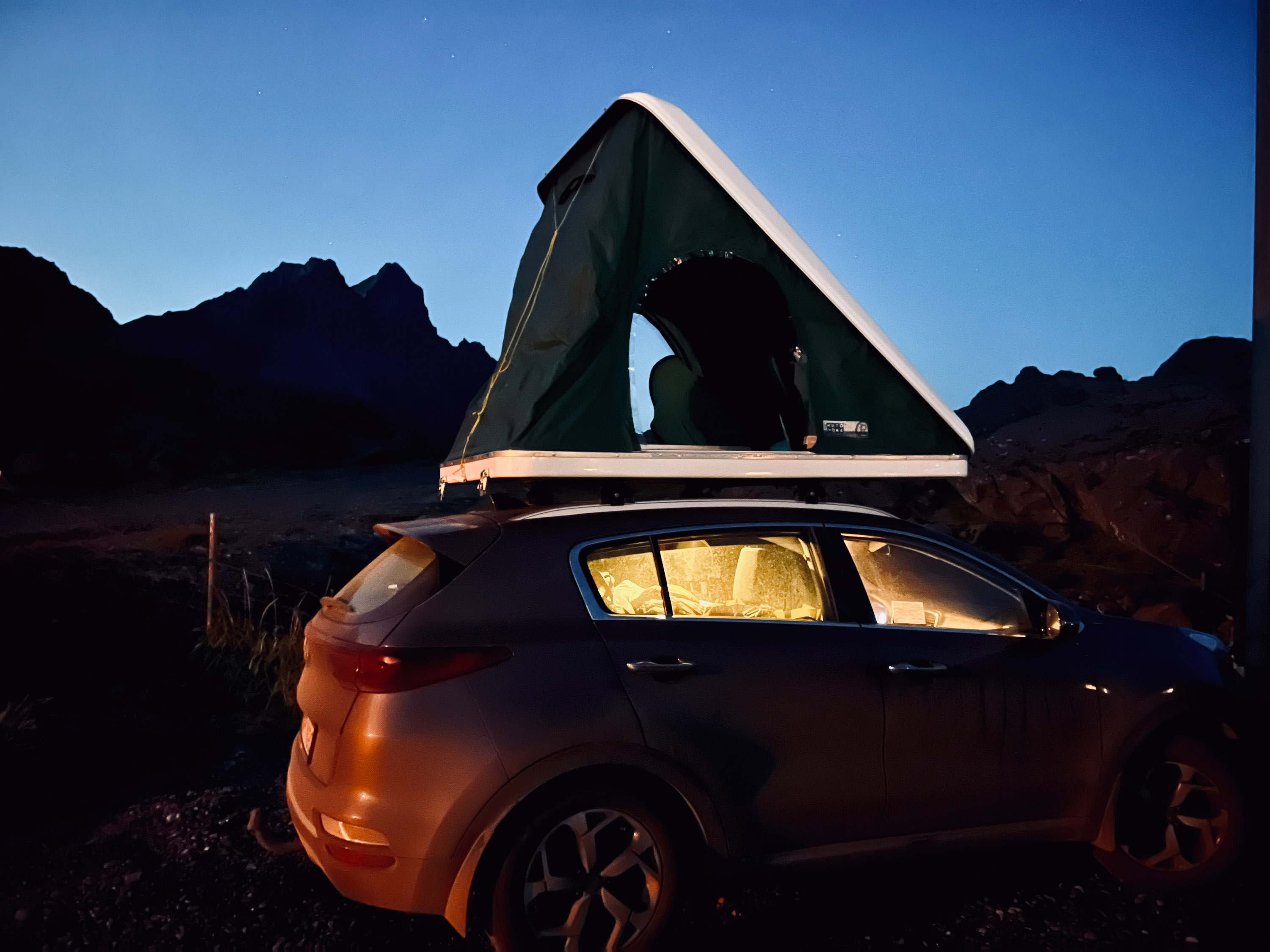 On sort du restaurant et on n’a toujours pas trouvé d’endroit pour dormir le soir. Il est 22h30. En fait, ce coin d’Islande est vraiment hors de prix pour des logements de piètre qualité. Bien sur, les hébergements au meilleur rapport qualité prix sont déjà tous réservés et on ne veut pas dépenser 250 euro pour une chambre mal notée sur booking. Finalement, on se dit que il y a bien un jour où l’on peut essayer notre toit sur le toit c’est bien ce soir. Il ne fait pas trop frais, et il n’y a pas de vent. Donc c’est finalement idéal. Le camping de Hofn ne donne pas vraiment envie, il y a pleins de voitures et tout le monde est serré à l’entrée de la ville en bord de route. On se dit que pourquoi pas retourner à Stokkness, la plage au sable noir. On s’installe sur le parking devant le viking café, c’est presque plein mais on arrive quand même à trouver une place. C’est toute une organisation pour ouvrir la tente, installer l’échelle, faire le lit. Les sanitaires sont propres et on se couche finalement à minuit. Il fait quand même un peu frais, on est obligé de mettre un bonnet de dormir avec un pull quand même.