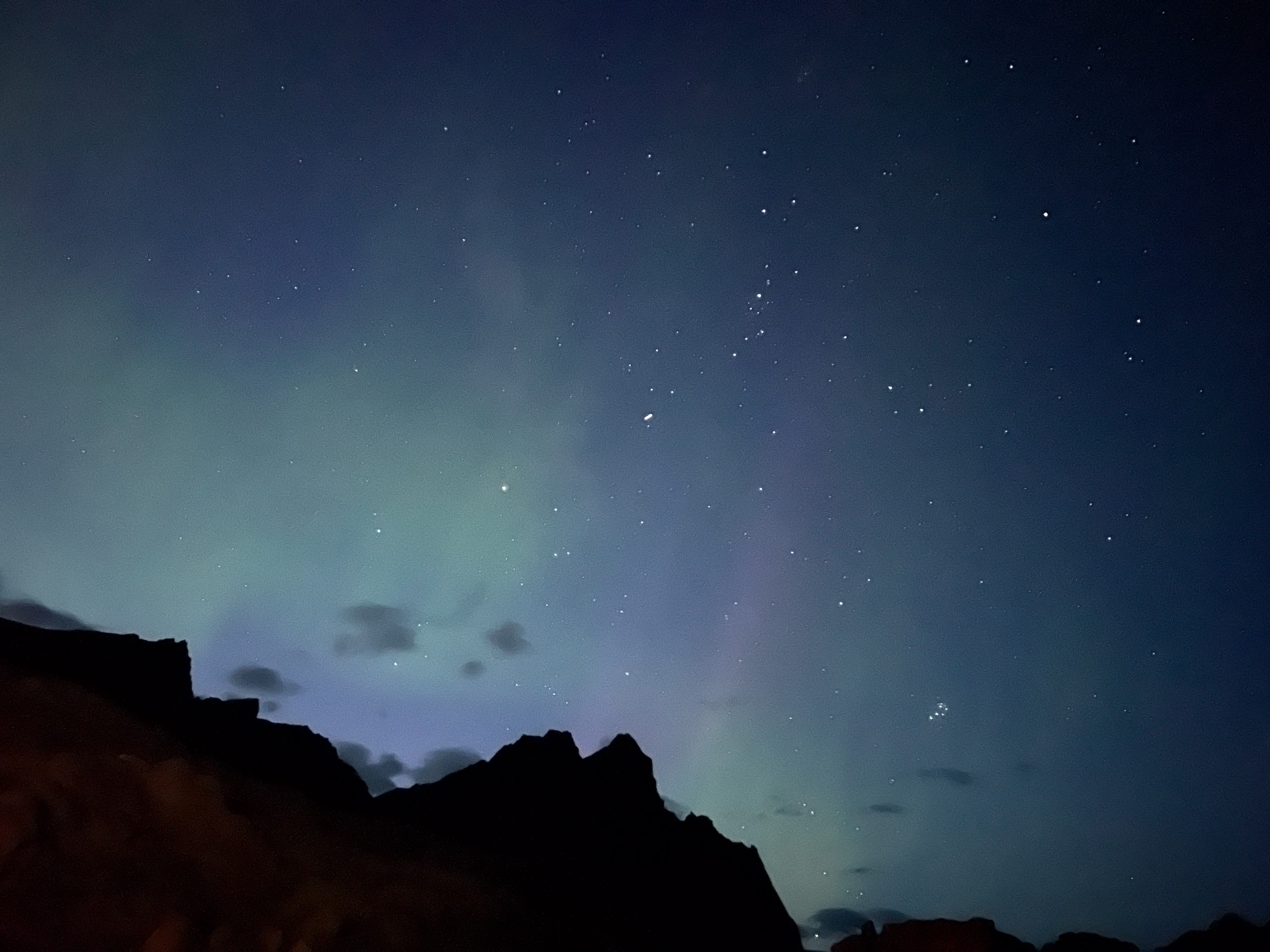 On ouvre la tente pour capter notre première aurore boréale de notre vie, elle est très faible, mais l’appareil photo de l’iPhone arrive à mieux la capter que l’oeil. Quelle soirée mémorable !!!