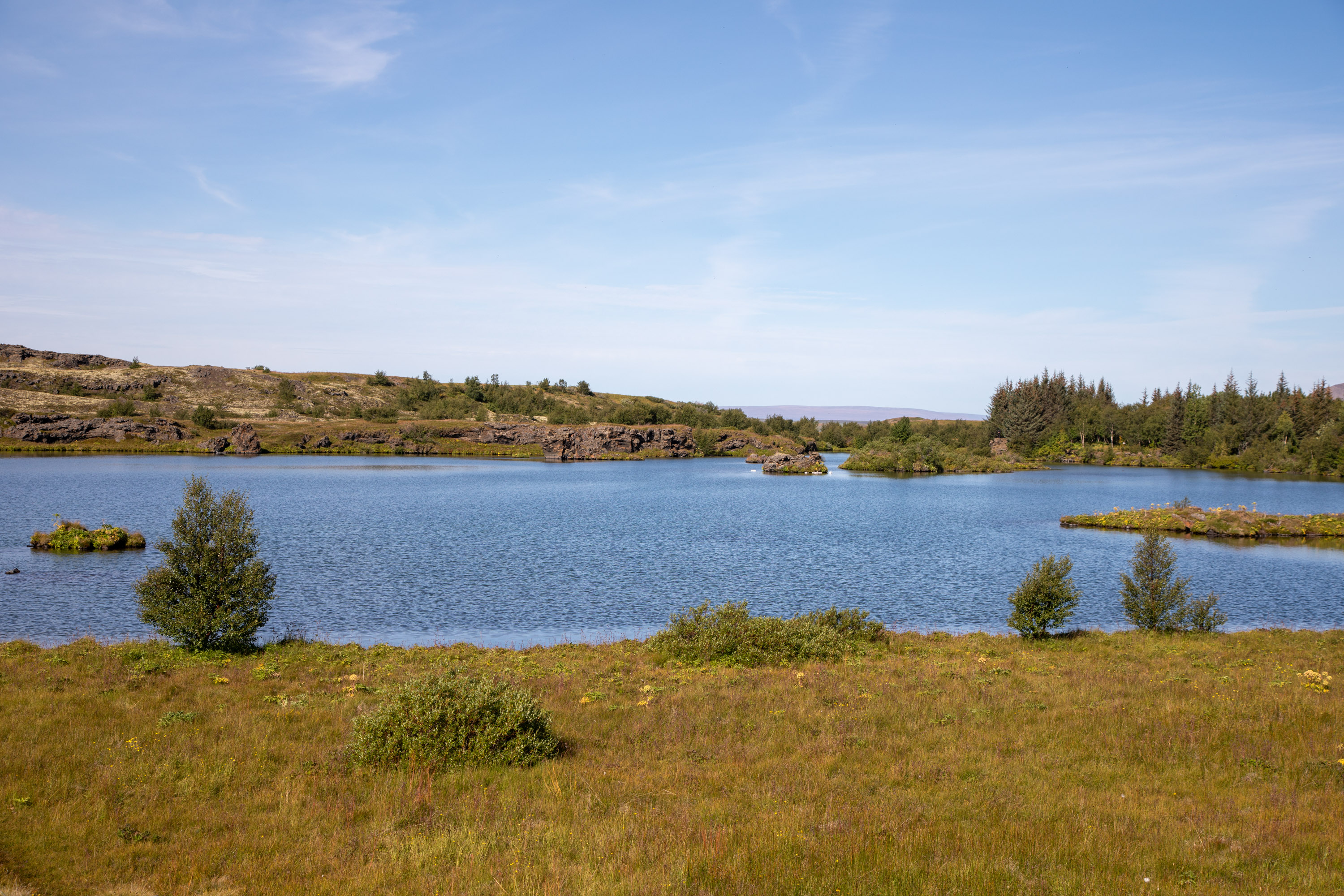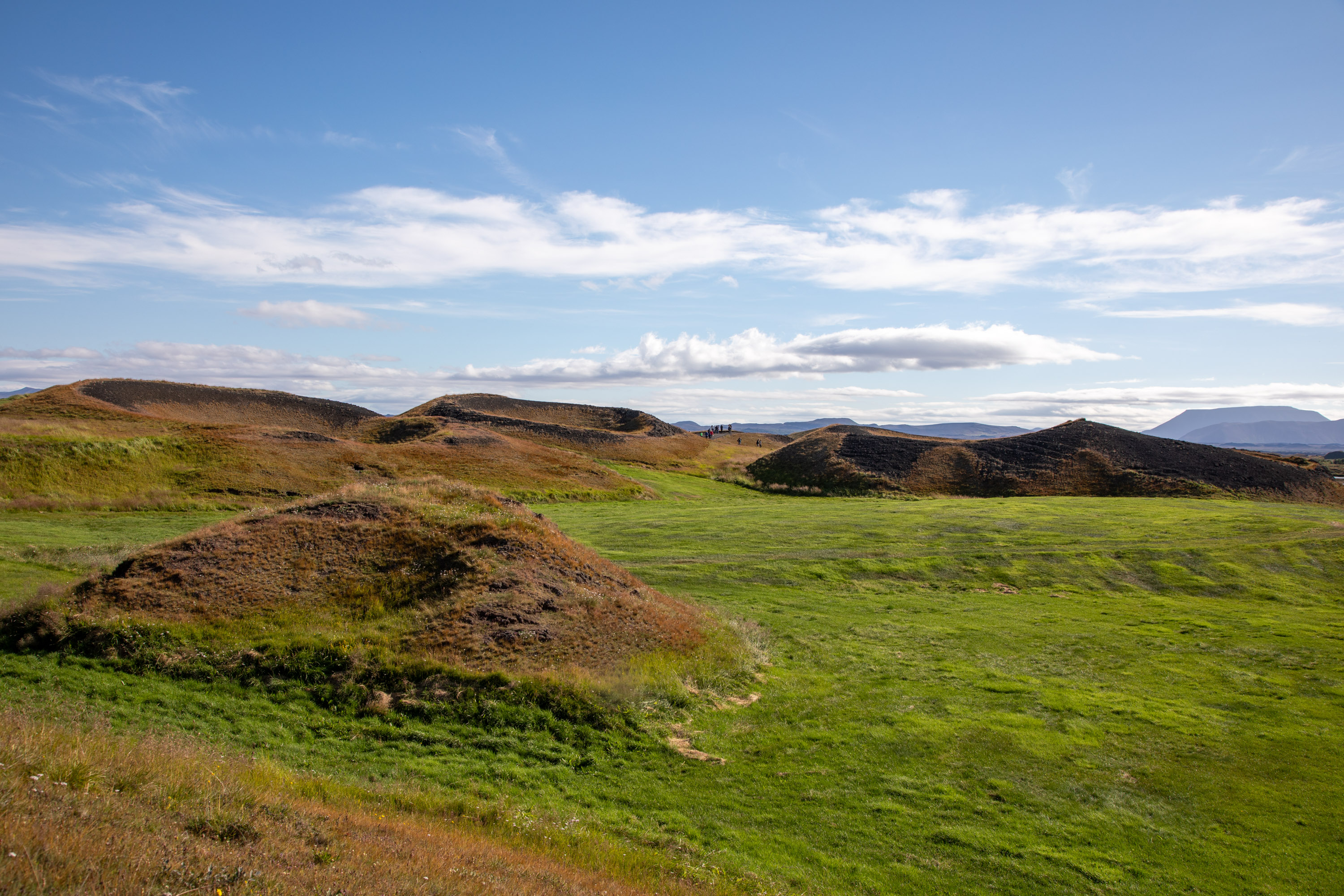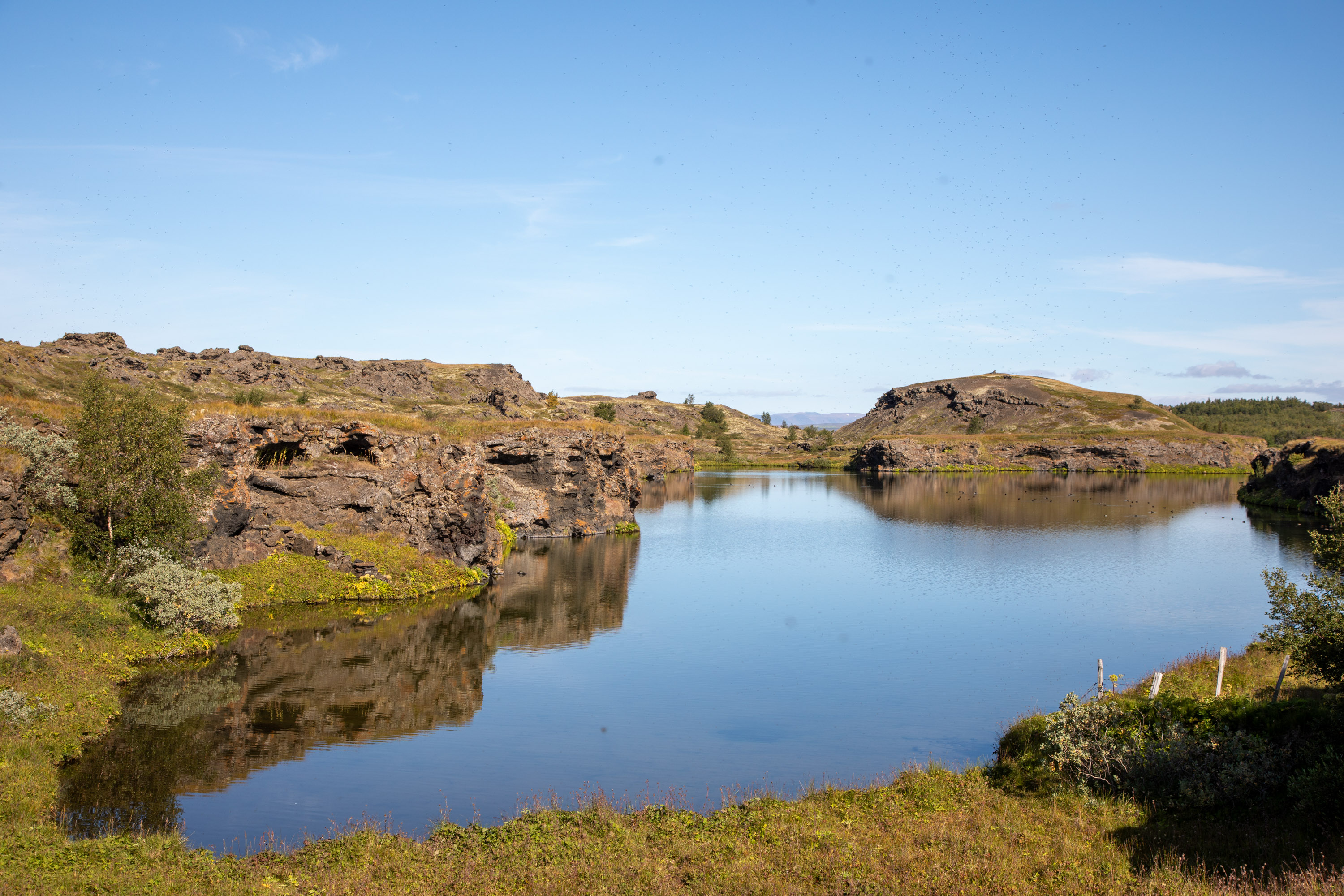 On démarre la journée par la découverte du fameux lac de Myvatn. On longe la grande étendue d’eau jusqu’au parking au sentier qui permet de marcher au plus près des volcans éteints. La région est très verte, comme d’autres en Islande et pourtant on a l’impression de n’avoir rien vu de comparable avec le reste du séjour. C’est comme si on avait ramené les paysages du Massif Central français pour les poser au milieu de ce lac, après toutes ces heures à rouler sur des routes à la nature hostile, la nature semble s’épanouir autour de Myvatn, avec de belles fermes qui se sont installées sur cette terre.