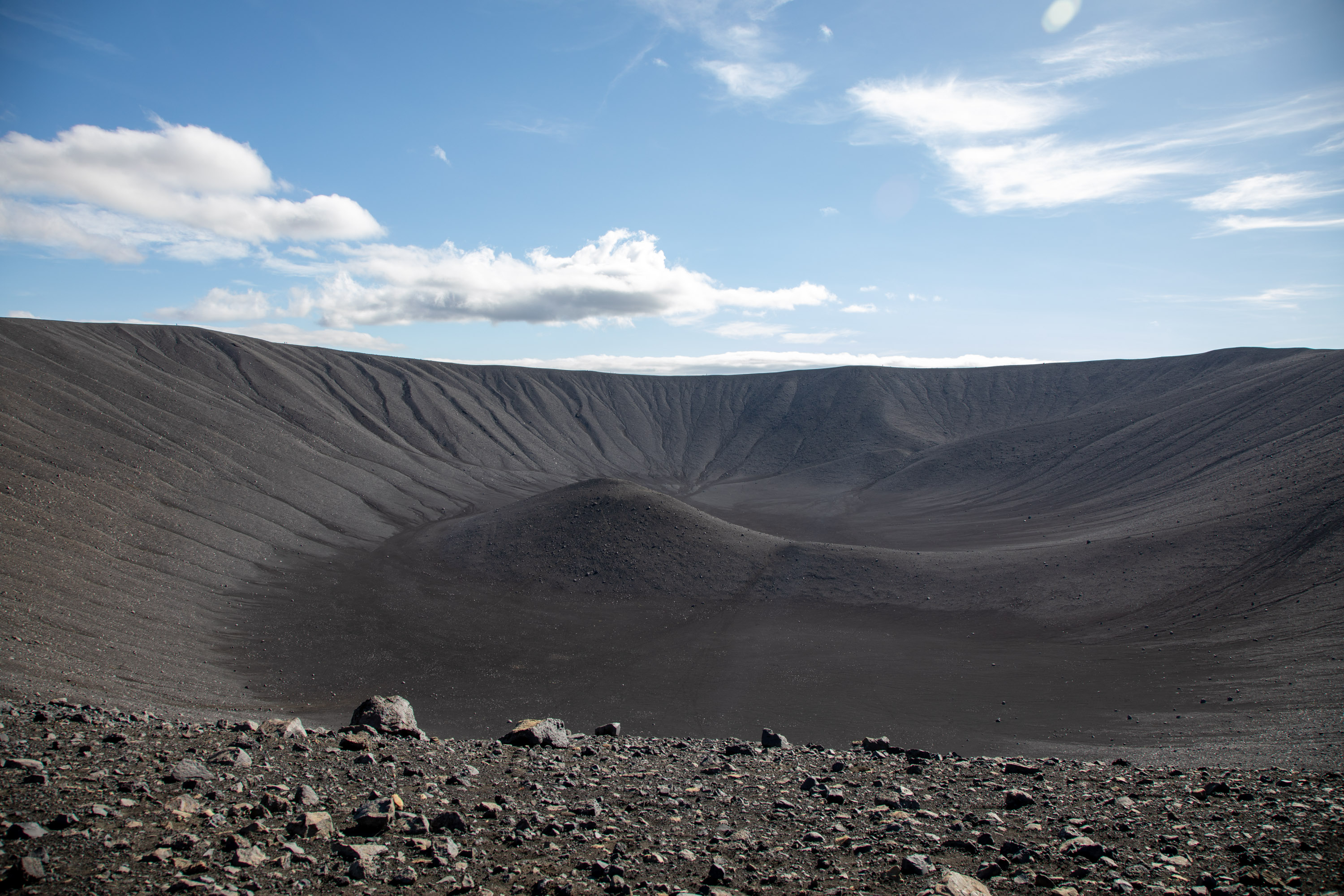 Depuis la route du bord du lac, on ne peut pas rater la silhouette d'un imposant volcan domine l’horizon, c’est l’immense volcan de Hverfjall. Sa forme est parfait, comme si on demandait à un enfant de dessiner un volcan, c’est probablement à cela que cela qu’il ressemblerait. On se gare sur le parking payant du site et on s’équipe car il souffle un vent incroyable ici, alors qu’à quelques kilomètres de là à Myvatn on n’avait pas brise… La montée est raide, dans du sable noir on est dans la poussière soulevée par le vent et ce n’est pas très agréable, mais là vue est grandiose.