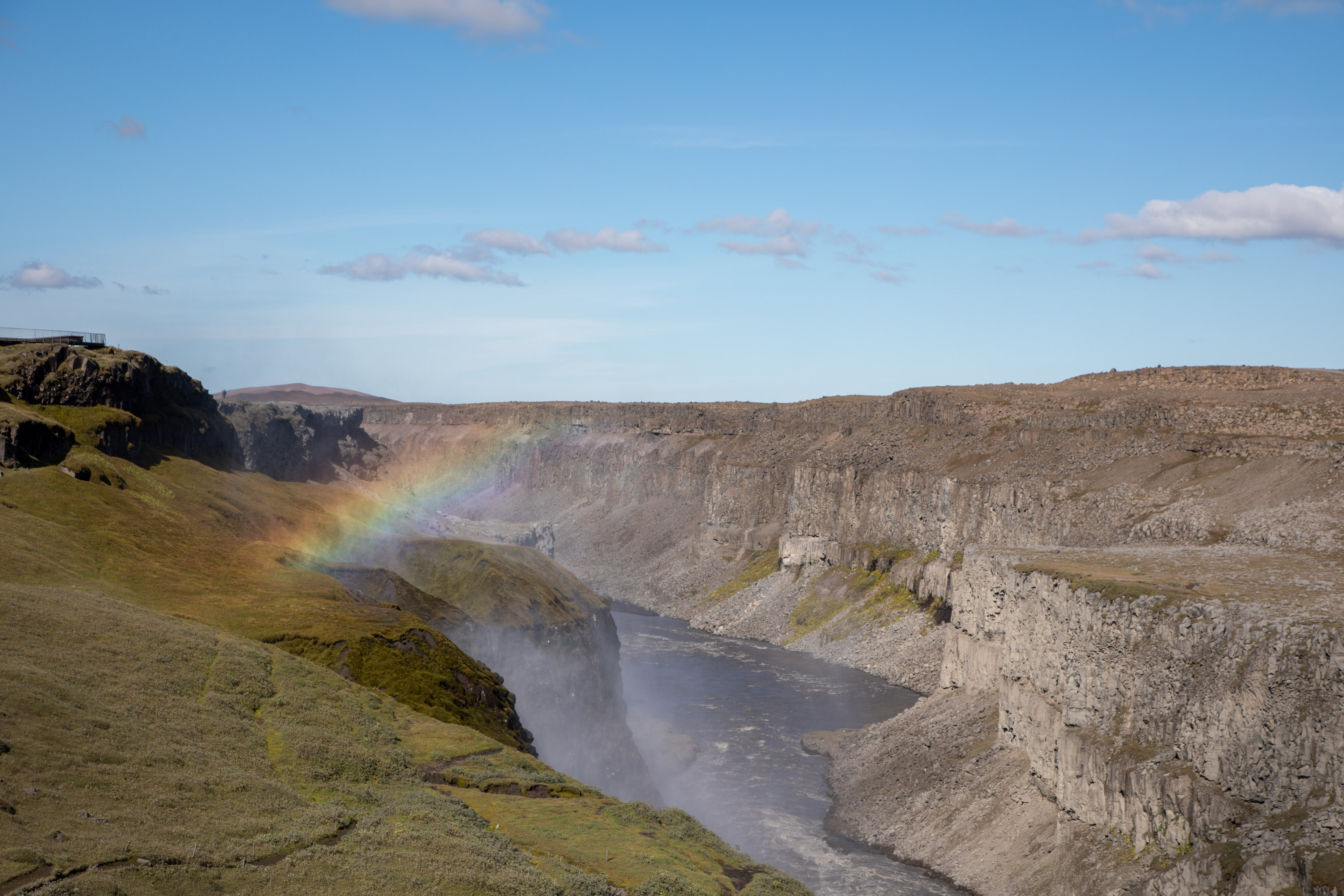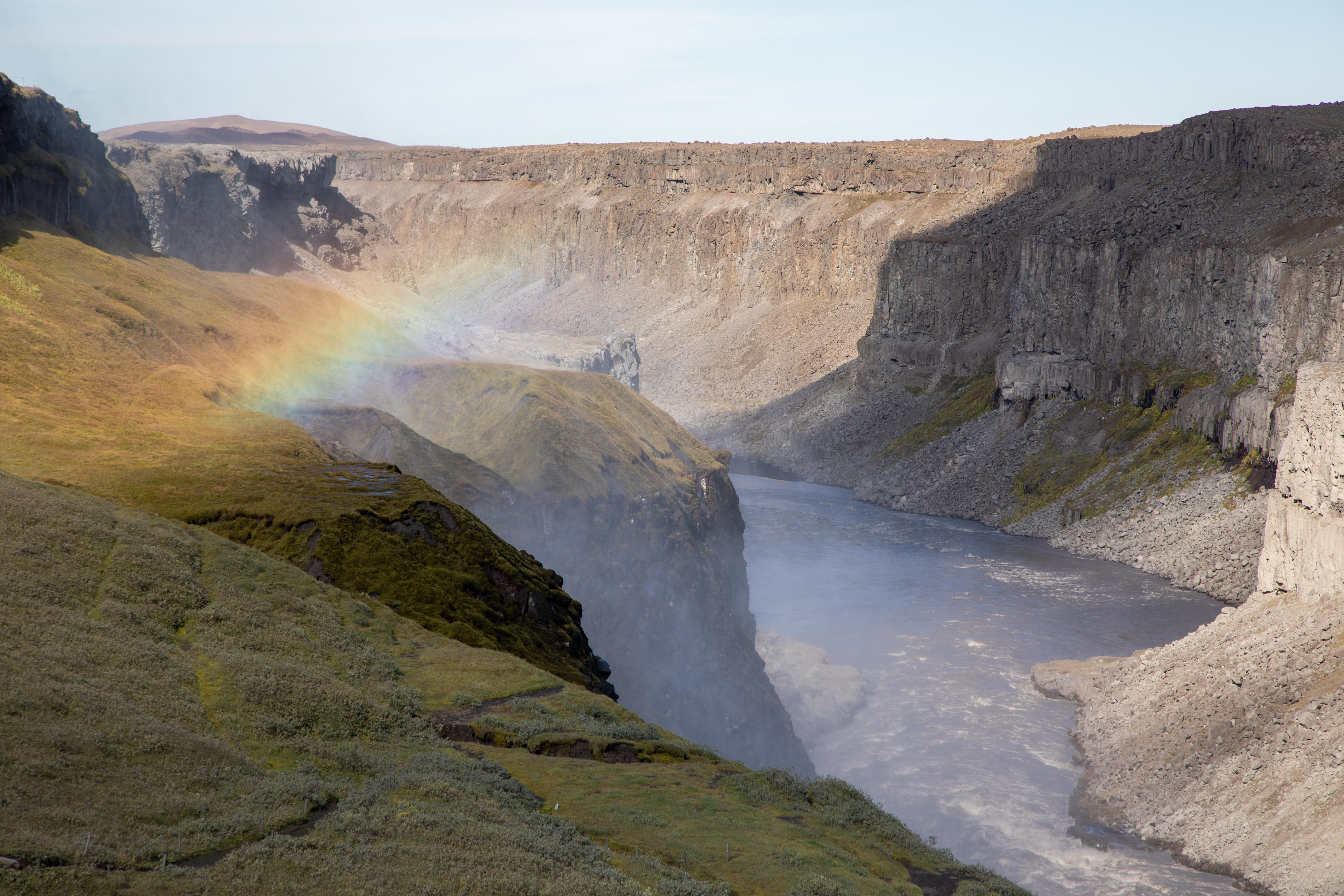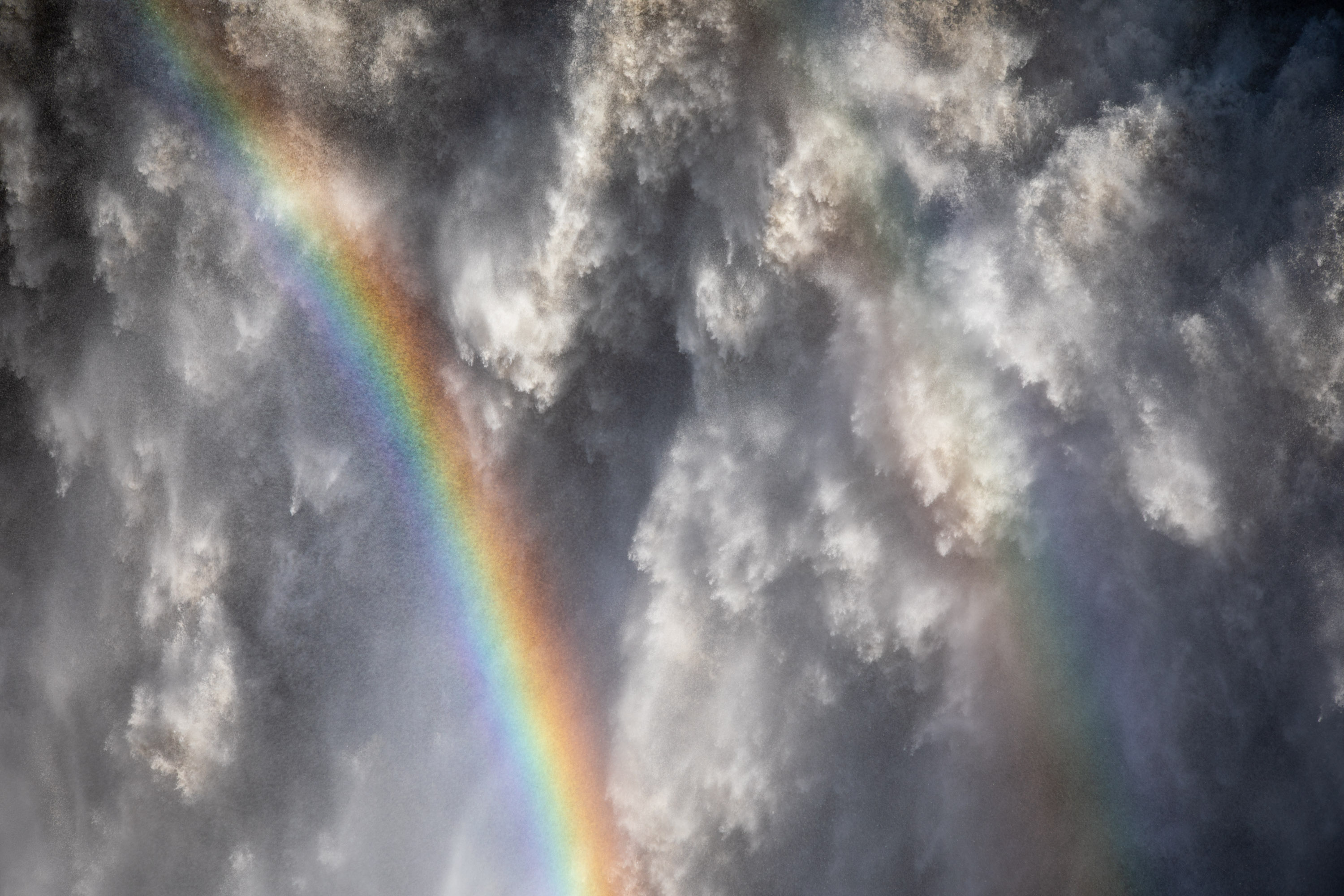 Puis on arrive à un point de vue qui domine la grande cascade, l’eau s’écrase avec fracas dans la crevasse et les nuées créent même un arc-en-ciel.