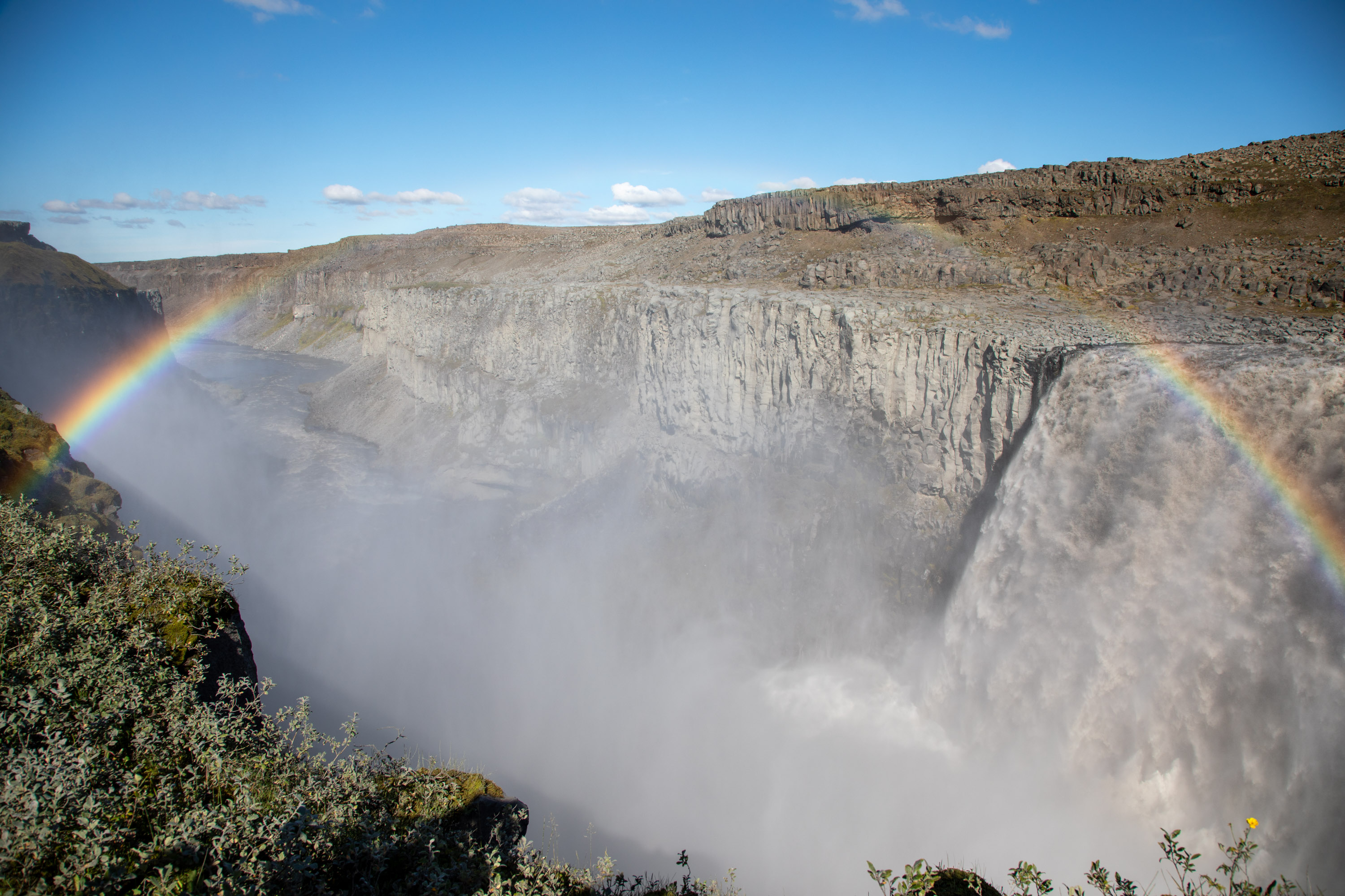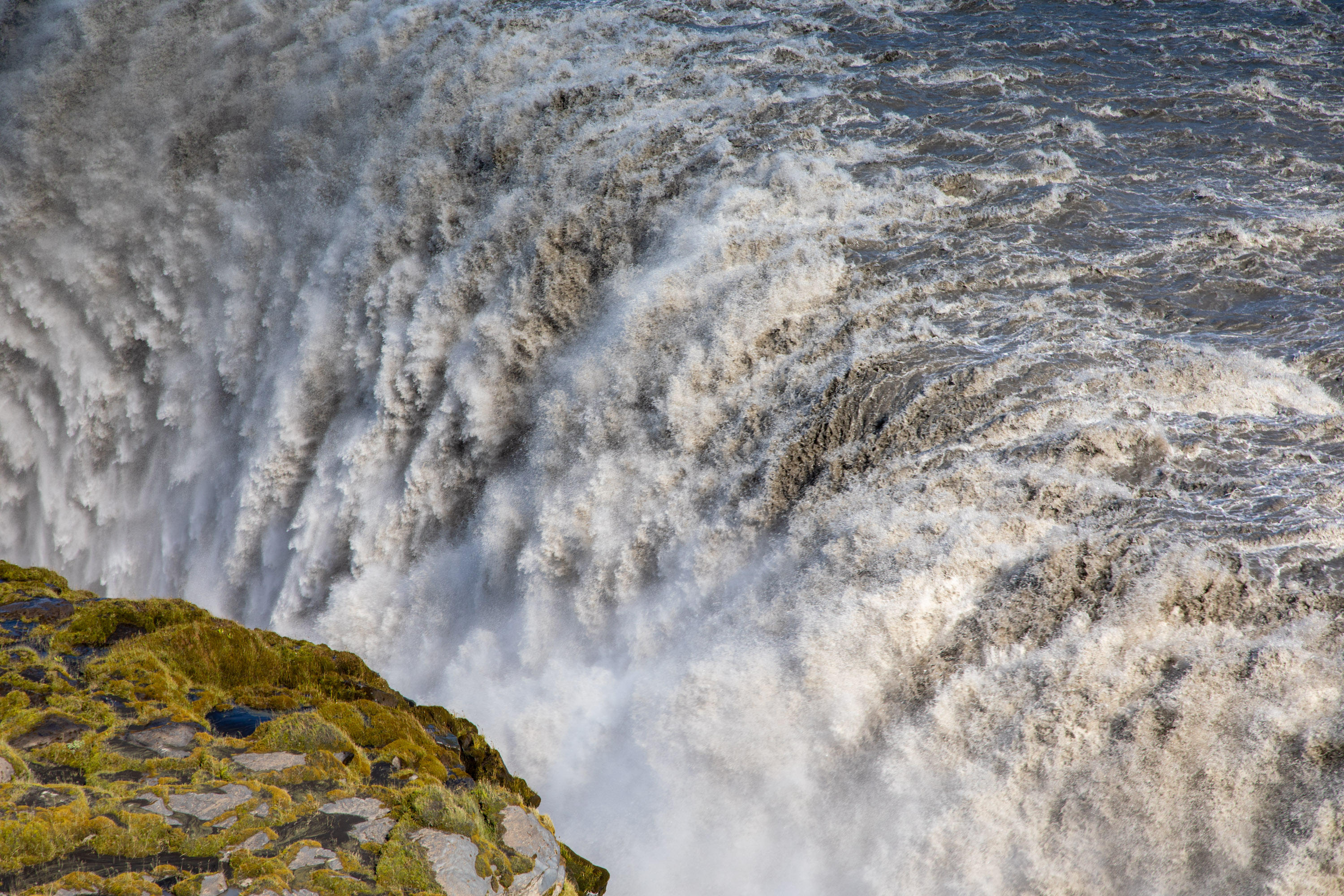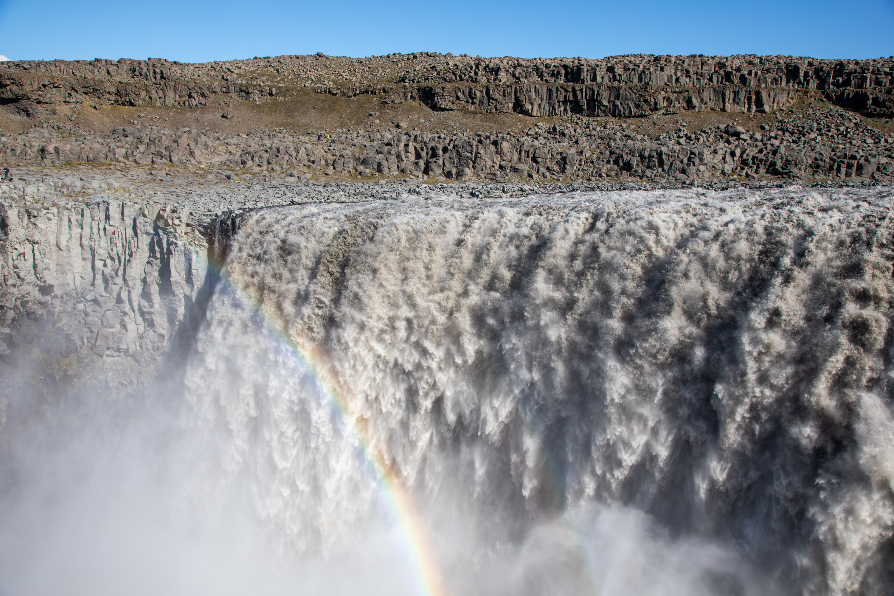 C’est le moment de quitter la région de Myvatn. On se dit que pour les voyageurs qui n’ont pas de 4x4 et qui restent sur l’itinéraire classique de la route n°1, c’est l’endroit idéal pour avoir un aperçu des splendeurs de la nature islandaise. Dans ce cas il faut au moins y rester deux nuits. Notre prochaine étape sur la route en direction de l’Est du pays va nous amener à la plus puissante cascade d’Europe, celle de Detifoss. Il faut marcher une dizaine de minutes depuis ke parking pour arriver au bord de la cascade, on marche dans un paysage de roche volcanique étonnantes qui semblent ressembler à de gros tubes verticaux qui ont été rabotés.